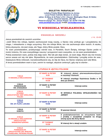Nr 17 2016(235) /1 MAJA/ROK VI BIULETYN PARAFIALNY Lokalna Polska Misja Katolicka na Jersey Local Polish Catholic Mission in Jersey adres: St Mary & St Peter’s R.C. Church, Wellington Road, St Helier, Jersey, Channel Islands, JE2 4RJ Priest-in-charge: Ks. Janusz Kopeć tel. 07797 778 786; www.parafiajersey.org.uk; e-mail: [email protected] VI NIEDZIELA WIELKANOCNA EWANGELIA NIEDZIELI J 14, 23-29 Jezus powiedział do swoich uczniów: «Jeśli Mnie kto miłuje, będzie zachowywał moją naukę, a Ojciec mój umiłuje go i przyjdziemy do niego, i mieszkanie u niego uczynimy. Kto nie miłuje Mnie, ten nie zachowuje słów moich. A nauka, którą słyszycie, nie jest moja, ale Tego, który Mnie posłał, Ojca. To wam powiedziałem, przebywając wśród was. A Paraklet, Duch Święty, którego Ojciec pośle w moim imieniu, On was wszystkiego nauczy i przypomni wam wszystko, co Ja wam powiedziałem. Pokój zostawiam wam, pokój mój daję wam. Nie tak jak daje świat, Ja wam daję. Niech się nie trwoży serce wasze ani się nie lęka. Słyszeliście, że wam powiedziałem: Odchodzę i przyjdę znów do was. Gdybyście Mnie miłowali, rozradowalibyście się, że idę do Ojca, bo Ojciec większy jest ode Mnie. A teraz powiedziałem wam o tym, zanim to nastąpi, abyście uwierzyli, gdy się to stanie». LITURGIA W JĘZYKU POLSKIM ST MARY & PETER’ 9:00 W intencji dzieci pierwszokomunijnych w rocznicę I Komunii. ST THOMAS’ 19:30 W intencji zmarłego Kazimierza Dudka w 30 dniu po śmierci. 2 MAJA PONIEDZIAŁEK ŚW. ATANAZEGO ST MARY & PETER’ 7:15 Intencja wolna 3 MAJA WTOREK UROCZYSTOŚĆ NMP KRÓLOWEJ POLSKI ST MARY & PETER’ 19:00 W INTENCJI POLSKIEJ SPOŁECZNOŚCI NA JERSEY 6 MAJA PIATEK ŚW. AP. FILIPA I JAKUBA ST MARY & PETER’ 19:00 Intencja wolna 7 MAJA SOBOTA ST MARY & PETER’ 7:15 W pewnej intencji. ST MARY & PETER’ 9:00 Z podziękowaniem za otrzymane łaski z prośbą o szczęśliwe przejście na drugą stronę życia dla Anny Baran 1 MAJA VI NIEDZIELA WIELKANOCNA 8 MAJA VII NIEDZIELA WIELKANOCNA UROCZYSTOŚĆ WNIEBOWSTĄPIENIA 9 MAJA PONIEDZIAŁEK UROCZYSTOŚĆ ŚW. BISKUPA STANISŁAWA, PATRONA POLSKI ST THOMAS’ 19:30 ST MARY & PETER’ 7:15 W intencji Ani z okazji urodzin. Intencja wolna INFORMACJE Nr 17 2016(235) /1 MAJA/ROK VI Zapraszam na Mszę św. we wtorek, Uroczystość NMP Królowej Polski, która będzie odprawiona w intencji polskiej społeczności na Jersey w szczególności za tych wszystkich, którzy czynnie angażują się w jej budowanie. W następną niedzielę będziemy obchodzić uroczystość Wniebowstąpienia Pańskiego. W piątek, 6 maja, rozpoczyna się Nowenna przed Zesłaniem Ducha Świętego. Jest to okres bezpośredniego przygotowania na przyjęcie darów Ducha Świętego. W tym tygodniu także pierwszy czwartek, pierwszy piątek i pierwsza sobota miesiąca. W piątek Msza św. o 19:00. Okazja do spowiedzi pół godziny przed Mszą i po Mszy św. podczas adoracji. W niedzielę, 15 maja grupa dzieci przystąpi do I Komunii św. Uroczystość będzie miała miejsce w Sacred Heart w St Aubin o godzinie 11:00. Pamiętajmy o dzieciach o i ich rodzicach w naszych modlitwach. SAKRAMENTY LITURGIA MSZY ŚWIĘTEJ W JĘZYKU POLSKIM WEDŁUG PODANEGO NA PIERWSZEJ STRONIE PORZĄDKU. CHRZEST Proszę o osobisty kontakt co najmniej miesiąc przed planowanym chrztem. Podczas spotkania będzie wręczona aplikacja oraz ustalony termin katechezy chrzcielnej i samego chrztu. SPOWIEDŹ Okazja do spowiedzi: w niedzielę 15 minut przed Mszą św. w piątek: 18.45 i po Mszy podczas adoracji lub przez indywidualne umówienie. MAŁŻEŃSTWO Narzeczeni, którzy mieszkają na Jersey ponad 6 miesięcy, należą do parafii Polskiej Misji Katolickiej i pragną zawrzeć sakramentalny związek małżeński powinni skontaktować się ze swoim duszpasterzem ok. 6 miesięcy przed planowaną datą ślubu w celu rozpoczęcia procedur. Najbliższy kurs przedmałżeński odbędzie się 23 i 24 maja o godz. 19:00 w St Mary & Peter’ Church. BIERZMOWANIE Kolejne spotkanie w ramach przygotowania dorosłych do bierzmowania odbędzie się 25 kwietnia, w poniedziałek o godz. 19.15 w St Mary & Peter’ Church. SPOTKANIA MODLITEWNE I GRUPY APOSTOLSKIE MODLITWA RÓŻAŃCOWA Środa, godz. 20:00, St Mary & Peter’. RÓŻA RÓŻAŃCOWA Zainteresowanych włączeniem się do Róż Różańcowych proszę o osobisty kontakt. Zmiana Róży w każdą I niedzielę miesiąca po Mszy św. wieczornej (o 19:30). GRUPA MODLITEWNA Spotkanie we wtorek, 10 maja o 20:00 w St Mary & Peter’. DIAKONIA LITURGICZNA Spotkane osób pragnących pogłębiać swoją wiedzę i świadomość liturgiczną zapraszam na spotkanie 17 maja na godzinę 19:15 do St Mary & Peter’ Church. KORONKA DO MIŁOSIERDZIA W każdy piątek przed Mszą św. o 19:00 w St Mary’s & Peter’s. DUCHOWOŚĆ KARMELITAŃSKA Zainteresowanych duchowością karmelitańską zapraszam na spotkanie w środę 11 maja po różańcu o 20:00 w St Mary & Peter. POLSKA PRAY & PLAY GRUPA Spotkania odbywają się w poniedziałki w godzinach od 10:00 do 12:00 w St.Thomas’ Hall. Najbliższe spotkanie będzie miało miejsce w poniedziałek 2 maja. Kontakt: Ewelina 07700776600 Nadzwyczajny Rok Święty jest po to, aby w codzienności żyć miłosierdziem, które od zawsze Ojciec nam ofiaruje. W tym Jubileuszu dajmy się Bogu zaskoczyć. On niestrudzenie otwiera drzwi swojego serca, by powtarzać, że nas kocha i że chce dzielić z nami swoje życie. Z serca Przenajświętszej Trójcy, z głębi tajemnicy Boga wytryska i nieprzerwanie płynie wielka rzeka miłosierdzia. To źródło nigdy nie może wyschnąć, bez względu na to, jak wielu z niego zaczerpnie. Za każdym razem, gdy ktoś będzie go potrzebował, będzie miał do niego dostęp, ponieważ miłosierdzie Boga nie ma końca. Jak nieprzeniknione są głębokości tajemnicy, która jest w nim, tak też niewyczerpane jest bogactwo, które rodzi. Papież Franciszek J&M Przewozy Bardzo dziękuję firmie 