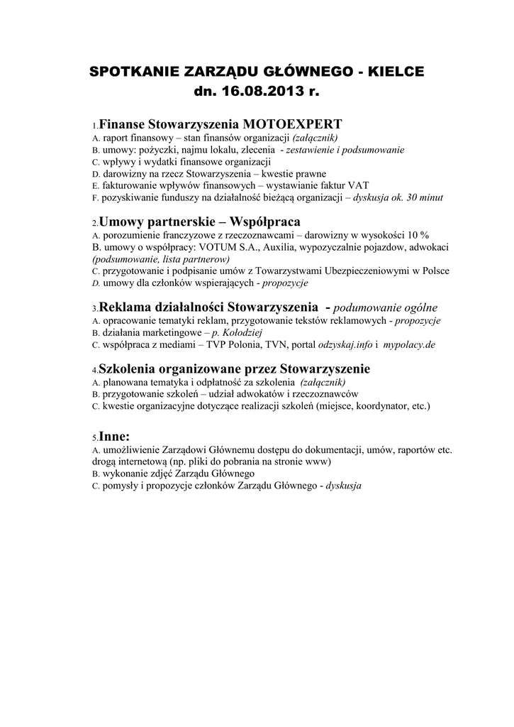 SPOTKANIE ZARZĄDU GŁÓWNEGO - KIELCE dn. 16.08.2013 r. Finanse Stowarzyszenia MOTOEXPERT 1. A. raport finansowy – stan finansów organizacji (załącznik) B. umowy: pożyczki, najmu lokalu, zlecenia - zestawienie i podsumowanie C. wpływy i wydatki finansowe organizacji D. darowizny na rzecz Stowarzyszenia – kwestie prawne E. fakturowanie wpływów finansowych – wystawianie faktur VAT F. pozyskiwanie funduszy na działalność bieżącą organizacji – dyskusja ok. 30 minut Umowy partnerskie – Współpraca 2. A. porozumienie franczyzowe z rzeczoznawcami – darowizny w wysokości 10 % B. umowy o współpracy: VOTUM S.A., Auxilia, wypozyczalnie pojazdow, adwokaci (podsumowanie, lista partnerow) C. przygotowanie i podpisanie umów z Towarzystwami Ubezpieczeniowymi w Polsce D. umowy dla członków wspierających - propozycje Reklama działalności Stowarzyszenia - 3. podumowanie ogólne A. opracowanie tematyki reklam, przygotowanie tekstów reklamowych - propozycje B. działania marketingowe – p. Kołodziej C. współpraca z mediami – TVP Polonia, TVN, portal odzyskaj.info i mypolacy.de Szkolenia organizowane przez Stowarzyszenie 4. A. planowana tematyka i odpłatność za szkolenia (załącznik) B. przygotowanie szkoleń – udział adwokatów i rzeczoznawców C. kwestie organizacyjne dotyczące realizacji szkoleń (miejsce, koordynator, etc.) Inne: 5. A. umożliwienie Zarządowi Głównemu dostępu do dokumentacji, umów, raportów etc. drogą internetową (np. pliki do pobrania na stronie www) B. wykonanie zdjęć Zarządu Głównego C. pomysły i propozycje członków Zarządu Głównego - dyskusja