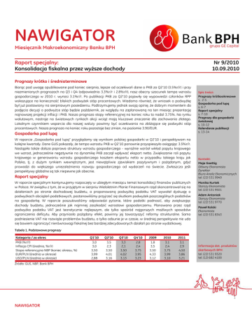 NAWIGATOR Miesięcznik Makroekonomiczny Banku BPH Raport specjalny: Konsolidacja fiskalna przez wyższe dochody Nr 9/2010 10.09.2010 Prognozy krótko i średnioterminowe Biorąc pod uwagę opublikowane pod koniec sierpnia, lepsze od oczekiwań dane o PKB za Q2’10 (3.5%r/r) i przy niezmienionych prognozach na Q3 i Q4 (odpowiednio 3.3%r/r i 2.8%r/r), nasz obecny szacunek tempa wzrostu gospodarczego w 2010 r. wynosi 3.1%r/r. Po publikacji PKB za Q2’10 pojawiły się wypowiedzi członków RPP wskazujące na konieczność bliskich podwyżek stóp procentowych. Wiadomo również, że wniosek o podwyżkę był już postawiony na sierpniowym posiedzeniu. Podtrzymujemy jednak swoją opinię, że dobrym momentem do podjęcia decyzji o podwyżce stóp będzie październik, ze względu na zaplanowaną na ten miesiąc prezentację najnowszej projekcji inflacji i PKB. Nasza prognoza stopy referencyjnej na koniec roku to nadal 3.75%. Na rynku walutowym, nastroje na światowych rynkach akcji wciąż mają kluczowe znaczenie dla zachowania złotego. Lokalnym czynnikiem wsparcia dla naszej waluty powinny być oczekiwania na zbliżające się podwyżki stóp procentowych. Nasza prognoza na koniec roku pozostaje bez zmian, na poziomie 3.90/EUR. Gospodarka pod lupą W raporcie „Gospodarka pod lupą” przyglądamy się wynikom polskiej gospodarki w Q2’10 i perspektywom na kolejne kwartały. Dane GUS pokazały, że tempo wzrostu PKB w Q2’10 ponownie przyspieszyło osiągając 3.5%r/r. Nastąpiła także dalsza poprawa struktury wzrostu gospodarczego - wyraźnie wzrósł wkład popytu krajowego we wzrost, jednocześnie negatywnie na dynamikę PKB zaczął wpływać eksport netto. Zwiększanie roli popytu krajowego w generowaniu wzrostu gospodarczego kosztem eksportu netto w przypadku takiego kraju jak Polska, tj. z dużym rynkiem wewnętrznym, jest niewątpliwie zjawiskiem pozytywnym i pożądanym, gdyż prowadzi do większego uniezależnienia rozwoju gospodarczego od wydarzeń na świecie. Zwłaszcza jeśli perspektywy globalne są tak niepewne jak obecnie. Raport specjalny W raporcie specjalnym kontynuujemy rozpoczęty w ubiegłym miesiącu temat konsolidacji finansów publicznych w Polsce. W związku z tym, że w przyjętym w sierpniu Wieloletnim Planie Finansowym rząd skoncentrował się na działaniach po stronie dochodowej budżetu, a proponowaną podwyżką podatku VAT wywołał dyskusję o podwyżkach obciążeń podatkowych, postanowiliśmy przyjrzeć się skutkom podwyżek poszczególnych podatków na gospodarkę. W raporcie poszukiwaliśmy odpowiedzi pytanie, które podatki podnosić, aby zwiększając dochody budżetu, jednocześnie jak najmniej zaszkodzić wzrostowi gospodarczemu. Planowana przez rząd podwyżka podatku VAT jest teoretycznie najlepszym, ale tylko spośród najgorszych możliwych sposobów ograniczenia deficytu. Aby przyniosła pożądany efekt, powinny jej towarzyszyć reformy strukturalne. Samo podniesienie VAT nie rozwiąże problemów budżetu, a tylko odsunie je w czasie, w średniej perspektywie nie uda się bowiem ograniczyć nierównowagi fiskalnej bez bardziej zdecydowanych działań po stronie wydatkowej. Spis treści: Prognozy krótkookresowe s. 2-5 Gospodarka pod lupą s. 6-7 Raport specjalny s. 7-10 Prognozy dla gospodarki światowej s. 10-12 Kalendarze publikacji s. 13-14 Kontakt: Maja Goettig Główny Ekonomista Dyrektor Biura Analiz Ekonomicznych tel. (22) 531 9949 Monika Kurtek Starszy Ekonomista tel. (22) 531 9501 Adam Antoniak Starszy Ekonomista tel. (22) 531 9770 Paweł Kolski Ekonomista tel. (22) 531 8343 Tabela 1. Podstawowe prognozy Kategoria / za okres PKB (%r/r) Inflacja CPI (średnia, %r/r) Stopa referencyjna NBP (koniec okresu, %) EUR/PLN (średnia w okresie) USD/PLN (średnia w okresie) Q1'10 3,0 3,0 3,50 3,99 2,88 Q2'10 3,5 2,3 3,50 4,01 3,16 Q3'10 3,3 2,1 3,50 4,02 3,13 Q4'10 2,8 2,4 3,75 3,95 3,23 2009 1,8 3,5 3,50 4,33 3,12 2010 3,1 2,4 3,75 3,99 3,10 2011 3,1 2,9 4,50 3,86 3,21 Informacja dot. produktów skarbowych BPH: tel. (22) 531 9320 tel. (12) 682 4100 Źródło: GUS, NBP, Bank BPH 1 NAWIGATOR PROGNOZY KRÓTKO I ŚREDNIOTERMINOWE KATEGORIA PROGNOZY BPH PROCESY REALNE PKB: Q3’10: +3.3%r/r 2010: +3.1% 2011: +3.1% Po publikacji lepszych od oczekiwań danych za Q2’10 (3.5%r/r) i przy niezmienionych prognozach na Q3 i Q4 (odpowiednio 3.3%r/r i 2.8%r/r) szacujemy obecnie wzrost PKB w 2010 r. na 3.1%r/r. Pozytywnym zaskoczeniem jest odbudowa popytu krajowego, która skompensowała ubytki z tytułu spodziewanego spadku znaczenia eksportu netto. Głównym zagrożeniem dla dynamiki PKB, zwłaszcza w Q4, jest spodziewane spowolnienie ożywienia gospodarczego w strefie euro. Produkcja sprzedana przemysłu: M8’10: +14.2%r/r Szacujemy, że gorszy od oczekiwań wynik produkcji przemysłowej w lipcu był m.in. wynikiem rekordowych upałów. Sierpień przyniósł poprawę warunków pogodowych, a ponadto w stosunku do analogicznego miesiąca ubiegłego roku miało 2 dni robocze więcej (w 2009 r. pracownicy mieli możliwość odebrania dnia wolnego za 15 sierpnia przypadający w dzień wolny od pracy). W efekcie oczekujemy powrotu rocznego tempa wzrostu produkcji przemysłowej sierpniu na wyższe poziomy. Sprzedaż detaliczna: M8’10: +6.1%r/r Po wyhamowaniu w lipcu do 3.4%r/r, w sierpniu spodziewamy się powrotu rocznej dynamiki sprzedaży detalicznej w okolice tej odnotowanej w czerwcu. Przy spadku o 2.2%m/m, prognozujemy wzrost w sierpniu o 6.1%r/r. KATEGORIA PROGNOZY BPH PROCESY CENOWE CPI: M08’10: +2.0%r/r W sierpniu spodziewamy się inflacji na niezmienionym poziomie wobec lipca, tj. 2.0%r/r. Prognozujemy przyspieszenie tempa wzrostu cen żywności, do 2.9%r/r (0.8%m/m), oraz dalszy spadek tempa wzrostu cen transportu, do 2.9%r/r (-1.1%m/m). Sierpień jest ostatnim miesiącem wysokiej bazy z ubiegłego roku, co sprzyja utrzymywaniu niskiej inflacji. Spodziewamy się, że od października inflacja przyspieszy i na koniec roku będzie w o