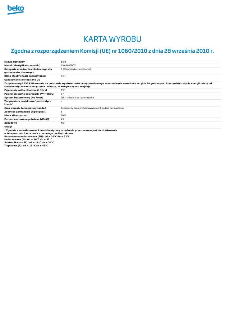 Nazwadostawcy Beko Model(identyfikatormodelu) CNA340ED0X Kategoriaurządzeniachłodniczegodla gospodarstwdomowych 7(Chłodziarko-zamrażarka) Klasaefektywnościenergetycznej A++ OznakowanieekologiczneUE - Zużycieenergii255kWhrocznienapodstawiewynikówtestuprzeprowadzonegownormalnychwarunkachwcyklu24godzinnym.Rzeczywistezużycieenergiizależyod sposobuużytkowaniaurządzeniaimiejsca,wktórymsięonoznajduje. Pojemnośćnettochłodziarki[litry] 198 Pojemnośćnettozamrażarki(***)*[litry] 97 Systembezszronowy(NoFrost) Tak-chłodziarkaizamrażarka Temperaturaprojektowa"pozostałych komór" - Czaswzrostutemperatury[godz.] Bezpiecznyczasprzechowywania21godzinbezzasilania Zdolnośćzamrażania[kg/24godz.] 5 Klasaklimatyczna* SN-T Poziomemitowanegohałasu[dB(A)] 43 Zabudowa Nie Uwagi *Zgodniezzadeklarowanąklasaklimatycznąurządzenieprzeznaczonejestdoużytkowania wtemperaturachotoczeniazpodanegoponiżejzakresu: Rozszerzonaumiarkowana(SN):od+10°Cdo+32°C Umiarkowana(N):od+16°Cdo+32°C Subtropikalna(ST):od+16°Cdo+38°C Tropikalna(T):od+16°Cdo+43°C