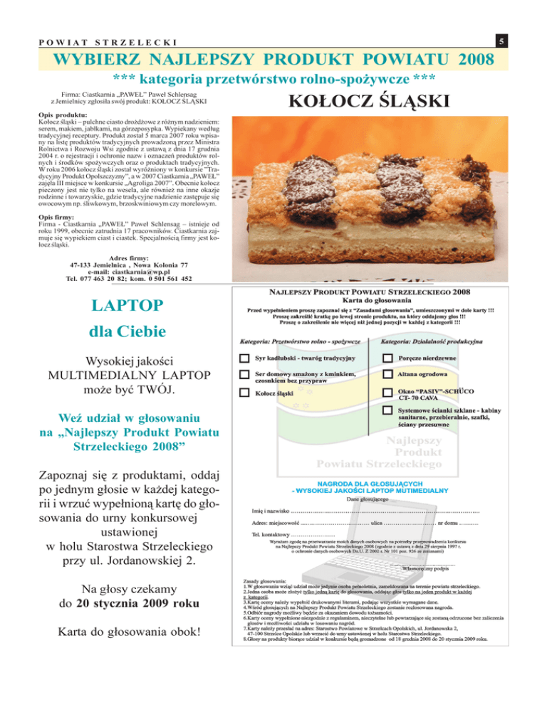 5 POWIAT STR Z E LE C K I WYBIERZ NAJLEPSZY PRODUKT POWIATU 2008 *** kategoria przetwórstwo rolno-spo¿ywcze *** Firma: Ciastkarnia PAWE£ Pawe³ Schlensag z Jemielnicy zg³osi³a swój produkt: KO£OCZ L¥SKI Opis produktu: Ko³ocz l¹ski pulchne ciasto dro¿d¿owe z ró¿nym nadzieniem: serem, makiem, jab³kami, na górzeposypka. Wypiekany wed³ug tradycyjnej receptury. Produkt zosta³ 5 marca 2007 roku wpisany na listê produktów tradycyjnych prowadzon¹ przez Ministra Rolnictwa i Rozwoju Wsi zgodnie z ustaw¹ z dnia 17 grudnia 2004 r. o rejestracji i ochronie nazw i oznaczeñ produktów rolnych i rodków spo¿ywczych oraz o produktach tradycyjnych. W roku 2006 ko³ocz l¹ski zosta³ wyró¿niony w konkursie Tradycyjny Produkt Opolszczyzny, a w 2007 Ciastkarnia PAWE£ zajê³a III miejsce w konkursie Agroliga 2007. Obecnie ko³ocz pieczony jest nie tylko na wesela, ale równie¿ na inne okazje rodzinne i towarzyskie, gdzie tradycyjne nadzienie zastêpuje siê owocowym np. liwkowym, brzoskwiniowym czy morelowym. Opis firmy: Firma - Ciastkarnia PAWE£ Pawe³ Schlensag istnieje od roku 1999, obecnie zatrudnia 17 pracowników. Ciastkarnia zajmuje siê wypiekiem ciast i ciastek. Specjalnoci¹ firmy jest ko³ocz l¹ski. Adres firmy: 47-133 Jemielnica , Nowa Kolonia 77 e-mail: [email protected] Tel. 077 463 20 82; kom. 0 501 561 452 LAPTOP dla Ciebie Wysokiej jakoci MULTIMEDIALNY LAPTOP mo¿e byæ TWÓJ. We udzia³ w g³osowaniu na Najlepszy Produkt Powiatu Strzeleckiego 2008 Zapoznaj siê z produktami, oddaj po jednym g³osie w ka¿dej kategorii i wrzuæ wype³nion¹ kartê do g³osowania do urny konkursowej ustawionej w holu Starostwa Strzeleckiego przy ul. Jordanowskiej 2. Na g³osy czekamy do 20 stycznia 2009 roku Karta do g³osowania obok! KO£OCZ L¥SKI