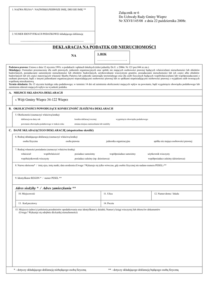 1. NAZWA PEŁNA* / NAZWISKO,PIERWSZE IMIĘ, DRUGIE IMIĘ ** Załącznik nr 6 Do Uchwały Rady Gminy Wieprz Nr XXVI/145/08 z dnia 22 października 2008r. 2. NUMER IDENTYFIKACJI PODATKOWEJ składającego deklarację ........................................................................ DEKLARACJA NA PODATEK OD NIERUCHOMOŚCI NA 3. ROK ................................................ . Podstawa prawna: Ustawa z dnia 12 stycznia 1991r. o podatkach i opłatach lokalnych (tekst jednolity Dz.U. z 2006r. Nr 121 poz.844 ze zm.) Składający: Formularz przeznaczony dla osób prawnych, jednostek organizacyjnych oraz spółek nie mających osobowości prawnej będących właścicielami nieruchomości lub obiektów budowlanych, posiadaczami samoistnymi nieruchomości lub obiektów budowlanych, użytkownikami wieczystymi gruntów, posiadaczami nieruchomości lub ich części albo obiektów budowlanych lub ich części stanowiących własność Skarbu Państwa lub jednostki samorządu terytorialnego oraz dla osób fizycznych będących współwłaścicielami lub współposiadaczami z osobami prawnymi, bądź z innymi jednostkami organizacyjnymi nieposiadającymi osobowości prawnej lub ze spółkami nieposiadającymi osobowości prawnej z wyjątkiem osób tworzących wspólnotę mieszkaniową. Termin składania: Do 15 stycznia każdego roku podatkowego; w terminie 14 dni od zaistnienia okoliczności mających wpływ na powstanie, bądź wygaśnięcie obowiązku podatkowego lub zaistnienia zdarzeń mających wpływ na wysokość podatku. A. MIEJSCE SKŁADANIA DEKLARACJI 4. Wójt Gminy Wieprz 34-122 Wieprz B. OKOLICZNOŚCI POWODUJĄCE KONIECZNOŚĆ ZŁOŻENIA DEKLARACJI 5. Okoliczności (zaznaczyć właściwą kratkę) deklaracja na dany rok korekta deklaracji rocznej powstanie obowiązku podatkowego w trakcie roku zmiana miejsca zamieszkania lub siedziby wygaśnięcie obowiązku podatkowego C. DANE SKŁADAJĄCEGO DEKLARACJĘ (niepotrzebne skreślić) 6. Rodzaj składającego deklarację (zaznaczyć właściwą kratkę) osoba fizyczna osoba prawna jednostka organizacyjna spółka nie mająca osobowości prawnej 7. Rodzaj własności posiadania (zaznaczyć właściwa kratkę) właściciel współwłaściciel współużytkownik wieczysty posiadacz samoistny współposiadasz samoistny posiadacz zależny (np. dzierżawca) użytkownik wieczysty współposiadacz zależny (dzierżawca) 8. Nazwa skrócona* / imię ojca, imię matki, data urodzenia (Uwaga ! Wykazuje się tylko wówczas, gdy osobie fizycznej nie nadano numeru PESEL) ** 9. Identyfikator REGON * / numer PESEL ** Adres siedziby * / Adres zamieszkania ** 10. Miejscowość 11. Ulica 13. Kod pocztowy 14. Poczta 12. Numer domu / lokalu 15. Miejsce/a (adres/y) położenia przedmiotów opodatkowania oraz identyfikator/y działek; Numer/y księgi wieczystej lub zbioru/ów dokumentów (Uwaga ! Wykazuje się odrębnie dla każdej nieruchomości) * - dotyczy składającego deklarację niebędącego osobą fizyczną ** - dotyczy składającego deklarację będącego osobą fizyczną D. DANE DOTYCZĄCE PRZEDMIOTÓW OPODATKOWANIA Podstawa opodatkowania Wyszczególnienie 16. Budynki mieszkalne lub ich części Stawka podatku Kwota podatku w zł Kwota zwolnienia w zł Powierzchnia użytkowa ............................................... m2 17. 18. 19. 20. Budynki lub ich części związane z prowadzoną działalnością gospodarczą oraz części budynków mieszkalnych zajętych na prowadzenie działalności gospodarczej Powierzchnia użytkowa Budynki lub ich części zajęte na prowadzenie działalności gospodarczej w zakresie obrotu kwalifikowanym materiałem siewnym Powierzchnia użytkowa Budynki lub ich części zajęte na prowadzenie działalności gospodarczej w zakresie udzielania świadczeń zdrowotnych. Powierzchnia użytkowa Stodoły Powierzchnia użytkowa ............................................... m2 ............................................... m2 ............................................... m2 ............................................... m2 21. 22. Pozostałe budynki lub ich części, w tym zajęte na prowadzenie statutowej działalności pożytku publicznego przez organizacje pożytku publicznego Powierzchnia użytkowa Budowle Wartość ............................................... m2 ................................................ zł 23. Grunty: a) związane z prowadzeniem działalności gospodarczej bez względu na sposób zakwalifikowania w ewidencji gruntów i budynków Powierzchnia b) pozostałe, w tym zajęte na prowadzenie statutowej działalności pożytku publicznego przez organizacje pożytku publicznego Powierzchnia ............................................... m2 ............................................... m2 Razem E. INFORMACJA O PRZEDMIOTACH ZWOLNIONYCH (podać przepis prawa – z jakiego tytułu przysługuje zwolnienie) Oświadczam, że podane dane są zgodne z prawdą. .............................................. Data wypełnienia: .................................................................................... nazwisko i imię osoby odpowiedzialnej za prawidłowe obliczenie podatku, nr telefonu ...................................................... kierownik jednostki ......................................................... podpis księgowego Pouczenie 1. 2. Obliczony w deklaracji podatek od nieruchomości należy wpłacać bez wezwania na rachunek Urzędu Gminy Wieprz 34-122 Wieprz 217, ING BANK ŚLĄSKI O/WADOWICE, nr konta: 36105011001000002279257626, za poszczególne miesiące w terminie do dnia 15 każdego miesiąca. W przypadku niewpłacenia w obowiązujących terminach i ratach kwoty podatku lub wpłacenia jej w niepełnej wysokości, niniejsza deklaracja stanowi podstawę do wystawienia tytułu wykonawczego, zgodnie z przepisami ustawy z dnia 17 czerwca 1966r. o postępowaniu egzekucyjnym w administracji (Dz. U. Z 2002r. Nr 110, poz. 968, ze zm.). ADNOTACJE ORGANU PODATKOWEGO Data wpływu: ...