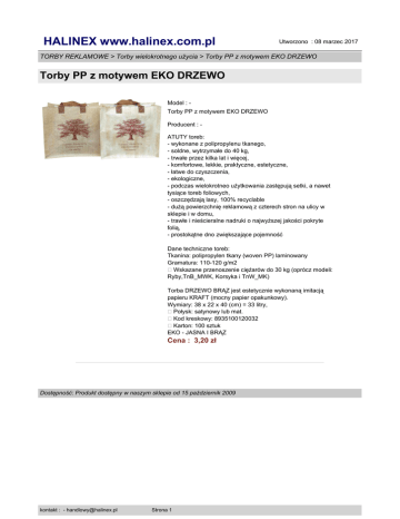 HALINEX www.halinex.com.pl Utworzono : 08 marzec 2017 TORBY REKLAMOWE > Torby wielokrotnego użycia > Torby PP z motywem EKO DRZEWO Torby PP z motywem EKO DRZEWO Model : Torby PP z motywem EKO DRZEWO Producent : ATUTY toreb: - wykonane z polipropylenu tkanego, - soldne, wytrzymałe do 40 kg, - trwałe przez kilka lat i więcej, - komfortowe, lekkie, praktyczne, estetyczne, - łatwe do czyszczenia, - ekologiczne, - podczas wielokrotneo użytkowania zastępują setki, a nawet tysiące toreb foliowych, - oszczędzają lasy, 100% recyclable - dużą powierzchnię reklamową z czterech stron na ulicy w sklepie i w domu, - trawłe i nieścieralne nadruki o najwyższej jakości pokryte folią, - prostokątne dno zwiększające pojemność Dane techniczne toreb: Tkanina: polipropylen tkany (woven PP) laminowany Gramatura: 110-120 g/m2 �Wskazane przenoszenie ciężarów do 30 kg (oprócz modeli: Ryby,TnB_MWK, Korsyka i TnW_MK) Torba DRZEWO BRĄZ jest estetycznie wykonaną imitacją papieru KRAFT (mocny papier opakunkowy). Wymiary: 38 x 22 x 40 (cm) = 33 litry, �Połysk: satynowy lub mat. �Kod kreskowy: 8935100120032 �Karton: 100 sztuk EKO - JASNA I BRĄZ Cena : 3,20 zł Dostępność: Produkt dostępny w naszym sklepie od 15 październik 2009 kontakt : - [email protected] Strona 1