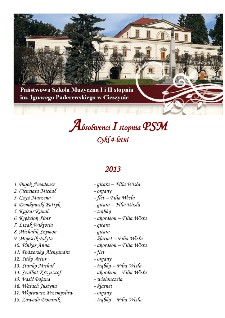 Absolwenci I stopnia PSM Cykl 4-letni 2013 1. Bujok Amadeusz 2. Cienciała Michał 3. Czyż Marzena 4. Demkowski Patryk 5. Kajzar Kamil 6. Krężelok Piotr 7. Lizak Wiktoria 8. Michalik Szymon 9. Mojeścik Edyta 10. Pinkas Anna 11. Podżorska Aleksandra 12. Sitko Artur 13. Stańko Michał 14. Szalbot Krzysztof 15. Vasić Bojana 16. Wałach Justyna 17. Wójtowicz Przemysław 18. Zawada Dominik - gitara – Filia Wisła - organy - flet – Filia Wisła - gitara – Filia Wisła - trąbka - akordeon – Filia Wisła - gitara - gitara - klarnet – Filia Wisła - akordeon – Filia Wisła - flet - organy - trąbka – Filia Wisła - akordeon – Filia Wisła - wiolonczela - klarnet - organy - trąbka – Filia Wisła 2012 1. Badura Damian 2. Cieślar Karolina 3. Cieślar Magdalena 4. Czyż Mateusz 5. Frycz Ewelina 6. Greń Dariusz 7. Greń Tomasz 8. Gwóźdź Piotr 9. Hanus Daria 10. Harok Maciej 11. Hyrnik Agnieszka 12. Idziniak Tomasz 13. Klęk Dawid 14. Korona Karolina 15. Legierska Angelika 16. Niemczyk Katarzyna 17. Pilch Szymon 18. Skupień Paulina 19. Wieczorek Justyna 20. Wieczorek Monika 21. Zubek Julia - trąbka – Filia Wisła - trąbka – Filia Wisła - klarnet – Filia Wisła - trąbka - waltornia - klarnet - akordeon - klarnet - gitara - puzon - gitara – Filia Wisła - akordeon – Filia Wisła - gitara - organy - flet – Filia Wisła - gitara - gitara – Filia Wisła - flet - saksofon - akordeon - gitara 2011 1. Adamus Żaneta 2. Baraniok Wojciech 3. Budziński Jan 4. Bujok Debora 5. Burliga Kamil 6. Chrapek Aleksander 7. Czyż Monika 8. Kaleta Artur 9. Krupa Stanisław 10. Pikul Karol 11. Pilch Marta 12. Roszkowski Tomasz 13. Santarius Błażej 14. Sikora Angelika 15. Staszuk Adrian 16. Szczypka Damian - flet – Filia Wisła - akordeon – Filia Wisła - gitara - flet – Filia Wisła - gitara - klarnet – Filia Wisła - flet – Filia Wisła - saksofon - gitara - gitara – Filia Wisła - klarnet – Filia Wisła - akordeon – Filia Wisła - trąbka - flet – Filia Wisła - gitara - akordeon 2010 1. Broda Alicja 2. Bylok Krzysztof 3. Cieślar Anna 4. Dorda Dagmara 5. Drózd Sławomir 6. Gaszczyk Patryk 7. Idziniak Żaneta 8. Kaleta Mariusz 9. Kania Bartosz 10. Maciejiczek Bartłomiej 11. Maguda Tomasz 12. Mędrala Aneta 13. Nowak Remigiusz 14. Stokłosa Magdalena 15. Szarzec Beata 16. Szczuka Robert 17. Śliwka Justyna - gitara - klarnet - gitara – Filia Wisła - gitara - flet – Filia Wisła - gitara - akordeon – Filia Wisła - puzon - obój - saksofon - flet – Filia Wisła - akordeon - akordeon - waltornia - flet – Filia Wisła - klarnet – Filia Wisła - organy 2009 1. Glajc Martyna 2. Gwizdoń Przemysław 3. Hławiczka Mateusz 4. Księżyc Maciej 5. Kurzok Noemi 6. Magdicz Melania 7. Morawa Paulina 8. Polok Miriam 9. Rucki Rafał 10. Szarzec Kinga 11. Tulec Aleksandra - gitara - klarnet - puzon - gitara - flet – Filia Wisła - flet – Filia Wisła - gitara - klarnet – Filia Wisła - gitara - wiolonczela - wiolonczela 2008 1. Babiński Rafał 2. Białek Bartłomiej 3. Cieńciała Jakub 4. Gawłowska Patrycja 5. Gazurek Aleksandra 6. Karolak Karolina 7. Macura Jagoda 8. Miedziak Joanna 9. Pala Anna 10. Pilch Marta 11. Rek Dominika 12. Sesay Filip - gitara - klarnet - tuba - wiolonczela - gitara - gitara - akordeon - klarnet – Filia Wisła - puzon - gitara – Filia Wisła - wiolonczela - gitara 2007 1. Czaja Maksymilian 2. Glajcar Paweł 3. Jałowiczor Agnieszka 4. Kaleta Krystian 5. Kawulok Adam 6. Konieczny Wojciech 7. Madecki Bartosz 8. Małyjurek Dominik 9. Małyjurek Patrycja 10.Polok Weronika 11.Raszka Jerzy 12.Skurzok Jakub 13.Szajtauer Piotr 14.Śliwka Agnieszka 15.Tesarczyk Bartosz 16.Wolny Piotr 17.Zwierz Daria 18.Zwierz Ewelina 19.Zwierzchowska Justyna 20.Zwierzchowski Arkadiusz - baryton - klarnet - klarnet – Filia Wisła - akordeon - gitara – Filia Wisła - trąbka - klarnet - klarnet – Filia Wisła - klarnet – Filia Wisła - flet – Filia Wisła - trąbka – Filia Wisła - akordeon – Filia Wisła - gitara – Filia Wisła - klarnet - klarnet - akordeon - gitara - gitara - flet – Filia Wisła - akordeon – Filia Wisła 2006 1. Cieślar Dariusz 2. Hnidec Adam 3. Kłaczkowski Krzysztof 4. Kuboszek Krzysztof 5. Lupa Joanna 6. Pasieka Aleksandra 7. Piotrowski Piotr 8. Skowron Paulina 9. Strzałkowska Wiktoria 10.Tomala Tymoteusz 11.Wenglarzy Weronika - trąbka - klarnet - akordeon - klarnet - gitara - flet - gitara - gitara - gitara - klarnet - gitara 2005 1. Broda Michalina 2. Danel Michał 3. Franek Joanna 4. Grzybek Aleksander 5. Moskała Paweł 6. Musioł Alicja 7. Nawrocki Sebastian 8. Recmanik Jonasz 9. Szopa Kamil 10.Warsińska Sonia - gitara - akordeon - akordeon - obój - klarnet - klarnet - klarnet - gitara - puzon - gitara 2004 1. 2. 3. 4. 5. 6. 7. Cieślar Piotr Gajdacz Aneta Glajc Jagoda Kłaczkowska Beata Morawiec Anna Maria Recmanik Łukasz Szczypka Anna - klarnet - flet - gitara - obój - gitara - klarnet - wiolonczela 2003 1. 2. 3. 4. 5. 6. 7. Cieślar Katarzyna Klein Piotr Kluz Jolanta Matula Kacper Mitręga Patryk Słowiena Bartłomiej Waliczek Kazimierz - gitara - saksofon - flet - gitara - klarnet - gitara - saksofon 2002 1. 2. 3. 4. 5. 6. Maciejczek Aleksandra Madej Szymon Makarewicz Jan Słowiena Anna Tracz Mateusz Wrzecionko Joanna - flet - gitara - gitara - wiolonczela - gitara - flet 2000 1. 2. 3. 4. 5. 6. 7. Boruta Maria Chylińska Katarzyna Janik Karolina Marciniak Monika Rychły Anna Sap Agnieszka Wawrzeczko Marek - wiolonczela - akordeon - gitara - wiolonczela - gitara - saksofon - klarnet 1999 (cykl trzyletni) 1. 2. 3. 4. 5. 6. 7. Gabryś Anna Greń Łukasz Madzia Seweryn Nawrat Tadeusz Pastucha Olga Skórka Dorota Żelazek Sławomir - saksofon - trąbka - klarnet - saksofon - flet - gitara - klarnet 1999 (dział młodzieżowy) 1. Chmiel Paweł 2. Dziedzic Barbara 3. Gap Tomasz 4. Jakubiec Piotr 5. Kamińska Agata 6. Kulak Andrzej 7. Mieszek Małgorzata 8. Pająk Katarzyna 9. Przybylska Karo