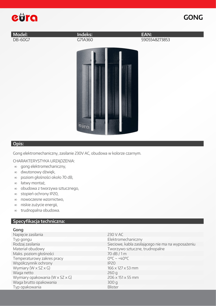 GONG Model: DB-60G7 Indeks: EAN: G71A360 5905548273853 Opis: Gong elektromechaniczny, zasilanie 230V AC, obudowa w kolorze czarnym. CHARAKTERYSTYKA URZĄDZENIA: • gong elektromechaniczny, • dwutonowy dźwięk, • poziom głośności około 70 dB, • łatwy montaż, • obudowa z tworzywa sztucznego, • stopień ochrony IP20, • nowoczesne wzornictwo, • niskie zużycie energii, • trudnopalna obudowa. Specyfikacja techniczna: Gong Napięcie zasilania Typ gongu Rodzaj zasilania Materiał obudowy Maks. poziom głośności Temperaturowy zakres pracy Współczynnik ochrony Wymiary (W x SZ x G) Waga netto Wymiary opakowania (W x SZ x G) Waga brutto opakowania Typ opakowania 230 V AC Elektromechaniczny Sieciowe, kabla zasilającego nie ma na wyposażeniu Tworzywo sztuczne, trudnopalne 70 dB / 1 m 0ºC ~ +40ºC IP20 166 x 127 x 53 mm 260 g 206 x 151 x 55 mm 300 g Blister