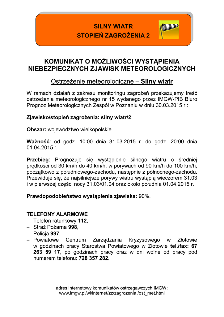 SILNY WIATR STOPIEŃ ZAGROŻENIA 2 KOMUNIKAT O MOŻLIWOŚCI WYSTĄPIENIA NIEBEZPIECZNYCH ZJAWISK METEOROLOGICZNYCH Ostrzeżenie meteorologiczne – Silny wiatr W ramach działań z zakresu monitoringu zagrożeń przekazujemy treść ostrzeżenia meteorologicznego nr 15 wydanego przez IMGW-PIB Biuro Prognoz Meteorologicznych Zespół w Poznaniu w dniu 30.03.2015 r.: Zjawisko/stopień zagrożenia: silny wiatr/2 Obszar: województwo wielkopolskie Ważność: od godz. 10:00 dnia 31.03.2015 r. do godz. 20:00 dnia 01.04.2015 r. Przebieg: Prognozuje się wystąpienie silnego wiatru o średniej prędkości od 30 km/h do 40 km/h, w porywach od 90 km/h do 100 km/h, początkowo z południowego-zachodu, następnie z północnego-zachodu. Przewiduje się, że najsilniejsze porywy wiatru wystąpią wieczorem 31.03 i w pierwszej części nocy 31.03/01.04 oraz około południa 01.04.2015 r. Prawdopodobieństwo wystąpienia zjawiska: 90%. TELEFONY ALARMOWE Telefon ratunkowy 112, Straż Pożarna 998, Policja 997, Powiatowe Centrum Zarządzania Kryzysowego w Złotowie w godzinach pracy Starostwa Powiatowego w Złotowie tel./fax: 67 263 59 17, po godzinach pracy oraz w dni wolne od pracy pod numerem telefonu: 728 357 282. adres internetowy komunikatów ostrzegawczych IMGW: www.imgw.pl/wl/internet/zz/zagrozenia /ost_met.html