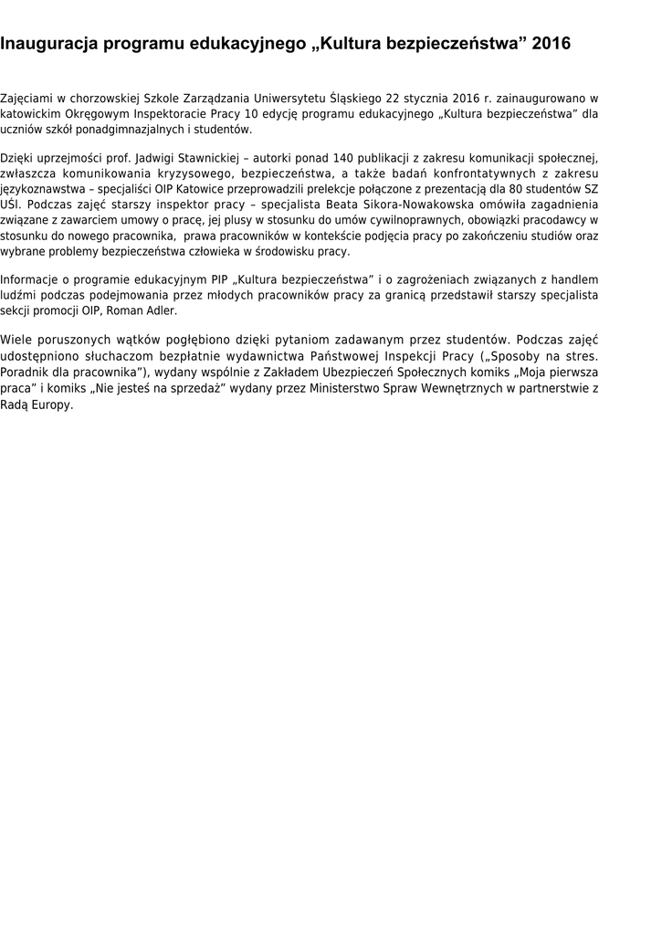 Inauguracja programu edukacyjnego „Kultura bezpieczeństwa” 2016 Zajęciami w chorzowskiej Szkole Zarządzania Uniwersytetu Śląskiego 22 stycznia 2016 r. zainaugurowano w katowickim Okręgowym Inspektoracie Pracy 10 edycję programu edukacyjnego „Kultura bezpieczeństwa” dla uczniów szkół ponadgimnazjalnych i studentów. Dzięki uprzejmości prof. Jadwigi Stawnickiej – autorki ponad 140 publikacji z zakresu komunikacji społecznej, zwłaszcza komunikowania kryzysowego, bezpieczeństwa, a także badań konfrontatywnych z zakresu językoznawstwa – specjaliści OIP Katowice przeprowadzili prelekcje połączone z prezentacją dla 80 studentów SZ UŚl. Podczas zajęć starszy inspektor pracy – specjalista Beata Sikora-Nowakowska omówiła zagadnienia związane z zawarciem umowy o pracę, jej plusy w stosunku do umów cywilnoprawnych, obowiązki pracodawcy w stosunku do nowego pracownika, prawa pracowników w kontekście podjęcia pracy po zakończeniu studiów oraz wybrane problemy bezpieczeństwa człowieka w środowisku pracy. Informacje o programie edukacyjnym PIP „Kultura bezpieczeństwa” i o zagrożeniach związanych z handlem ludźmi podczas podejmowania przez młodych pracowników pracy za granicą przedstawił starszy specjalista sekcji promocji OIP, Roman Adler. Wiele poruszonych wątków pogłębiono dzięki pytaniom zadawanym przez studentów. Podczas zajęć udostępniono słuchaczom bezpłatnie wydawnictwa Państwowej Inspekcji Pracy („Sposoby na stres. Poradnik dla pracownika”), wydany wspólnie z Zakładem Ubezpieczeń Społecznych komiks „Moja pierwsza praca” i komiks „Nie jesteś na sprzedaż” wydany przez Ministerstwo Spraw Wewnętrznych w partnerstwie z Radą Europy.