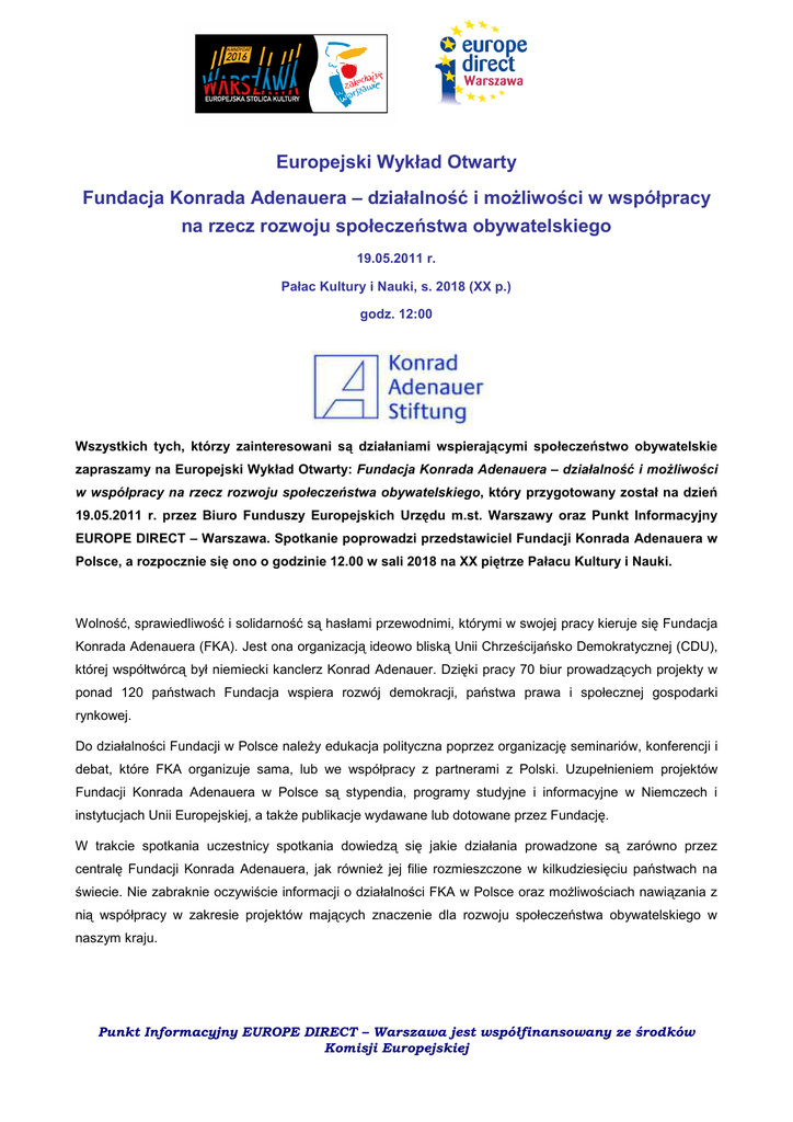 Europejski Wykład Otwarty Fundacja Konrada Adenauera – działalność i możliwości w współpracy na rzecz rozwoju społeczeństwa obywatelskiego 19.05.2011 r. Pałac Kultury i Nauki, s. 2018 (XX p.) godz. 12:00 Wszystkich tych, którzy zainteresowani są działaniami wspierającymi społeczeństwo obywatelskie zapraszamy na Europejski Wykład Otwarty: Fundacja Konrada Adenauera – działalność i możliwości w współpracy na rzecz rozwoju społeczeństwa obywatelskiego, który przygotowany został na dzień 19.05.2011 r. przez Biuro Funduszy Europejskich Urzędu m.st. Warszawy oraz Punkt Informacyjny EUROPE DIRECT – Warszawa. Spotkanie poprowadzi przedstawiciel Fundacji Konrada Adenauera w Polsce, a rozpocznie się ono o godzinie 12.00 w sali 2018 na XX piętrze Pałacu Kultury i Nauki. Wolność, sprawiedliwość i solidarność są hasłami przewodnimi, którymi w swojej pracy kieruje się Fundacja Konrada Adenauera (FKA). Jest ona organizacją ideowo bliską Unii Chrześcijańsko Demokratycznej (CDU), której współtwórcą był niemiecki kanclerz Konrad Adenauer. Dzięki pracy 70 biur prowadzących projekty w ponad 120 państwach Fundacja wspiera rozwój demokracji, państwa prawa i społecznej gospodarki rynkowej. Do działalności Fundacji w Polsce należy edukacja polityczna poprzez organizację seminariów, konferencji i debat, które FKA organizuje sama, lub we współpracy z partnerami z Polski. Uzupełnieniem projektów Fundacji Konrada Adenauera w Polsce są stypendia, programy studyjne i informacyjne w Niemczech i instytucjach Unii Europejskiej, a także publikacje wydawane lub dotowane przez Fundację. W trakcie spotkania uczestnicy spotkania dowiedzą się jakie działania prowadzone są zarówno przez centralę Fundacji Konrada Adenauera, jak również jej filie rozmieszczone w kilkudziesięciu państwach na świecie. Nie zabraknie oczywiście informacji o działalności FKA w Polsce oraz możliwościach nawiązania z nią współpracy w zakresie projektów mających znaczenie dla rozwoju społeczeństwa obywatelskiego w naszym kraju. Punkt Informacyjny EUROPE DIRECT – Warszawa jest współfinansowany ze środków Komisji Europejskiej