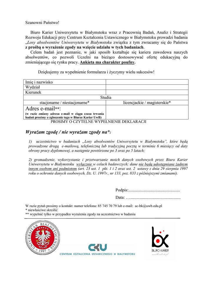 Szanowni Państwo! Biuro Karier Uniwersytetu w Białymstoku wraz z Pracownią Badań, Analiz i Strategii Rozwoju Edukacji przy Centrum Kształcenia Ustawicznego w Białymstoku prowadzi badania „Losy absolwentów Uniwersytetu w Białymstoku związku z tym zwracamy się do Państwa z prośbą o wyrażenie zgody na wzięcie udziału w tych badaniach. Celem badań jest poznanie, w jaki sposób kształtuje się kariera zawodowa naszych absolwentów, co pozwoli Uczelni na bieżąco dostosowywać ofertę edukacyjną do zmieniającego się rynku pracy. Ankieta ma charakter poufny. Dziękujemy za wypełnienie formularza i życzymy wielu sukcesów! Imię i nazwisko Wydział Kierunek Studia stacjonarne / niestacjonarne* licencjackie / magisterskie* Adres e-mail**: (w razie zmiany adresu e-mail w ciągu czasu trwania badań prosimy o zgłoszenie tego w Biurze Karier UwB) PROSIMY O CZYTELNE WYPEŁNIENIE DEKLARACJI Wyrażam zgodę / nie wyrażam zgody na*: 1) uczestnictwo w badaniach „Losy absolwentów Uniwersytetu w Białymstoku”, które będą prowadzone drogą e-mailową, telefoniczną lub tradycyjną pocztą w terminie 6 miesięcy od daty obrony pracy dyplomowej, a następnie powtórzone po 3 oraz po 5 latach; 2) gromadzenie, wykorzystanie i przetwarzanie moich danych osobowych przez Biuro Karier Uniwersytetu w Białymstoku wyłącznie w celach badawczych; dane nie będą udostępniane żadnym innym osobom ani podmiotom (art. 23 ust. 1 pkt. 1 i 2 oraz ust. 2 ustawy z dnia 29 sierpnia 1997 roku o ochronie danych osobowych, Dz. U. 1997r., nr 133, poz. 833 z późniejszymi zmianami). Podpis:................................................ Data: …............................................... W razie pytań prosimy o kontakt: numer telefonu: 85 745 70 79 lub e-mail: [email protected] * niewłaściwe skreślić ** wypełnić tylko w przypadku wyrażenia zgody na uczestnictwo w badaniu
