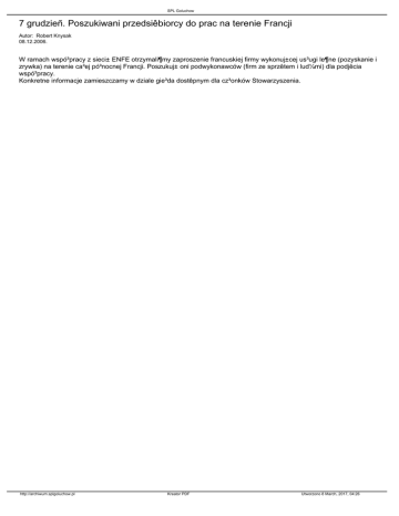SPL Goluchow 7 grudzieñ. Poszukiwani przedsiêbiorcy do prac na terenie Francji Autor: Robert Knysak 08.12.2006. W ramach wspó³pracy z sieci± ENFE otrzymali¶my zaproszenie francuskiej firmy wykonuj±cej us³ugi le¶ne (pozyskanie i zrywka) na terenie ca³ej pó³nocnej Francji. Poszukuj± oni podwykonawców (firm ze sprzêtem i lud¼mi) dla podjêcia wspó³pracy. Konkretne informacje zamieszczamy w dziale gie³da dostêpnym dla cz³onków Stowarzyszenia. http://archiwum.splgoluchow.pl Kreator PDF Utworzono 8 March, 2017, 04:26
