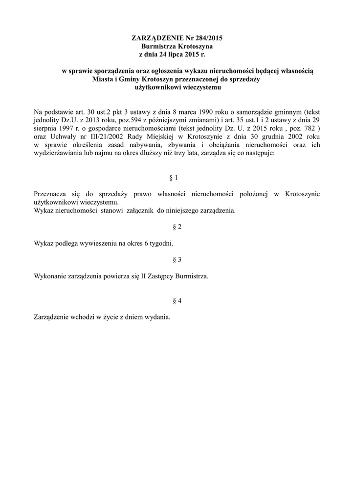 ZARZĄDZENIE Nr 284/2015 Burmistrza Krotoszyna z dnia 24 lipca