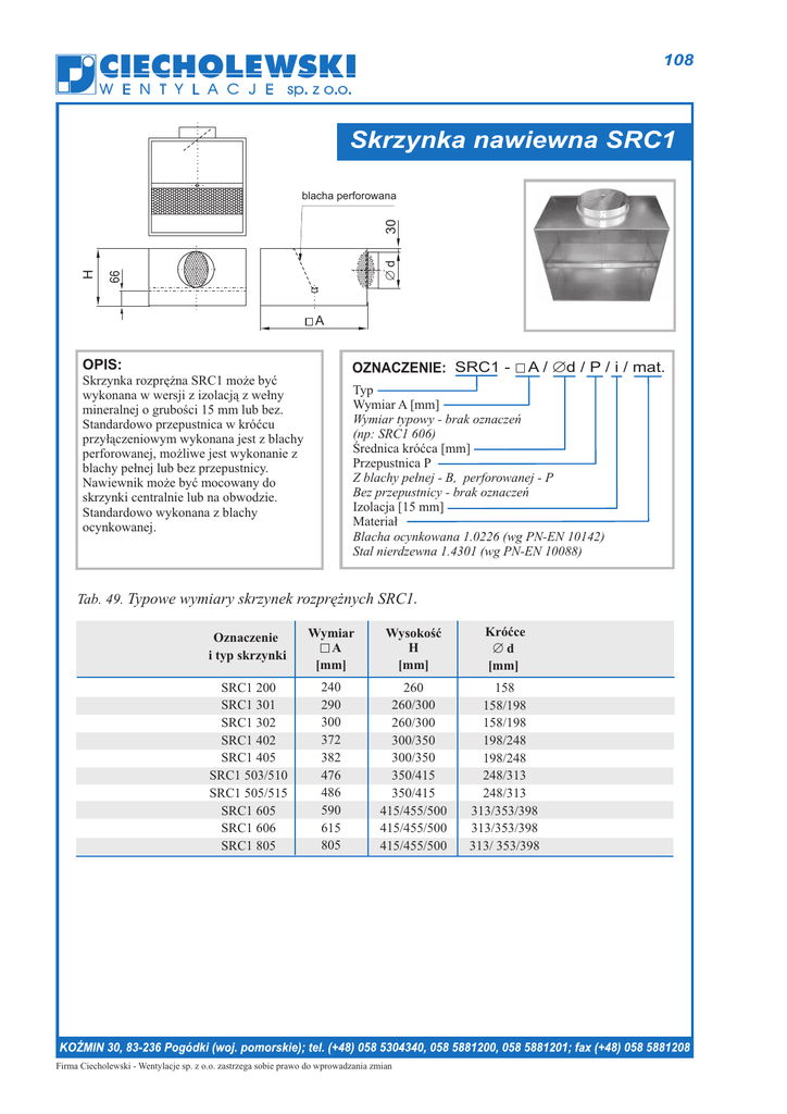 108 W E N T Y L A C J E sp. z o.o. Skrzynka nawiewna SRC1 S Æd 66 H 30 blacha perforowana A OPIS: OZNACZENIE: SRC1 - Skrzynka rozprê¿na SRC1 mo¿e byæ wykonana w wersji z izolacj¹ z we³ny mineralnej o gruboœci 15 mm lub bez. Standardowo przepustnica w króæcu przy³¹czeniowym wykonana jest z blachy perforowanej, mo¿liwe jest wykonanie z blachy pe³nej lub bez przepustnicy. Nawiewnik mo¿e byæ mocowany do skrzynki centralnie lub na obwodzie. Standardowo wykonana z blachy ocynkowanej. A / Æd / P / i / mat. Typ Wymiar A [mm] Wymiar typowy - brak oznaczeñ (np: SRC1 606) Œrednica króæca [mm] Przepustnica P Z blachy pe³nej - B, perforowanej - P Bez przepustnicy - brak oznaczeñ Izolacja [15 mm] Materia³ Blacha ocynkowana 1.0226 (wg PN-EN 10142) Stal nierdzewna 1.4301 (wg PN-EN 10088) Tab. 49. Typowe wymiary skrzynek rozprê¿nych SRC1. Oznaczenie i typ skrzynki Wymiar A [mm] Wysokoœæ H [mm] Króæce Æd [mm] SRC1 200 SRC1 301 SRC1 302 SRC1 402 SRC1 405 SRC1 503/510 SRC1 505/515 SRC1 605 SRC1 606 SRC1 805 240 290 300 372 382 476 486 590 615 805 260 260/300 260/300 300/350 300/350 350/415 350/415 415/455/500 415/455/500 415/455/500 158 158/198 158/198 198/248 198/248 248/313 248/313 313/353/398 313/353/398 313/ 353/398 Firma Ciecholewski - Wentylacje sp. z o.o. zastrzega sobie prawo do wprowadzania zmian