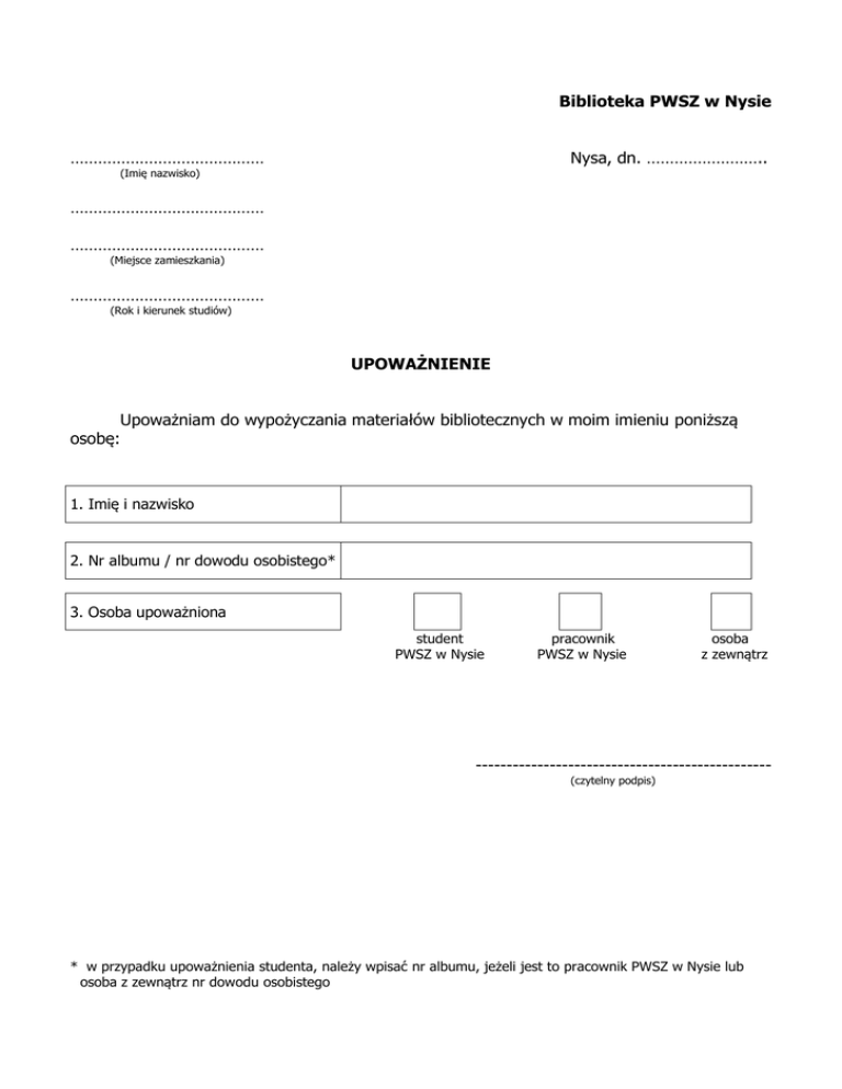 Biblioteka PWSZ w Nysie …………………………………… Nysa, dn. …………………….. (Imię nazwisko) …………………………………… …………………………………… (Miejsce zamieszkania) …………………………………… (Rok i kierunek studiów) UPOWAŻNIENIE Upoważniam do wypożyczania materiałów bibliotecznych w moim imieniu poniższą osobę: 1. Imię i nazwisko 2. Nr albumu / nr dowodu osobistego* 3. Osoba upoważniona student PWSZ w Nysie pracownik PWSZ w Nysie osoba z zewnątrz -----------------------------------------------(czytelny podpis) * w przypadku upoważnienia studenta, należy wpisać nr albumu, jeżeli jest to pracownik PWSZ w Nysie lub osoba z zewnątrz nr dowodu osobistego