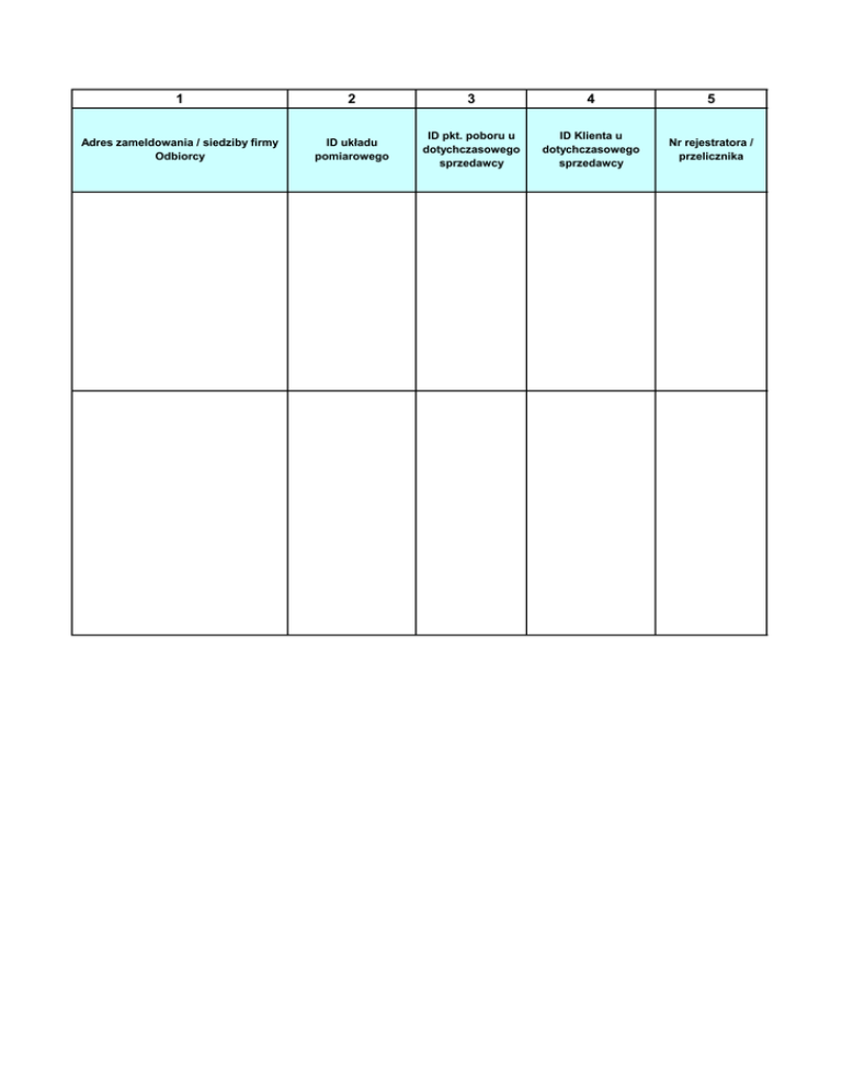 1 2 3 4 5 Adres zameldowania / siedziby firmy Odbiorcy ID układu pomiarowego ID pkt. poboru u dotychczasowego sprzedawcy ID Klienta u dotychczasowego sprzedawcy Nr rejestratora / przelicznika Zgłoszenie PZD - Zmiana Sprzedawcy 6 Nr gazomierza 7 8 Moc umowna u dotychczasowe Grupa taryfowa go sprzedawcy [m3/h] 9 Ilości roczne [m3] 10 Nazwa i adres nowego sprzedawcy 11 12 13 14 15 Rodzaj umowy Imię i nazwisko osoby kontaktowej Adres korespondencyjny/ adres mailowy Telefon kontaktowy Inne informacje
