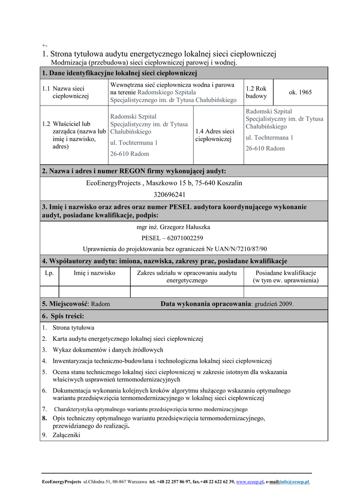 +- 1. Strona tytułowa audytu energetycznego lokalnej sieci ciepłowniczej Modrnizacja (przebudowa) sieci ciepłowniczej parowej i wodnej. 1. Dane identyfikacyjne lokalnej sieci ciepłowniczej 1.1 Nazwa sieci ciepłowniczej Wewnętrzna sieć ciepłownicza wodna i parowa na terenie Radomskiego Szpitala Specjalistycznego im. dr Tytusa Chałubińskiego Radomski Szpital 1.2 Właściciel lub Specjalistyczny im. dr Tytusa zarządca (nazwa lub Chałubińskiego imię i nazwisko, ul. Tochtermana 1 adres) 26-610 Radom 1.4 Adres sieci ciepłowniczej 1.2 Rok budowy ok. 1965 Radomski Szpital Specjalistyczny im. dr Tytusa Chałubińskiego ul. Tochtermana 1 26-610 Radom 2. Nazwa i adres i numer REGON firmy wykonującej audyt: EcoEnergyProjects , Maszkowo 15 b, 75-640 Koszalin 320696241 3. Imię i nazwisko oraz adres oraz numer PESEL audytora koordynującego wykonanie audyt, posiadane kwalifikacje, podpis: mgr inż. Grzegorz Hałuszka PESEL – 62071002259 Uprawnienia do projektowania bez ograniczeń Nr UAN/N/7210/87/90 4. Współautorzy audytu: imiona, nazwiska, zakresy prac, posiadane kwalifikacje Lp. Imię i nazwisko 5. Miejscowość: Radom Zakres udziału w opracowaniu audytu energetycznego Posiadane kwalifikacje (w tym ew. uprawnienia) Data wykonania opracowania: grudzień 2009. 6. Spis treści: 1. Strona tytułowa 2. Karta audytu energetycznego lokalnej sieci ciepłowniczej 3. Wykaz dokumentów i danych źródłowych 4. Inwentaryzacja techniczno-budowlana i technologiczna lokalnej sieci ciepłowniczej 5. Ocena stanu technicznego lokalnej sieci ciepłowniczej w zakresie istotnym dla wskazania właściwych usprawnień termomodernizacyjnych 6. Dokumentacja wykonania kolejnych kroków algorytmu służącego wskazaniu optymalnego wariantu przedsięwzięcia termomodernizacyjnego w lokalnej sieci ciepłowniczej 7. Charakterystyka optymalnego wariantu przedsięwzięcia termo modernizacyjnego 8. Opis techniczny optymalnego wariantu przedsięwzięcia termomodernizacyjnego, przewidzianego do realizacji. 9. Załączniki EcoEnergyProjects ul.Chłodna 51, 00-867 Warszawa tel. +48 22 257 86 97, fax.+48 22 622 62 39, www.ecoep.pl, e-mail:[email protected] 2 Audyt energetyczny. Radomski Szpital Specjalistyczny. 2. Karta audytu energetycznego lokalnej sieci ciepłowniczej Stan istniejący 1. Charakterystyka konstrukcyjna 1. Ogólna długość sieci Stan po termomodernizacji 1581,00 1311,00 Dn 32 – Dn 300 DN32 - Dn200 Temperatury obliczeniowe 95/70 OC - c.o. 95/70 OC – c.o. [OC] Para – c.w.u. Para – c.w.u. 164,40 145,50 225,03 71,01 4418,81 1445,56 [m] 2. Zakres średnic [mm] 3. 4. Przepływ nominalny [t/h] 2. Charakterystyka energetyczna 1. Straty mocy cieplnej w warunkach obliczeniowych [kW] 2. Całkowite straty ciepła [GJ/rok] 3. Efekty termomodernizacji i wyniki analizy ekonomicznej Roczne zmniejszenie zuzycia energii 33,00 [%] Całkowity koszt dystrybucji wyjściowy 128535,33 [ zł/rok] Całkowity koszt dystrybucji docelowy 42051,34 [zł/rok] Roczne oszczędności [zł/rok] 86483,99 Jednostkowy koszt wytwarzania wyjściowy 46,65 [zł/GJ] Planowana kwota kredytu 2865989,00 [zł] Planowane koszty całkowite 3371775,00 [zł] EcoEnergyProjects ul.Chłodna 51, 00-867 Warszawa tel. +48 22 257 86 97, fax.+48 22 622 62 39, www.ecoep.pl, e-mail:[email protected] Audyt energetyczny. Radomski Szpital Specjalistyczny. 3. Wykaz dokumentów i danych źródłowych 3.1 Podstawa merytoryczna: 3 Zlecenia inwestora na wykonanie audytu sieci ciepłowniczej wodnej i parowej na terenie Szpitala Specjalistycznego w Radomiu. 3.2 Cel i zakres opracowania: Zleceniodawca postawił jako główny cel: 3.2.1 Ochrona atmosfery poprzez zmniejszenie emisji substancji lotnych w wyniku spalania paliw w źródle ciepła. 3.2.2 Poprawa jakości powietrza. 3.2.3 Obniżenie kosztów wytwarzania energii cieplnej. 3.2.4 Uzyskanie środków finansowych na realizację inwestycji w ramach RPO dla województwa mazowieckiego.. Zleceniodawca określił następujące wytyczne: 3.2.5 Kompleksowa modernizacja sieci ciepłowniczych poprzez wykonanie sieci w technologii preizolowanej z instalacją alarmową, wymiana armatury i remont komór ciepłowniczych. 3.3 Zadeklarowany maksymalny wkład własny na pokrycie kosztów termorenowacji: Maksymalna wielkość środków własnych Inwestora, stanowiąca możliwy do zadeklarowania udział własny przeznaczony do pokrycia kosztów przedsięwzięcia termomodernizacyjnego wynosi 505.786,00 zł. 3.4 Materiały wyjściowe do opracowania: 3.4.1 Schematy sieci ciepłowniczej i dokumentacja techniczna przekazana przez zamawiającego. 3.4.2 Informacje uzyskane od służb eksploatacyjnych Zamawiającego, 3.4.3 Materiały zebrane w trakcie wizji lokalnej 3.4.4 Obowiązujące normy i przepisy prawa budowlanego. 3.4.5 Materiały projektowe firm FINPOL ROHR 3.4.6 Biuletyny cen materiałów, robót i obiektów budowlanych SEKOCENBUD opracowane przez Ośrodek Wdrożeń Ekonomoczno-Organizacyjnych Budownictwa EcoEnergyProjects ul.Chłodna 51, 00-867 Warszawa tel. +48 22 257 86 97, fax.+48 22 622 62 39, www.ecoep.pl, e-mail:[email protected] 4 Audyt energetyczny. Radomski Szpital Specjalistyczny. 3.5 Załączniki do audytu: Załącznik nr 1 – Schemat sieci ciepłowniczeych 4. Inwentaryzacja techniczno-budowlana i technologiczna lokalnej sieci ciepłowniczej 4.1. Szczegółowa charakterystyka konstrukcyjna lokalnej sieci ciepłowniczej Sieć ciepłownicza zlokalizowana jest na terenie Szpitala Specjalistycznego w Radomiu.. Sieć ciepłownicza poddana audytowi składa się z dwóch systemów sieciowych: 4.1.1 Sieci ciepłowniczej wodnej, niskoparametrowej 95/70 o C, w technologii tradycyjnej, kanałowej i częściowo preizolowanej. Cześć trasy sieci przebiega w kanałach przełazowych / tunelach /.Sieć pracuje na potrzeby centralnego ogrzewania. 4.1.2 Sieci ciepłowniczej parowej, na którą składają się zasilający rurociąg parowy i rurociąg kondensatu, w technologii tradycyjnej, kanałowej. Cześć trasy sieci prze