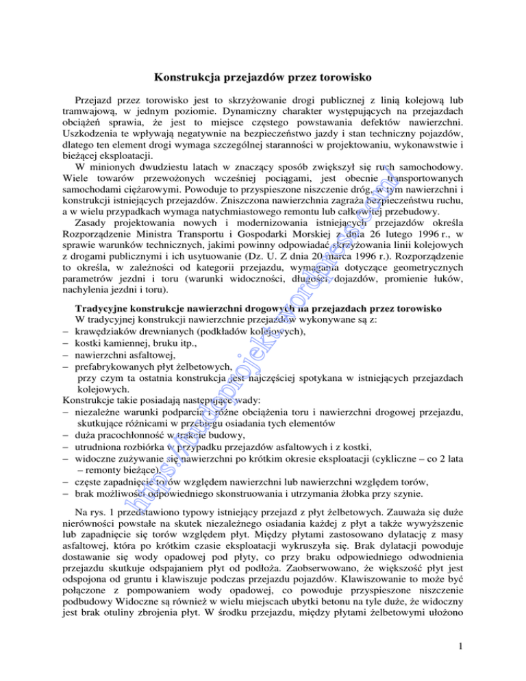 Konstrukcja przejazdów przez torowisko Przejazd przez torowisko jest to skrzyżowanie drogi publicznej z linią kolejową lub tramwajową, w jednym poziomie. Dynamiczny charakter występujących na przejazdach obciążeń sprawia, że jest to miejsce częstego powstawania defektów nawierzchni. Uszkodzenia te wpływają negatywnie na bezpieczeństwo jazdy i stan techniczny pojazdów, dlatego ten element drogi wymaga szczególnej staranności w projektowaniu, wykonawstwie i bieżącej eksploatacji. W minionych dwudziestu latach w znaczący sposób zwiększył się ruch samochodowy. Wiele towarów przewożonych wcześniej pociągami, jest obecnie transportowanych samochodami ciężarowymi. Powoduje to przyspieszone niszczenie dróg, w tym nawierzchni i konstrukcji istniejących przejazdów. Zniszczona nawierzchnia zagraża bezpieczeństwu ruchu, a w wielu przypadkach wymaga natychmiastowego remontu lub całkowitej przebudowy. Zasady projektowania nowych i modernizowania istniejących przejazdów określa Rozporządzenie Ministra Transportu i Gospodarki Morskiej z dnia 26 lutego 1996 r., w sprawie warunków technicznych, jakimi powinny odpowiadać skrzyżowania linii kolejowych z drogami publicznymi i ich usytuowanie (Dz. U. Z dnia 20 marca 1996 r.). Rozporządzenie to określa, w zależności od kategorii przejazdu, wymagania dotyczące geometrycznych parametrów jezdni i toru (warunki widoczności, długości dojazdów, promienie łuków, nachylenia jezdni i toru). Tradycyjne konstrukcje nawierzchni drogowych na przejazdach przez torowisko W tradycyjnej konstrukcji nawierzchnie przejazdów wykonywane są z: − krawędziaków drewnianych (podkładów kolejowych), − kostki kamiennej, bruku itp., − nawierzchni asfaltowej, − prefabrykowanych płyt żelbetowych, przy czym ta ostatnia konstrukcja jest najczęściej spotykana w istniejących przejazdach kolejowych. Konstrukcje takie posiadają następujące wady: − niezależne warunki podparcia i różne obciążenia toru i nawierzchni drogowej przejazdu, skutkujące różnicami w przebiegu osiadania tych elementów − duża pracochłonność w trakcie budowy, − utrudniona rozbiórka w przypadku przejazdów asfaltowych i z kostki, − widoczne zużywanie się nawierzchni po krótkim okresie eksploatacji (cykliczne – co 2 lata – remonty bieżące), − częste zapadnięcie torów względem nawierzchni lub nawierzchni względem torów, − brak możliwości odpowiedniego skonstruowania i utrzymania żłobka przy szynie. Na rys. 1 przedstawiono typowy istniejący przejazd z płyt żelbetowych. Zauważa się duże nierówności powstałe na skutek niezależnego osiadania każdej z płyt a także wywyższenie lub zapadnięcie się torów względem płyt. Między płytami zastosowano dylatację z masy asfaltowej, która po krótkim czasie eksploatacji wykruszyła się. Brak dylatacji powoduje dostawanie się wody opadowej pod płyty, co przy braku odpowiedniego odwodnienia przejazdu skutkuje odspajaniem płyt od podłoża. Zaobserwowano, że większość płyt jest odspojona od gruntu i klawiszuje podczas przejazdu pojazdów. Klawiszowanie to może być połączone z pompowaniem wody opadowej, co powoduje przyspieszone niszczenie podbudowy Widoczne są również w wielu miejscach ubytki betonu na tyle duże, że widoczny jest brak otuliny zbrojenia płyt. W środku przejazdu, między płytami żelbetowymi ułożono 1 pas nawierzchni asfaltowej, co spowodowało kolejne nierówności, szczególnie w miejscach styku płyt z asfaltobetonem. Widoczne jest wielokrotne uzupełnianie ubytków nawierzchni. Uzupelnienia ubytków nawierzchni asfaltowej Obrzeże płyty kształtownik metalowy - widoczne pionowe przemieszczenie względem szyny Szczelina powstała w wyniku korozji dylatacji Ubytki betonu Poziome przesunięcie płyt Rys. 1. Uszkodzenia przejazdu kolejowego z prefabrykowanych płyt żelbetowych Na rys. 2 przedstawiono stosowane w omawianym typie przejazdów zabezpieczenia przed przesuwaniem się płyt w poziomie. Są to drewniane belki przybite do podkładów kolejowych i drewniane elementy dystansowe przy szynie. Zabezpieczenia takie są wadliwe, a nawet niebezpieczne. Płyty w czasie eksploatacji przesuwają się w kierunku poziomym, co pokazano na rys. 3. Rys. 2. Sposób blokowania bocznego płyty Stosowane tramwajowe obecnie rozwiązania Rys.3. Przemieszczenie pionowe płyt konstrukcyjne przejazdów przez torowisko 2 W poszukiwaniach optymalnych rozwiązań przejazdów skoncentrowano się przede wszystkim na zapewnieniu takich warunków podparcia torów i nawierzchni drogowej, które zapewniłyby zlikwidowanie różnic w osiadaniu elementów przejazdu. Pozytywnym przykładem w rozwiązaniach konstrukcji przejazdów tramwajowych jest tzw. „tor węgierski”. Zastosowano tutaj płytę żelbetową jako nośną konstrukcję zarówno dla toru jak i nawierzchni drogowej. W rezultacie osiadanie toru i nawierzchni jest równomierne, wpływa na polepszenie parametrów eksploatacyjnych i zwiększenie trwałości przejazdu. W tej technologii wykonano m. in. przejazdy przez tory tramwajowe w Częstochowie (rys. 4). Zastosowanie tych przejazdów znacznie poprawiło płynność ruchu samochodowego na ruchliwych skrzyżowaniach. Jako wadę tego rozwiązania uważa się skokową zmianę sztywności podparcia toru w przekroju podłużnym, co może spowodować powstawanie dodatkowych naprężeń w szynach w miejscach zmiany tej sztywności. Po kilku latach eksploatacji nie zaobserwowano jednak widocznych różnic w osiadaniu torowiska w obrębie przejazdu i poza nim. Rys. 4. Nawierzchnia przejazdu tramwajowego na skrzyżowaniu z al. Jana Pawła II w Częstochowie Nawierzchnię tego przejazdu stanowią płyty żelbetowe. Zastosowana podbudowa minimalizuje różnice osiadania elementów przejazdu, przez co wyeliminowane zostały opisane wcześniej uszkodzenia. Powierzchni płyt nadano odpowiednio szorstką fakturę (rys. 5). Większe uszkodzenia za