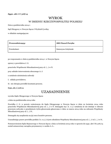 Sygn. akt: I C 518/14 WYROK W IMIENIU RZECZYPOSPOLITEJ POLSKIEJ Dnia 9 października 2014 r. Sąd Okręgowy w Nowym Sączu I Wydział Cywilny w składzie następującym: Przewodniczący: SSO Paweł Poręba Protokolant: Katarzyna Gołyźniak po rozpoznaniu w dniu 9 października 2014 r. w Nowym Sączu sprawy z powództwa J. G. przeciwko Wspólnocie Mieszkaniowej przy ul. (...) w N. przy udziale interwenienta ubocznego A. J. o ustalenie nieistnienia uchwały I. oddala powództwo; II. nie obciąża powódki kosztami procesu. Sygn. akt. C 518/14 UZASADNIENIE wyroku Sądu Okręgowego w Nowym Sączu z dnia 09 października 2014 roku Powódka J. G. w pozwie wniesionym do Sądu Okręgowego w Nowym Sączu w dniu 22 kwietnia 2014 roku przeciwko Wspólnocie Mieszkaniowej przy ul. (...) w N. domagała się ( k. 1-4 ) ustalenia że nie istnieje w obrocie prawnym uchwała w przedmiocie trybu głosowania głosowana w dniu 12 marca 2014 roku na zebraniu Wspólnoty Mieszkaniowej przy ul. (...) N.. Domagała się zasądzenia na jej rzecz kosztów procesu. Uzasadniając pozew powódka podała ( k. 2-4 ), iż jest członkiem Wspólnoty Mieszkaniowej przy ul. (...) i ul. (...) w N.. Postanowieniem Sądu Rejonowego w Nowym Sączu z dnia 12 kwietnia 2013 roku w sprawie do sygn. akt I Ns 376/13 został ustanowiony zarządca przymusowy w osobie A. Ł.. Zarządca na dzień 12 kwietnia 2013 roku zwołał zebranie właścicieli lokali pozwanej wspólnoty, którego przedmiotem miało być między innymi zatwierdzenie sprawozdania finansowego za 2013 rok oraz ustalenie planu gospodarczego na 2014 rok. Zdaniem powódki zebranie zwołane zostało wadliwie, gdyż powódka nie została powiadomiona o zebraniu, zaś inny członek wspólnoty, tj. E. S. (1) otrzymała zawiadomienie w dniu 10 marca 2014 roku, a więc zaledwie na dwa dni przed jego terminem. Powódka zarzuciła, że zebranie zarządca prowadził w sposób urągający wszelkim zasadom pełnienia funkcji zarządcy. Zebranie z dnia 12 marca 2014 roku zarządca rozpoczął od poddania pod głosowanie uchwały dotyczącej trybu podejmowanych uchwał przy założeniu, iż na każdego właściciela przypada jeden głos. Uchwała ta nie precyzowała przy tym spraw przy głosowaniu, których miałby obowiązywać zmieniony sposób liczenia większości głosów. Według powódki niewłaściwie zliczone zostały przez zarządcę głosy w wyniku głosowania nad wskazaną uchwałą, gdyż głosy zliczono przy założeniu, iż na każdego właściciela przypada jeden głos. Powódka podkreśliła, iż powyższe uchybienia uzasadniają przekonanie, że przedmiotowa uchwała pomimo jej zaprotokołowania jest uchwałą nieistniejącą. Jej treść nie nadaje się bowiem do konwalidacji a jej funkcjonowanie w obrocie prawnych stanowi obrazę elementarnych zasad działania wspólnot mieszkaniowych. Reprezentujący Wspólnotę Mieszkaniową przy ul.(...) w N. zarządca A. Ł. pomimo wezwania ( k. 32 w zw. z k. 33,38-42 ) nie złożył odpowiedzi na pozew. W piśmie z dnia 11 lipca 2014 roku ( k. 50 ) zarządca A. Ł. przedłożył tekst zaskarżonej uchwały opatrzonej nr 1/2014, listę obecności i załącznik do uchwały ( 50-54 ). Wyjaśnił także, że zebranie z dnia 12 marca 2014 roku zostało przez niego rozwiązane z uwagi na bezczelne i lekceważące zachowanie członka Wspólnoty E. S. (1). Na rozprawie z dnia 09 października 2014 roku powódka J. G. podtrzymała pozew w przedmiocie ustalenia nieistnienia uchwały nr 1/2014 głosowanej na zebraniu z dnia 12 marca 2014 roku ( k. 84/2 od 00:10:03 ). A. Ł. imieniem strony pozwanej na rozprawie z dnia 09 października 2014 roku wniósł o oddalenie powództwa ( k. 84/2 od 00:18:44 ). Do udziału w sprawie w charakterze interwenienta ubocznego po stronie pozwanej zgłosiła się członek Wspólnoty Mieszkaniowej przy ul. (...) w N. A. J. ( k. 56-57 ), uzasadniając swój interes prawny potrzebą korzystnego rozstrzygnięcia na rzecz strony pozwanej. A. J. zarzuciła, że powódka i jej matka E. S. (1) notorycznie podejmują działania mające doprowadzić do niepodjęcia uchwał w sprawach głosowanych na zebraniu Wspólnoty. Powódka J. G. zgłosiła ( k. 71-72) na piśmie przed rozprawą z dnia 09 października 2014 roku opozycję do interwencji ubocznej A. J., zarzucając, że A. J. nie ma interesu prawnego w rozstrzygnięciu sprawy na jej korzyść. Na rozprawie z dnia 09 października 2014 roku powódka J. G. cofnęła złożoną opozycję ( k. 84 od 00:07:03). A. Ł. nie sprzeciwił się cofnięciu opozycji ( k. 84 od 00:07:51) i w tym zakresie Sąd umorzył postępowanie w przedmiocie opozycji J. G. ( k. 87 ). Przed Sądem strony nie zawarły ugody i podtrzymały do końca swoje stanowiska procesowe. Sąd ustalił następujący stan faktyczny: Powódka J. G. i jej matka E. S. (1) są współwłaścicielami większości lokali na nieruchomościach przy ul. (...) i ul. (...) w N. i ich udział w nieruchomości wspólnej wynosi łącznie (...). A. J., K. K. i G. K. są współwłaścicielami po 1/3 części pięciu lokali na nieruchomościach przy ul. (...) i ul. (...) w N. i mają (...) udziałów w nieruchomości wspólnej. Z kolei Zrzeszenie (...) w N. jest właścicielem dwóch lokali na nieruchomościach przy ul. (...) i ul. (...) w N. i dysponuje (...) udziałów w nieruchomości wspólnej. Powódka J. G. oraz E. S. (1), A. J., K. K., G. K. i Zrzeszenie (...) w N. są członkami pozwanej Wspólnoty Mieszkaniowej przy ul. (...) i ul. (...) w N.. Dowód: / kserokopie odpisu z księgi wieczystej KW nr (...), k. 5-24; fakty znane Sądowi z urzędu z racji rozpoznawania sprawy I C 184/12 /. Sposób zarządu nieruchomością wspólną przy ul. (...) i ul. (...) w N. został szczegółowo ustalony w umowie sporządzonej w formie aktu notarialnego z dnia 21 grudnia 2007 roku, rep. A nr 9638/2007. Zgodnie z tą umową ( § 4 ) właściciele lokali na podstawie art. 18 ust. 1 ustawy z dnia 24 czerwca 1994 roku zarząd ni