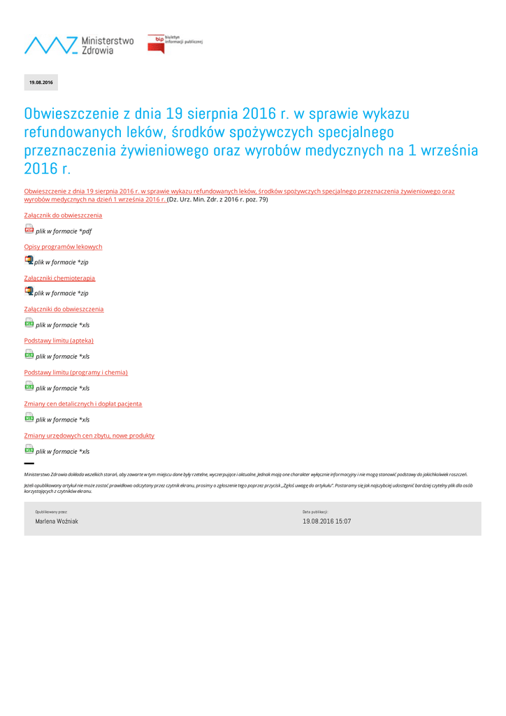 19.08.2016 Obwieszczenie z dnia 19 sierpnia 2016 r. w sprawie wykazu refundowanych leków, środków spożywczych specjalnego przeznaczenia żywieniowego oraz wyrobów medycznych na 1 września 2016 r. Obwieszczenie z dnia 19 sierpnia 2016 r. w sprawie wykazu refundowanych leków, środków spożywczych specjalnego przeznaczenia żywieniowego oraz wyrobów medycznych na dzień 1 września 2016 r. (Dz. Urz. Min. Zdr. z 2016 r. poz. 79) Załącznik do obwieszczenia plik w formacie *pdf Opisy programów lekowych plik w formacie *zip Załączniki chemioterapia plik w formacie *zip Załączniki do obwieszczenia plik w formacie *xls Podstawy limitu (apteka) plik w formacie *xls Podstawy limitu (programy i chemia) plik w formacie *xls Zmiany cen detalicznych i dopłat pacjenta plik w formacie *xls Zmiany urzędowych cen zbytu, nowe produkty plik w formacie *xls Ministerstwo Zdrowia dokłada wszelkich starań, aby zawarte w tym miejscu dane były rzetelne, wyczerpujące i aktualne. Jednak mają one charakter wyłącznie informacyjny i nie mogą stanowić podstawy do jakichkolwiek roszczeń. Jeżeli opublikowany artykuł nie może zostać prawidłowo odczytany przez czytnik ekranu, prosimy o zgłoszenie tego poprzez przycisk „Zgłoś uwagę do artykułu”. Postaramy się jak najszybciej udostępnić bardziej czytelny plik dla osób korzystających z czytników ekranu. Opublikowany przez: Data publikacji: Marlena Woźniak 19.08.2016 15:07