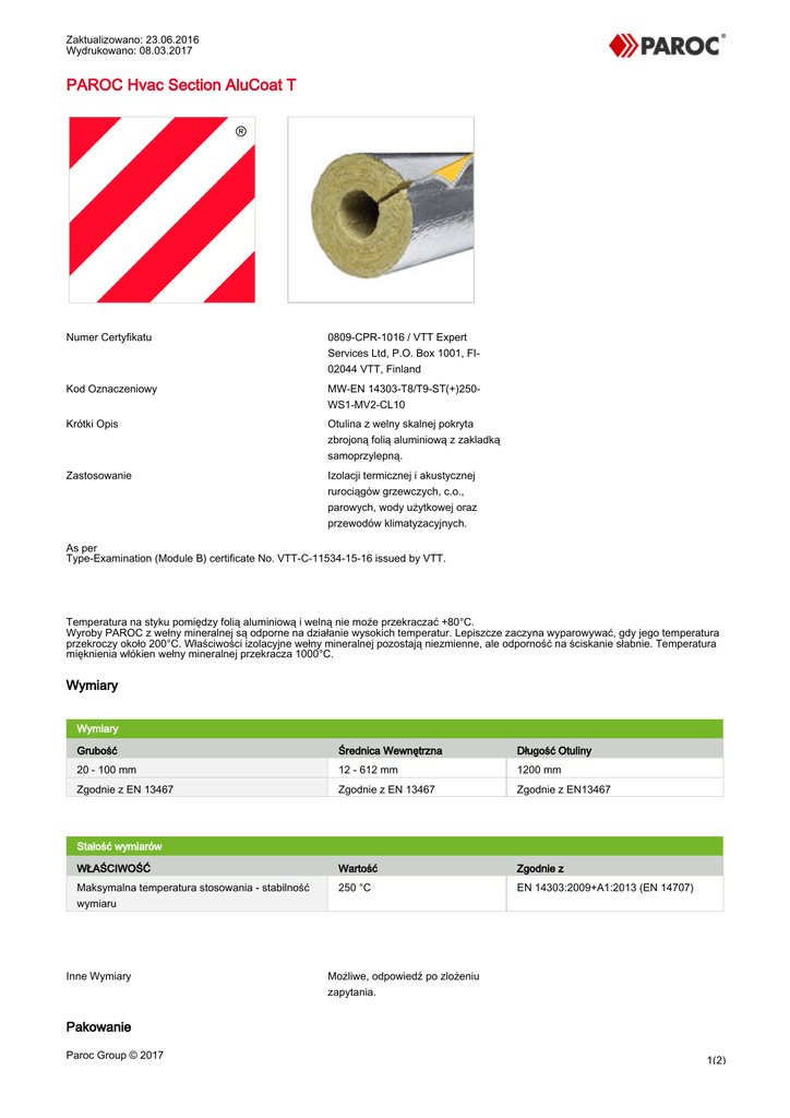 Zaktualizowano: 23.06.2016 Wydrukowano: 08.03.2017 PAROC Hvac Section AluCoat T Numer Certyfikatu 0809-CPR-1016 / VTT Expert Services Ltd, P.O. Box 1001, FI02044 VTT, Finland Kod Oznaczeniowy MW-EN 14303-T8/T9-ST(+)250WS1-MV2-CL10 Krótki Opis Otulina z welny skalnej pokryta zbrojoną folią aluminiową z zakladką samoprzylepną. Zastosowanie Izolacji termicznej i akustycznej rurociągów grzewczych, c.o., parowych, wody użytkowej oraz przewodów klimatyzacyjnych. As per Type-Examination (Module B) certificate No. VTT-C-11534-15-16 issued by VTT. Temperatura na styku pomiędzy folią aluminiową i welną nie może przekraczać +80°C. Wyroby PAROC z wełny mineralnej są odporne na działanie wysokich temperatur. Lepiszcze zaczyna wyparowywać, gdy jego temperatura przekroczy około 200°C. Właściwości izolacyjne wełny mineralnej pozostają niezmienne, ale odporność na ściskanie słabnie. Temperatura mięknienia włókien wełny mineralnej przekracza 1000°C. Wymiary Wymiary Grubość Średnica Wewnętrzna Długość Otuliny 20 - 100 mm 12 - 612 mm 1200 mm Zgodnie z EN 13467 Zgodnie z EN 13467 Zgodnie z EN13467 WŁAŚCIWOŚĆ Wartość Zgodnie z Maksymalna temperatura stosowania - stabilność wymiaru 250 °C EN 14303:2009+A1:2013 (EN 14707) Stałość wymiarów Inne Wymiary Możliwe, odpowiedź po zlożeniu zapytania. Pakowanie Paroc Group © 2017 1(2) Zaktualizowano: 23.06.2016 Wydrukowano: 08.03.2017 Rodzaj opakowania Karton, Folia plastikowa Opakowanie na Życzenie Kartony/ folia plastikowa Wymiar Pojedynczej Paczki Karton 300 x 400 x 1200 mm Wymiar Palety 1200 x 1200 mm Więcej informacji TRANSPORT: W czasie transportu opakowania powinny być zabezpieczone przed przesuwaniem i uszkodzeniami mechanicznymi. PRZECHOWYWANIE: W czasie magazynowania rulony należy układać na równym podłożu w pozycji leżącej, maksymalnie do wysokości 2m. Pomieszczenia magazynowe i środki transportowe powinny skutecznie zabezpieczać wyroby przed wilgocią i opadami atmosferycznymi. Właściwości ogniochronne Reakcja na ogień WŁAŚCIWOŚĆ Wartość Zgodnie z Euroklasa Reakcji na Ogień A2L - s1, d0 EN 14303:2009+A1:2013 (EN 13501-1) WŁAŚCIWOŚĆ Wartość Zgodnie z Palność Produkt podstawowy- niepalny EN ISO 1182 WŁAŚCIWOŚĆ Wartość Zgodnie z Deklarowana Przewodność Cieplna w 10 °C, λ10 0,034 W/mK EN 14303:2009+A1:2013 (EN ISO 8497) Deklarowana Przewodność Cieplna w 50 °C, λ50 0,037 W/mK EN 14303:2009+A1:2013 (EN ISO 8497) Deklarowana Przewodność Cieplna w 100 °C, λ100 0,044 W/mK EN 14303:2009+A1:2013 (EN ISO 8497) Wymiary i tolerancje T8 dla średnicy zewnętrznej < 150 mm, T9 dla średnicy zewnętrznej ≥ 150 mm EN 14303:2009+A1:2013 WŁAŚCIWOŚĆ Wartość Zgodnie z Nasiąkliwość wodą (krótkotrwała) WS, Wp ≤ 1 kg/m² EN 14303:2009+A1:2013 (EN 13472) WŁAŚCIWOŚĆ Wartość Zgodnie z Opór dyfuzyjny pary wodnej MV2 EN 14303:2009+A1:2013 (EN 13469) Inne właściwości ogniowe Właściwości termiczne Opór cieplny Właściwości wilgotnościowe Przepuszczalność wody Przepuszczalność pary wodnej Szybkość uwalniania substancji korozyjnych Śladowe ilości jonów rozpuszczalnych w wodzie jonów i wartość pH WŁAŚCIWOŚĆ Wartość Zgodnie z Jony Chlorków, Cl- < 10 ppm EN 14303:2009+A1:2013 (EN 13468) Trwałość parametrów Paroc Group © 2017 2(2) Zaktualizowano: 23.06.2016 Wydrukowano: 08.03.2017 Niezmienność reakcji na ogień z upływem czasu/ degradacji Właściwości ogniowe wełny mineralnej nie pogarszają się z upływem czasu. Klasyfikacja Europejska produktów jest związana z zawartością organicznego lepiszcza, która nie zwiększa się z upływem czasu. Niezmienność reakcji na ogień w wysokich temperatur Właściwości ognioodporne wełny kamiennej nie pogarszają się w wysokiej temperaturze. Klasyfkiacja ogniowa produktu jest powiązana z zawartością związków organicznych, która pozostaje na stałym poziomie lub zmniejsza się w wyższej temperaturze. Niezmienność oporu cieplnego z upływem czasu/ degradacja Przewodność cieplna produktów z wełny mineralnej jest niezmienna w czasie, lata doświadczeń wykazały, że włókna strukturalne są stabilne a w porach wyrobu nie znajdują się inne gazy oprócz powietrza atmosferycznego Niezmienność oporu cieplnego wysokich temperaturach Przewodność cieplna produktów z wełny mineralnej jest niezmienna w czasie, lata doświadczeń wykazały, że włókna strukturalne są stabilne a w porach wyrobu nie znajdują się inne gazy oprócz powietrza atmosferycznego Pokrycie Pokrycie Zbrojona folia aluminiowa. Taśma samoprzylepna. PAROC POLSKA Sp. z o.o., ul.Gnieznienska 4, 62-240 Trzemeszno, Tel. +48 61 468 2190, Fax +48 61 468 2362, www.paroc.pl Informacje zawarte w niniejszej broszurze opisują warunki i właściwości techniczne przedstawionych produktów, obowiązujące w momencie publikacji tego dokumentu, do czasu zastąpienia go przez nowszą wersję drukowaną lub cyfrową. Najnowsza wersja tej broszury jest zawsze dostępna na stronie internetowej firmy Paroc. Nasz materiał informacyjny przedstawia zastosowania, dla których funkcje i właściwości techniczne naszych produktów zostały zatwierdzone. Jednakże informacje te nie są równoznaczne z udzieleniem gwarancji handlowej. Nie bierzemy odpowiedzialności za komponenty innych producentów użytych w danym zastosowaniu lub podczas instalacji naszych produktów. Nie gwarantujemy właściwości naszych produktów, jeżeli są one stosowane w obszarze lub w warunkach, które nie zostały uwzględnione w naszych materiałach informacyjnych. Z powodu ciągłego rozwoju naszych produktów, zastrzegamy sobie prawo do wprowadzania zmian w naszym materiale informacyjnym w dowolnym momencie. PAROC jest zastrzeżonym znakiem towarowym firmy Paroc Group. This data sheet is valid in following countries: Poland. Paroc Group © 2017 3(2)