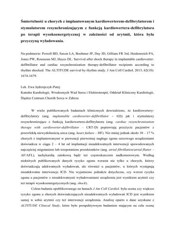 Śmiertelność u chorych z implantowanym kardiowerterem-defibrylatorem i stymulatorem resynchronizującym z funkcją kardiowertera-defibrylatora po terapii wysokoenergetycznej w zależności od arytmii, która była przyczyną wyładowania. Na podstawie: Powell BD, Saxon LA, Boehmer JP, Day JD, Gilliam FR 3rd, Heidenreich PA, Jones PW, Rousseau MJ, Hayes DL. Survival after shock therapy in implantable cardioverterdefibrillator and cardiac resynchronization therapy-defibrillator recipients according to rhythm shocked. The ALTITUDE survival by rhythm study. J Am Coll Cardiol. 2013; 62(18): 1674-1679. Lek. Ewa Jędrzejczyk-Patej Katedra Kardiologii, Wrodzonych Wad Serca i Elektroterapii, Oddział Kliniczny Kardiologii, Śląskie Centrum Chorób Serca w Zabrzu W wielu publikowanych badaniach klinicznych dowiedziono, że kardiowerterydefibrylatory (ang. implantable cardioverter-defibrillator – ICD) jak i stymulatory resynchronizujące z funkcją kardiowertera-defibrylatora (ang. cardiac resynchronization therapy with cardioverter-defibrillator – CRT-D) poprawiają przeżycie pacjentów z przewlekłą niewydolnością serca (ang. heart failure – HF). Nie mniej jednak około 10 – 17 % chorych z implantowanymi w prewencji pierwotnej nagłego zgonu sercowego urządzeniami doświadcza w ciągu 2 – 4 lat od implantacji nieadekwatnych interwencji spowodowanych najczęściej migotaniem lub trzepotaniem przedsionków (ang. atrial fibrillation/atrial flutter – AF/AFL), tachykardią zatokową bądź też częstoskurczem nadkomorowym. Według niektórych publikowanych danych ryzyko zgonu wzrasta nie tylko u chorych, którzy doświadczają adekwatnych wyładowań, ale również u pacjentów, u których występują nieadekwatne interwencje ICD. Nie wyjaśniono jednakże dotychczas, czy wzrost ryzyka zgonu u pacjentów z nieadekwatnymi wyładowaniami urządzenia jest wynikiem arytmii czy też terapii wysokoenergetycznych (ang. shock). Celem badania opublikowanego na łamach J Am Coll Cardiol. była ocena czy większe ryzyko zgonu u chorych doświadczających nieadekwatnych wyładowań ICD jest wynikiem samej w sobie arytmii czy też interwencji urządzenia. Analizę oparto o dane uzyskane z ALTITUDE Clinical Study, które było prospektywnym badaniem mającym na celu ocenę danych uzyskanych z telemonitoringu u pacjentów z implantowanym CRT-D bądź ICD. Do badania i systemu telemetrycznego monitorowania chorych (LATITUDE, Boston Scientific Corp., Natick, Massachusetts) w 1550 ośrodkach w Stanach Zjednoczonych włączono 127 134 badanych z ICD lub CRT-D. Łącznie u 28 398 pacjentów wystąpiła 1 lub więcej terapii wysokoenergetycznych, a spośród tych chorych losowo wybrano 3809 (13.4 %) badanych, których dane poddano analizie. Celem badania było porównanie przeżycia pacjentów, u których wystąpiły wyładowania w zależności od zaburzenia rytmu, które je wywołało oraz porównanie śmiertelności chorych z i bez interwencji. Zastosowano dwie metody analizy danych: analizę czasu od pierwszej terapii wysokoenergetycznej do zgonu oraz analizę typu matched-pair porównującą pacjentów z i bez wyładowań. Do każdego chorego z interwencją wysokoenergetyczną dopasowano podobnego w zakresie charakterystyki klinicznej (wiek w trakcie implantacji, płeć, typ urządzenia ICD/CRT-D, rok wszczepienia i czas od implantacji do pierwszej telemetrycznej transmisji) pacjenta bez terapii ICD. Średni okres obserwacji chorych po implantacji urządzenia wynosił 3.1 ± 1.7 lat oraz 2.1 ± 0.4 lat po pierwszym wyładowaniu. Średni wiek badanych był równy 64 ± 13 lat, 78 % populacji stanowili mężczyźni. Pacjenci z CRT-D byli istotnie starsi w porównaniu z chorymi z ICD. Spośród 3809 badanych 950 (24.9 %) chorych miało implantowane jednojamowe ICD, 1318 (34.6 %) pacjentów miało dwujamowe ICD, a 1541 (40.5 %) badanych miało wszczepione CRT-D. Nieskuteczna terapia antytachyarytmiczna (ang. antytachycardia pacing – ATP) poprzedzała wyładowanie u 1118 (29.4 %) pacjentów. U 58.7 % badanych pierwsza interwencja była adekwatną terapią spowodowaną utrwaloną arytmią komorową, a u 41.3 % pacjentów była to nieadekwatna terapia wysokoenergetyczna spowodowana inną niż komorowa arytmią. Najczęstszą przyczyną adekwatnych wyładowań był monomorficzny częstoskurcz komorowy (ang. ventricular tachycardia – VT), a w następnej kolejności migotanie komór (ang. ventricular fibrillation – VF) i polimorficzny częstoskurcz komorowy. Najczęstszą przyczyną nieadekwatnych terapii było natomiast migotanie/trzepotanie przedsionków, a w następnej kolejności tachykardia zatokowa lub częstoskurcz nadkomorowy. Przyczyny inne niż arytmia, takie jak szumy na elektrodzie, oversensing czy artefakty sygnału spowodowały 5 % interwencji ICD. Stwierdzono wyższe ryzyko zgonu w grupie chorych, u których pierwsze wyładowanie było spowodowane komorowym zaburzeniem rytmu w porównaniu z pacjentami, u których pierwszy shock był wynikiem arytmii nadkomorowej. Porównanie chorych z ICD, którzy w trakcie okresu obserwacji mieli wyładowanie spowodowane monomorficznym VT z pacjentami, u których terapia wysokoenergetyczna była wynikiem polimorficznego VT lub VF wykazało istotnie wyższe ryzyko zgonu w tej drugiej grupie badanych (HR: 1.35; 95 % CI: 1.01 – 1.81). W przeciwieństwie do chorych z ICD, w subpopulacji pacjentów z implantowanym CRT-D nie wykazano, by przeżycie różniło się znamiennie statystycznie pomiędzy chorymi z terapiami spowodowanymi polimorficznym VT, VF czy też monomorficznym VT (HR: 0.99; 95 % CI: 0.78 – 1.28). W porównaniu z pacjentami z terapią spowodowaną monomorficznym VT śmiertelność była niższa w grupie chorych z nieadekwatną interwencją spowodowaną tachykardią zatokową lub częstoskurczem nadkomorowym (HR: 0.60; 95 % CI: 0.47 – 0.76), a także u chorych z wyładowaniem spowodowanym inną niż arytmia przyczyną (HR: 0.49; 95 % CI