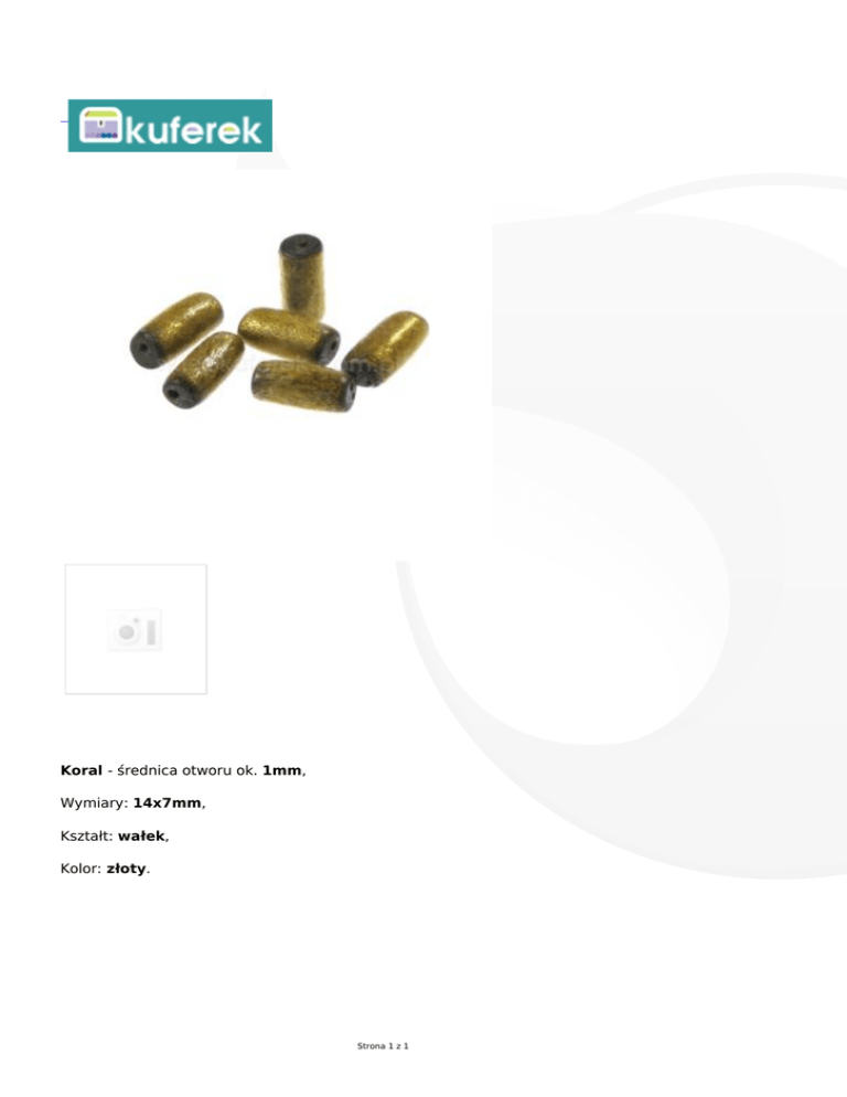 Koral - średnica otworu ok. 1mm, Wymiary: 14x7mm, Kształt: wałek, Kolor: złoty. Strona 1 z 1