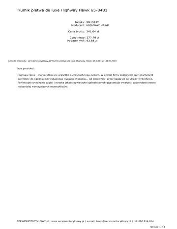 Tłumik płetwa de luxe Highway Hawk 65-8481 Indeks: SM13837 Producent: HIGHWAY HAWK Cena brutto: 341.64 zł Cena netto: 277.76 zł Podatek VAT: 63.88 zł Link do produktu: serwismotocyklowy.pl/Tlumik-pletwa-de-luxe-Highway-Hawk-65-8481,p,13837.html Opis produktu: Highway Hawk - marka która wie wszystko o częściach typu custom. W ofercie firmy znajdziecie cały asortyment potrzebny do nadania indywidualnego wyglądu choppera... od kierownicy, przez bagaż aż po układy wydechowe. Perfekcyjne wykonanie części i wysoka jakość powierzchni galwanicznych gwarantuje trwałość i zadowolenie nawet najbardziej wymagających motocyklistów. SERWISMOTOCYKLOWY.pl | www.serwismotocyklowy.pl | e-mail: [email protected] | tel. 606 814 814 Strona 1 z 1
