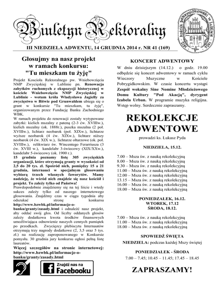 Biuletyn Rektoralny III NIEDZIELA ADWENTU, 14 GRUDNIA 2014 r. NR 41 (169) Głosujmy na nasz projekt w ramach konkursu: "Tu mieszkam tu żyję" Projekt Koscioła Rektoralnego pw. Wniebowzięcia NMP Zwycięskiej w Lublinie pn. Renowacja zabytków ruchomych z ekspozycji historycznej w kościele Wniebowzięcia NMP Zwycięskiej w Lublinie - wotum króla Władysława Jagiełły za zwycięstwo w Bitwie pod Grunwaldem ubiega się o grant w konkursie "Tu mieszkam, tu żyję", organizowanym przez Fundację Banku Zachodniego WBK. W ramach projektu do renowacji zostały wytypowane zabytki: kielich mszalny z pateną (2-3 ćw. XVIIIw.), kielich mszalny (ok. 1888r.), puszka mszalna (2 poł. XVIIIw.), lichtarz neobarok (poł. XIXw.), lichtarze wyższe neobarok (4 ćw. XIXw.), lichtarz niższy neobarok (4 ćw. XIX w.), lichtarze ołtarzowe (ok. poł. XVIIIw.), relikwiarz św. Wincentego Ferarriusza (3 ćw. XVIII w.), kandelabr 3-świecowy (XIX/XXw.), kandelabr 5-świecowy (ok. 1900 r.). 15 grudnia poznamy listę 305 zwycięskich organizacji, które otrzymają granty w wysokości od 2,5 do 20 tys. zł. Spośród nich, pomiędzy 15 a 21 grudnia, internauci w specjalnym głosowaniu wybiorą trzech własnych faworytów. Mamy nadzieję, że wśród nich znajdzie się nasz kościół i projekt. To załeży tylko od Państwa! Prawdopodobnie znajdziemy się na tej liście i wtedy sukces zależy tylko od naszego internetowego głosowania. Znajdźmy czas w ciągu tygodnia aby odszukać stronę konkursu http://www.bzwbk.pl/informacje-obanku/granty/zasady.html i odnaleźć nasz projekt, aby oddać swój głos. Od liczby oddanych głosów zależy dodatkowa kwota środków finansowych umożliwiająca odnowienie naszych cennych pamiątek po przodkach. Zwycięzcy plebiscytu Internautów otrzymają trzy nagrody dodatkowe (2, 3,5 oraz 5 tys. zł.) na realizację zaproponowanego w Konkursie pomysłu. 30 grudnia jury konkursu ogłosi pełną listę laureatów. Więcej szczegółów na stronie internetowej: http://www.bzwbk.pl/informacje-obanku/granty/zasady.html KONCERT ADWENTOWY W dniu dzisiejszym (14.12.) o godz. 19.00 odbędzie się koncert adwentowy w ramach cyklu Wieczory Muzyczne w Kościele Pobrygidkowskim. W czasie koncertu wystąpi Zespół wokalny Sine Nomine Młodzieżowego Domu Kultury "Pod Akacją", dyrygent Izabela Urban. W programie muzyka religijna. Wstęp wolny. Serdecznie zapraszamy. REKOLEKCJE ADWENTOWE prowadzi ks. Łukasz Pyda NIEDZIELA, 15.12. 7.00 – Msza św. z nauką rekolekcyjną 8.00 – Msza św. z nauką rekolekcyjną 9.30 – Msza św. z nauką rekolekcyjną 11.00 – Msza św. z nauką rekolekcyjną 12.00 – Msza św. z nauką rekolekcyjną 13.15 – Msza św. z nauką rekolekcyjną 16.00 – Msza św. z nauką rekolekcyjną 18.00 – Msza św. z nauką rekolekcyjną PONIEDZAŁEK, 16.12. WTOREK, 17.12 ŚRODA, 18.12. 7.00 – Msza św. z nauką rekolekcyjną 11.00 – Msza św. z nauką rekolekcyjną 18.00 – Msza św. z nauką rekolekcyjną SPOWIEDŹ ŚWIĘTA NIEDZIELA: podczas każdej Mszy świętej PONIEDZIAŁEK - ŚRODA 7.00 – 7.45; 10.45 – 11.45; 17.45 – 18.45 ZAPRASZAMY! INTENCJE MSZALNE Poniedziałek, 15.12. 7.00 +Jadwiga Zarzycka – 15 Gregorianka 11.00 +Wojciech, Józef, Helena 18.00 +Mirosław Górecki – 15 Gregorianka Wtorek, 16.12. 7.00 +Jadwiga Zarzycka – 16 Gregorianka 11.00 +Mirosław Górecki – 16 Gregorianka 18.00 +Helena i Stanisław Środa, 17.12. 7.00 +Jadwiga Zarzycka – 17 Gregorianka 11.00 +Roman 18.00 +Mirosław Górecki – 17 Gregorianka Czwartek, 18.12. 7.00 +Jadwiga Zarzycka – 18 Gregorianka 7.30 +Janina, Stanisława(ę), Paweł, Stanisława(ę), Jan, Stanisław, Genowefa, Stanisław, Anna, Andrzej, Elżbieta 8.00 ZBIOROWA DO ŚW. JUDY TADEUSZA 11.00 +Lucjan Grudka (10r), Wiktoria, Piotr Grudka, Jan, Maria Mazur 18.00 +Mirosław Górecki – 18 Gregorianka 18.00 +Ewa (29r), Tatiana Piątek, 19.12. 7.00 +Jadwiga Zarzycka – 19 Gregorianka 7.30 W intencji ofiarodawców 11.00 ZBIOROWA DO ŚW. BRYGIDY 18.00 +Mirosław Górecki – 19 Gregorianka Sobota, 20.12. 7.00 +Jadwiga Zarzycka – 20 Gregorianka 7.30 11.00 +Karolina, Zofia, Janina 18.00 +Mirosław Górecki – 20 Gregorianka 18.00 +Michalina, Filip, Aleksander, Antonina, Helena 18.00 +Albina, Jan, Henryk, Edward IV NIEDZIELA ADWENTU, 21.12. 7.00 +Aniela, Władysław, Antonii, Sławomir, Janina 8.00 +Jadwiga Zarzycka – 21 Gregorianka 9.30 +Mirosław Górecki – 21 Gregorianka 11.00 +Antoni (30r) 11.00 +Maria Borkacka (2r), Leonard, Zuzanna zmarli z rodziny Sadurskich 12.00 O zdrowie, Boże błogosławieństwo, dary Ducha Świętego i opiekę Matki Bożej dla Alicji z racji 80 rocznicy urodzin 12.00 +Tadeusz Izdebski (2r) 13.15 +Józef Nowicki (12r) i zmarli z rodziny Nowickich, Kotów 13.15 +Łucja, Bogdan (6r) Krawczyńscy 16.00 +Bronisław Witkowski (10r), Adela Łucja 18.00 +Maria i Eugeniusz Bissinger, Regina i Jan Ćwierz Msze święte w intencji naszych bliskich zmarłych bądź w intencji osób żyjących (z okazji imienin, urodzin, rocznic zawarcia związku małżeńskiego) można zamawiać w zakrystii przed lub po każdej mszy świętej. OGŁOSZENIA III niedziela Adwentu, 14 grudnia 2014 roku ŚWIECE I OPŁATEK NA STÓŁ WIGILIJNY W okresie adwentu, z inicjatywy Caritas, w całej Archidiecezji Lubelskiej organizowana jest przedświąteczna zbiórka ofiar do puszek pod hasłem „Gwiazdka Nadziei” oraz Wigilijne Dzieło Pomocy Dzieciom, którego znakiem jest specjalna świeca. Małe i duże świece z napisem Caritas zadomowiły się na wigilijnych stołach wzbogacając bożonarodzeniową tradycję. Świece Caritas w cenie 5,00, 13,00 lub 15,00 zł i opłatek można będzie nabyć przy wyjściu z kościoła. Ofiary za opłatki przeznaczone są na spłatę zobowiązań powstałych po renowacji zabytkowych obrazów z prezbiterium świątyni. POBRYGIDKOWSKIE KALENDARZE NA ROK 2015 Przy wyjściu z kościoła można nabyć Kalendarz „Kościół Pobrygidkowski” na rok 2015. Koszt druku 