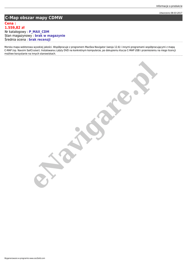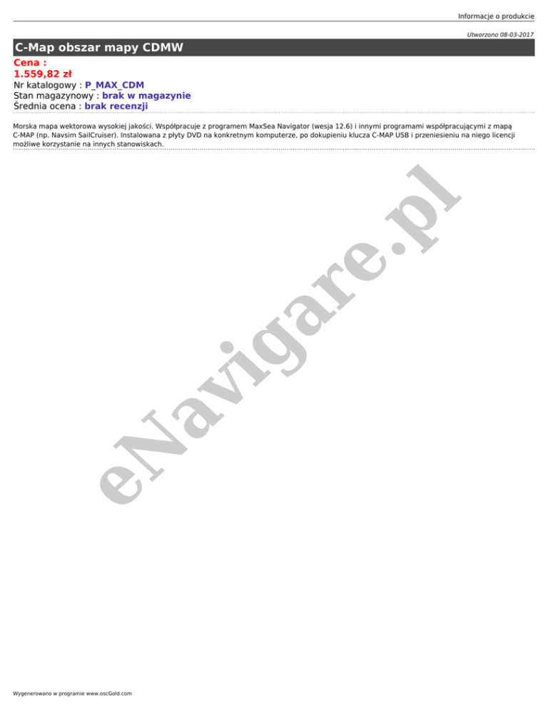 Informacje o produkcie Utworzono 08-03-2017 C-Map obszar mapy CDMW Cena : 1.559,82 zł Nr katalogowy : P_MAX_CDM Stan magazynowy : brak w magazynie Średnia ocena : brak recenzji eN av ig ar e. pl Morska mapa wektorowa wysokiej jakości. Współpracuje z programem MaxSea Navigator (wesja 12.6) i innymi programami współpracującymi z mapą C-MAP (np. Navsim SailCruiser). Instalowana z płyty DVD na konkretnym komputerze, po dokupieniu klucza C-MAP USB i przeniesieniu na niego licencji możliwe korzystanie na innych stanowiskach. Wygenerowano w programie www.oscGold.com