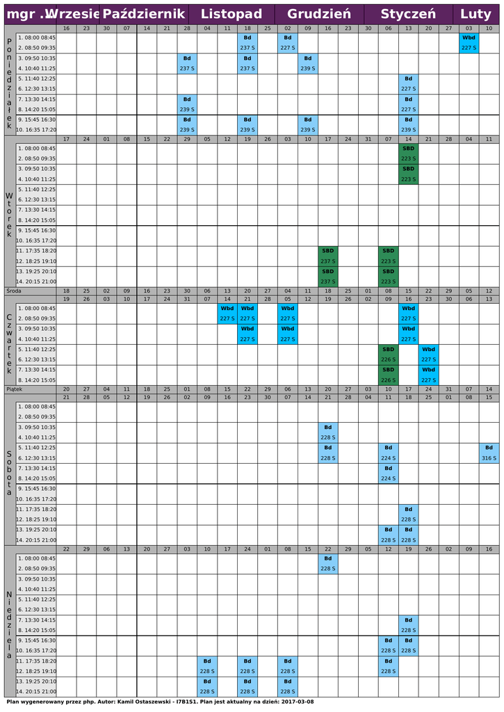 mgr ... Wrzesień Październik 16 P o n i e d z i a ł e k 07 14 21 28 Listopad 04 11 2. 08:50 09:35 18 Grudzień 25 02 Bd Bd 237 S 227 S 09 16 23 Styczeń 30 06 13 Bd Bd 4. 10:40 11:25 237 S 237 S 239 S 5. 11:40 12:25 Bd 6. 12:30 13:15 227 S 7. 13:30 14:15 Bd Bd 8. 14:20 15:05 239 S 227 S 9. 15:45 16:30 Bd Bd Bd Bd 10. 16:35 17:20 239 S 239 S 239 S 239 S 01 08 15 22 29 05 12 19 26 03 Luty 27 03 10 227 S Bd 24 20 Wbd 3. 09:50 10:35 10 17 24 31 07 14 1. 08:00 08:45 SBD 2. 08:50 09:35 223 S 3. 09:50 10:35 SBD 4. 10:40 11:25 223 S 21 28 04 11 5. 11:40 12:25 6. 12:30 13:15 7. 13:30 14:15 8. 14:20 15:05 9. 15:45 16:30 10. 16:35 17:20 11. 17:35 18:20 SBD SBD 12. 18:25 19:10 237 S 223 S 13. 19:25 20:10 SBD SBD 14. 20:15 21:00 237 S 223 S Środa C z w a r t e k 30 1. 08:00 08:45 17 W t o r e k 23 18 25 02 09 16 23 30 06 13 20 27 04 11 18 25 01 08 15 22 29 05 12 19 26 03 10 17 24 31 07 14 21 28 05 12 19 26 02 09 16 23 30 06 13 1. 08:00 08:45 Wbd Wbd Wbd Wbd 2. 08:50 09:35 227 S 227 S 227 S 227 S 3. 09:50 10:35 Wbd Wbd Wbd 4. 10:40 11:25 227 S 227 S 227 S 5. 11:40 12:25 SBD Wbd 6. 12:30 13:15 226 S 227 S 7. 13:30 14:15 SBD Wbd 8. 14:20 15:05 226 S 227 S Piątek 20 27 04 11 18 25 01 08 15 22 29 06 13 20 27 03 10 17 24 31 07 14 21 28 05 12 19 26 02 09 16 23 30 07 14 21 28 04 11 18 25 01 08 15 1. 08:00 08:45 2. 08:50 09:35 S o b o t a 3. 09:50 10:35 Bd 4. 10:40 11:25 228 S 5. 11:40 12:25 Bd Bd Bd 6. 12:30 13:15 228 S 224 S 316 S 7. 13:30 14:15 Bd 8. 14:20 15:05 224 S 9. 15:45 16:30 10. 16:35 17:20 11. 17:35 18:20 Bd 12. 18:25 19:10 228 S 13. 19:25 20:10 Bd Bd 14. 20:15 21:00 228 S 228 S 12 19 22 29 06 13 20 27 03 10 17 24 01 08 15 22 1. 08:00 08:45 Bd 2. 08:50 09:35 228 S 29 05 3. 09:50 10:35 N i e d z i e l a 4. 10:40 11:25 5. 11:40 12:25 6. 12:30 13:15 7. 13:30 14:15 Bd 8. 14:20 15:05 228 S 9. 15:45 16:30 Bd Bd 10. 16:35 17:20 228 S 228 S 11. 17:35 18:20 Bd Bd Bd Bd 12. 18:25 19:10 228 S 228 S 228 S 228 S 13. 19:25 20:10 Bd Bd Bd 14. 20:15 21:00 228 S 228 S 228 S Plan wygenerowany przez php. Autor: Kamil Ostaszewski - I7B1S1. Plan jest aktualny na dzień: 2017-03-08 26 02 09 16