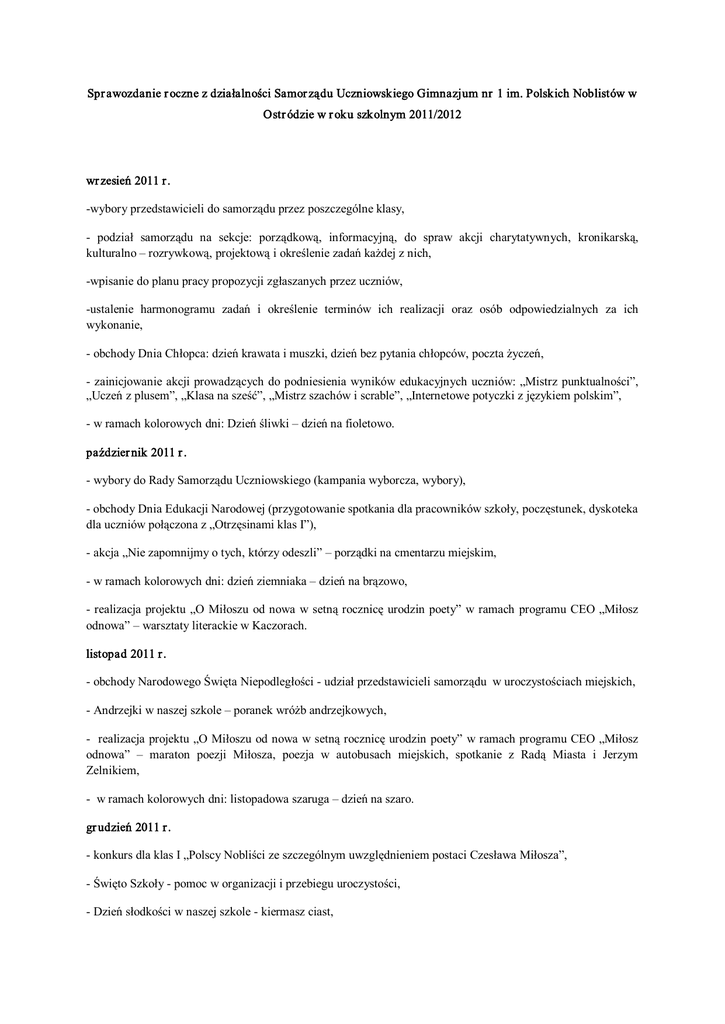 Spr awozdanie r oczne z działalności Samor ządu Uczniowskiego Gimnazjum nr 1 im. Polskich Noblistów w Ostr ódzie w r oku szkolnym 2011/2012 wr zesień 2011 r. wybory przedstawicieli do samorządu przez poszczególne klasy, podział samorządu na sekcje: porządkową, informacyjną, do spraw akcji charytatywnych, kronikarską, kulturalno – rozrywkową, projektową i określenie zadań każdej z nich, wpisanie do planu pracy propozycji zgłaszanych przez uczniów, ustalenie harmonogramu zadań i określenie terminów ich realizacji oraz osób odpowiedzialnych za ich wykonanie, obchody Dnia Chłopca: dzień krawata i muszki, dzień bez pytania chłopców, poczta życzeń, zainicjowanie akcji prowadzących do podniesienia wyników edukacyjnych uczniów: „Mistrz punktualności”, „Uczeń z plusem”, „Klasa na sześć”, „Mistrz szachów i scrable”, „Internetowe potyczki z językiem polskim”, w ramach kolorowych dni: Dzień śliwki – dzień na fioletowo. paździer nik 2011 r . wybory do Rady Samorządu Uczniowskiego (kampania wyborcza, wybory), obchody Dnia Edukacji Narodowej (przygotowanie spotkania dla pracowników szkoły, poczęstunek, dyskoteka dla uczniów połączona z „Otrzęsinami klas I”), akcja „Nie zapomnijmy o tych, którzy odeszli” – porządki na cmentarzu miejskim, w ramach kolorowych dni: dzień ziemniaka – dzień na brązowo, realizacja projektu „O Miłoszu od nowa w setną rocznicę urodzin poety” w ramach programu CEO „Miłosz odnowa” – warsztaty literackie w Kaczorach. listopad 2011 r. obchody Narodowego Święta Niepodległości udział przedstawicieli samorządu w uroczystościach miejskich, Andrzejki w naszej szkole – poranek wróżb andrzejkowych, realizacja projektu „O Miłoszu od nowa w setną rocznicę urodzin poety” w ramach programu CEO „Miłosz odnowa” – maraton poezji Miłosza, poezja w autobusach miejskich, spotkanie z Radą Miasta i Jerzym Zelnikiem, w ramach kolorowych dni: listopadowa szaruga – dzień na szaro. gr udzień 2011 r. konkurs dla klas I „Polscy Nobliści ze szczególnym uwzględnieniem postaci Czesława Miłosza”, Święto Szkoły pomoc w organizacji i przebiegu uroczystości, Dzień słodkości w naszej szkole kiermasz ciast, przystąpienie do akcji Kampania dobra w ramach współpracy ze stowarzyszeniem Przyjazna Szkoła, realizacja projektu „O Miłoszu od nowa w setną rocznicę urodzin poety” w ramach programu CEO „Miłosz odnowa” – rodzice czytają Miłosza, w ramach kolorowych dni: mikołajowy strój – dzień na czerwono. styczeń 2012 r . podsumowanie konkursów wręczenie nagród na apelu porządkowym, ogłoszenie konkursu : „Moja szkoła to ja”, w ramach kolorowych dni: dzień śniegowego bałwanka – dzień na biało. luty 2012 r . poczta Walentynowa doręczanie korespondencji walentynkowej przez „szkolnych listonoszy”, zainicjowanie akcji „Warto być dobrym” w ramach kolorowych dni dzień na różowo mar zec 2012 r . Dzień Kobiet dzień noszenia spódnic, dzień bez pytania dziewcząt, poczta życzeń zaangażowanie w powstanie pocztówki filmowej prezentującej szkołę kiermasz kanapek w ramach kolorowych dni dzień na zielono kwiecień 2012 r. Dzień Otwarty Gimnazjum – zaprezentowanie działań SU w ramach kolorowych dni – dzień na żółto maj 2012 r. udział przedstawicieli samorządu w uroczystościach miejskich, wycieczka do Krakowa „Śladami polskich noblistów” czer wiec 2012 r . zaangażowanie w przygotowanie gimnazjady „Historia na wesoło” zakończenie akcji „Warto być dobrym” rozstrzygnięcie konkursu „Moja szkoła to ja” w ramach kolorowych dni – powitanie lata – dzień na niebiesko pomoc w przygotowaniu pożegnania klas III podsumowanie konkursów. Na bieżąco: realizacja uchwał SU, prowadzenie dokumentacji, opieka nad gablotami, organizowanie zebrań Samorządu Uczniowskiego, współpraca ze wszystkimi organami szkoły oraz organizacjami szkolnymi, opiniowanie dokumentów szkolnych (zgodnie z obowiązującymi procedurami), udział w akcjach charytatywnych. Opiekunowie M. Popławska K. Fijas W. Narewski