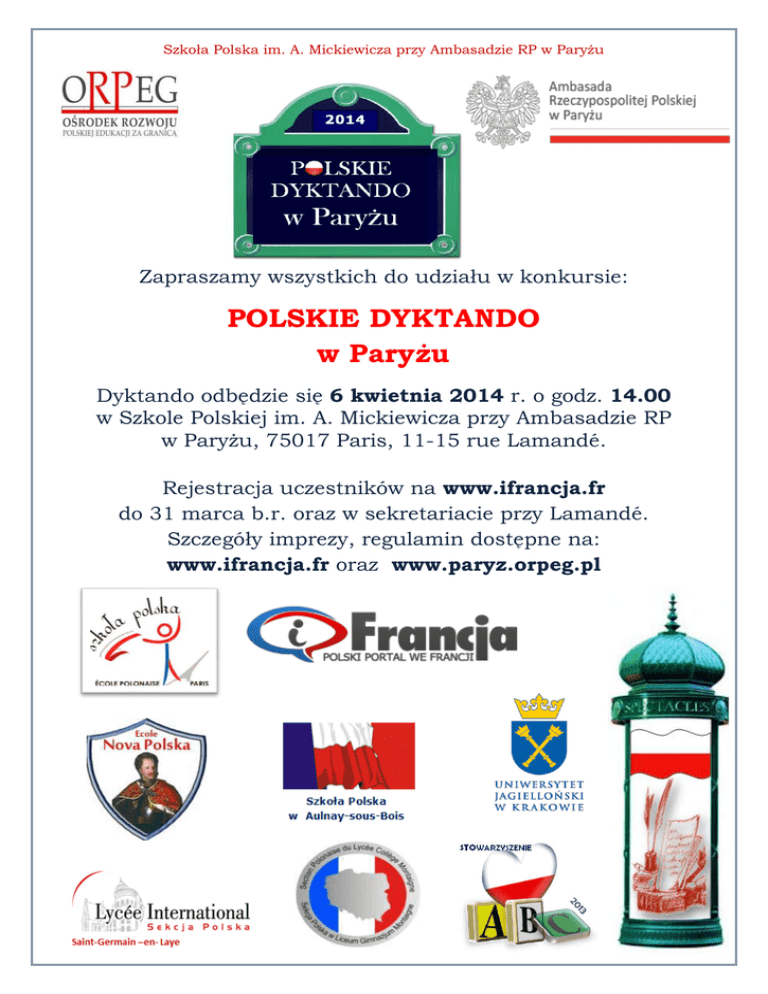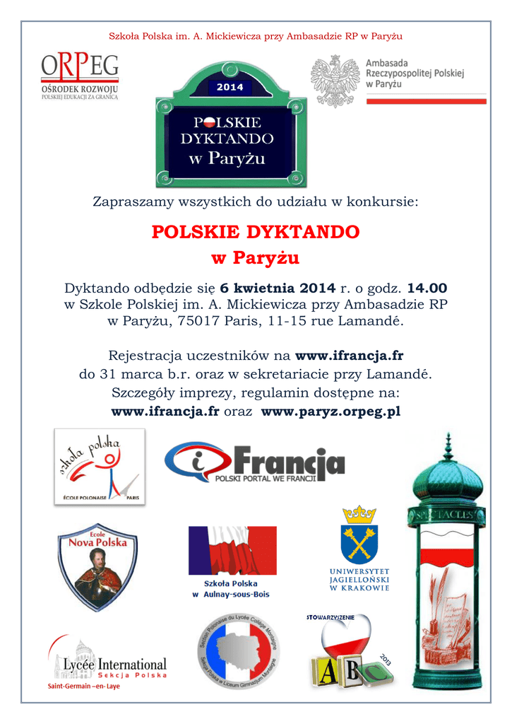 Szkoła Polska im. A. Mickiewicza przy Ambasadzie RP w Paryżu Zapraszamy wszystkich do udziału w konkursie: POLSKIE DYKTANDO w Paryżu Dyktando odbędzie się 6 kwietnia 2014 r. o godz. 14.00 w Szkole Polskiej im. A. Mickiewicza przy Ambasadzie RP w Paryżu, 75017 Paris, 11-15 rue Lamandé. Rejestracja uczestników na www.ifrancja.fr do 31 marca b.r. oraz w sekretariacie przy Lamandé. Szczegóły imprezy, regulamin dostępne na: www.ifrancja.fr oraz www.paryz.orpeg.pl