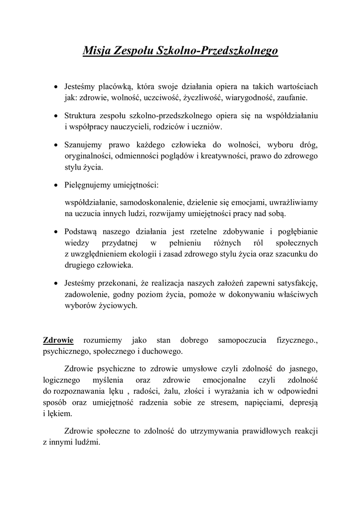 Misja Zespołu Szkolno-Przedszkolnego Jesteśmy placówką, która swoje działania opiera na takich wartościach jak: zdrowie, wolność, uczciwość, życzliwość, wiarygodność, zaufanie. Struktura zespołu szkolno-przedszkolnego opiera się na współdziałaniu i współpracy nauczycieli, rodziców i uczniów. Szanujemy prawo każdego człowieka do wolności, wyboru dróg, oryginalności, odmienności poglądów i kreatywności, prawo do zdrowego stylu życia. Pielęgnujemy umiejętności: współdziałanie, samodoskonalenie, dzielenie się emocjami, uwrażliwiamy na uczucia innych ludzi, rozwijamy umiejętności pracy nad sobą. Podstawą naszego działania jest rzetelne zdobywanie i pogłębianie wiedzy przydatnej w pełnieniu różnych ról społecznych z uwzględnieniem ekologii i zasad zdrowego stylu życia oraz szacunku do drugiego człowieka. Jesteśmy przekonani, że realizacja naszych założeń zapewni satysfakcję, zadowolenie, godny poziom życia, pomoże w dokonywaniu właściwych wyborów życiowych. Zdrowie rozumiemy jako stan dobrego psychicznego, społecznego i duchowego. samopoczucia fizycznego., Zdrowie psychiczne to zdrowie umysłowe czyli zdolność do jasnego, logicznego myślenia oraz zdrowie emocjonalne czyli zdolność do rozpoznawania lęku , radości, żalu, złości i wyrażania ich w odpowiedni sposób oraz umiejętność radzenia sobie ze stresem, napięciami, depresją i lękiem. Zdrowie społeczne to zdolność do utrzymywania prawidłowych reakcji z innymi ludźmi. Zdrowie duchowe to osobiste „credo” czyli zasady zachowania i sposoby utrzymywania wewnętrznego spokoju. Wolność to odpowiedzialność za własne czyny, tolerancja, umiejętność dokonywania wyborów, przestrzegania praw i obowiązków, prawo do głoszenia własnych poglądów. Uczciwość rozumiemy jako obopólne zaufanie, lojalność, obowiązkowość, rzetelność, odpowiedzialność, obiektywne traktowanie, sprawiedliwe ocenianie, otwartość, szczerość nauczycieli , uczniów, rodziców. Harmonogram działań wychowawczych Program oddziaływań wychowawczych na lata 2011 - 2015. Obszar pracy: dobre stosunki międzyludzkie. Zadania placówki w tym obszarze: Rozwijanie umiejętności właściwego komunikowania się Kształtowanie postaw życzliwości, szacunku, tolerancji, akceptacji i uznania. Budowanie więzi opartych na integracji wokół wspólnych wartości. Rozwijanie poczucie własnej wartości. Treści działań: Komunikacja społeczne – aktywne słuchanie, formułowanie komunikatu „ja”, budowanie kontaktu, empatia, rozpoznawanie preferowanych stylów uczenia się, informacja zwrotna. Komunikacja wyrażająca akceptację osoby. Zasady bycia z innymi ludźmi – wyrażanie siebie w sytuacjach społecznych. Zasady współdziałania, rozwiązywania konfliktów, budowanie poczucia więzi z grupą. Pogłębianie własnej samoświadomości, samoakceptacja. Umacnianie poczucia własnej wartości. Programowanie własnego rozwoju. Umiejętność aktywnego i empatycznego słuchania. Umiejętność formułowania komunikatu „ja”. Umiejętność określania zachowań asertywnych i wyrażania własnych potrzeb. Umiejętność wyboru i zastosowania technik integrujących grupę oraz ćwiczących zasady współżycia. Umiejętność rozwiązywania zadań i problemów w grupie. Umiejętność wzmacniania poczucia własnej wartości i programowania własnego rozwoju. Obszar pracy: Akceptacja Zadania przedszkola i szkoły: Stworzenie atmosfery życzliwości, sympatii i szacunku w placówce. Kształtowanie postaw pełnych akceptacji. Stworzenie i symulowanie sytuacji wychowawczych realizujących potrzebę akceptacji. Treści działań: Spójność oddziaływań wychowawczych przedszkola, szkoły i domu. Integracja społeczności przedszkolnej i szkolnej. Wnikliwa obserwacja dzieci i uczniów, ich wzajemnych relacji. Cele szczegółowe (umiejętności, postawy, zachowania, wiedza w formie celów operacyjnych): Uczeń i przedszkolak akceptuje siebie i szanuje odmienność drugiego człowieka. Uczeń i przedszkolak jest świadomy tego, że istnieją na świecie różne, często sprzeczne wartości. Uczeń i przedszkolak szanuje każdego człowieka bez względu na jego pozycję społeczną. Uczeń i przedszkolak potrafi prawidłowo funkcjonować w relacjach międzyludzkich.