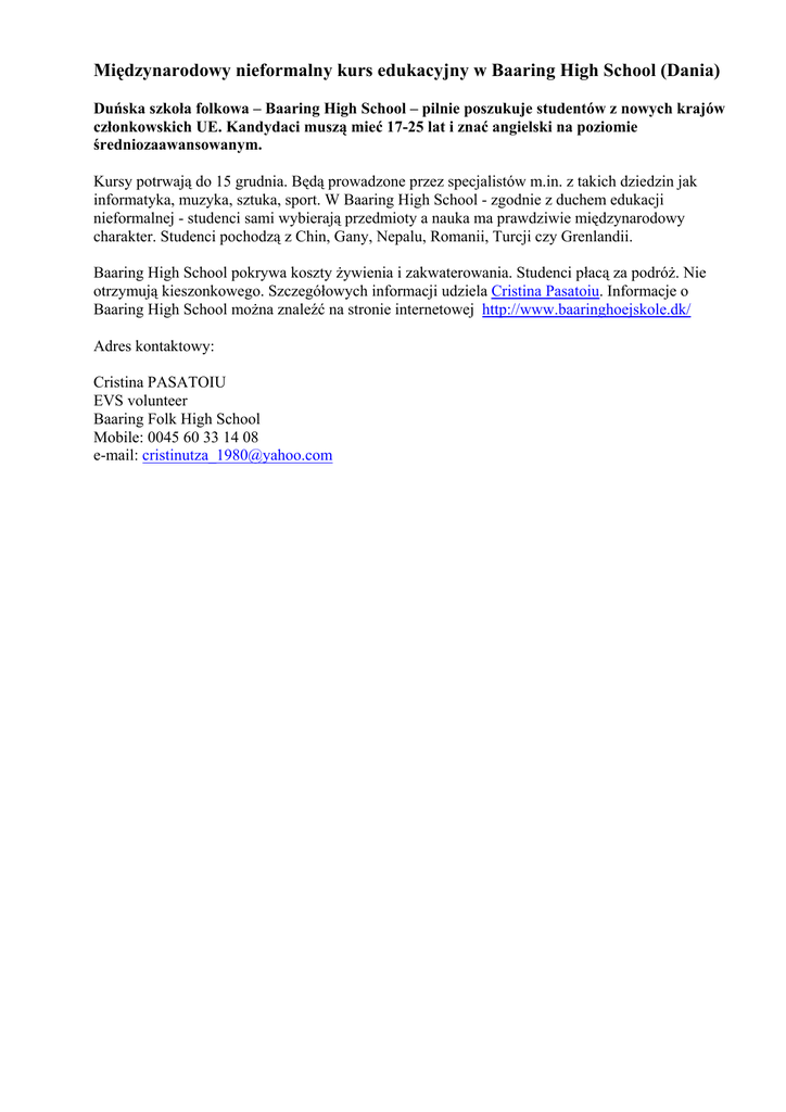 Międzynarodowy nieformalny kurs edukacyjny w Baaring High School (Dania) Duńska szkoła folkowa – Baaring High School – pilnie poszukuje studentów z nowych krajów członkowskich UE. Kandydaci muszą mieć 17-25 lat i znać angielski na poziomie średniozaawansowanym. Kursy potrwają do 15 grudnia. Będą prowadzone przez specjalistów m.in. z takich dziedzin jak informatyka, muzyka, sztuka, sport. W Baaring High School - zgodnie z duchem edukacji nieformalnej - studenci sami wybierają przedmioty a nauka ma prawdziwie międzynarodowy charakter. Studenci pochodzą z Chin, Gany, Nepalu, Romanii, Turcji czy Grenlandii. Baaring High School pokrywa koszty żywienia i zakwaterowania. Studenci płacą za podróż. Nie otrzymują kieszonkowego. Szczegółowych informacji udziela Cristina Pasatoiu. Informacje o Baaring High School można znaleźć na stronie internetowej http://www.baaringhoejskole.dk/ Adres kontaktowy: Cristina PASATOIU EVS volunteer Baaring Folk High School Mobile: 0045 60 33 14 08 e-mail: [email protected]
