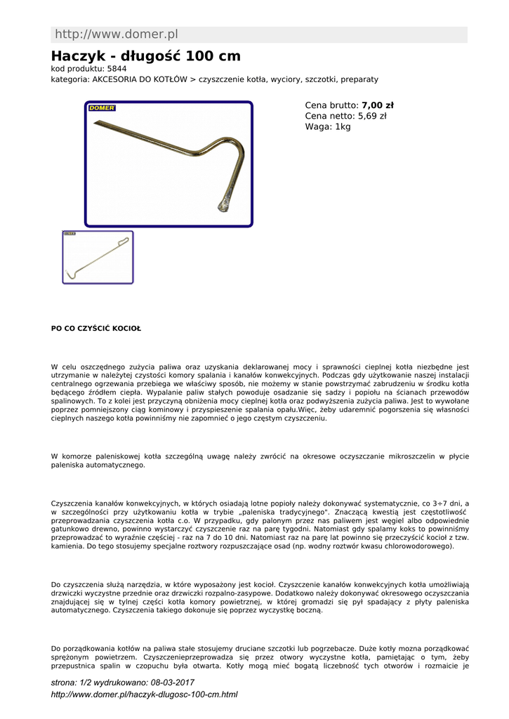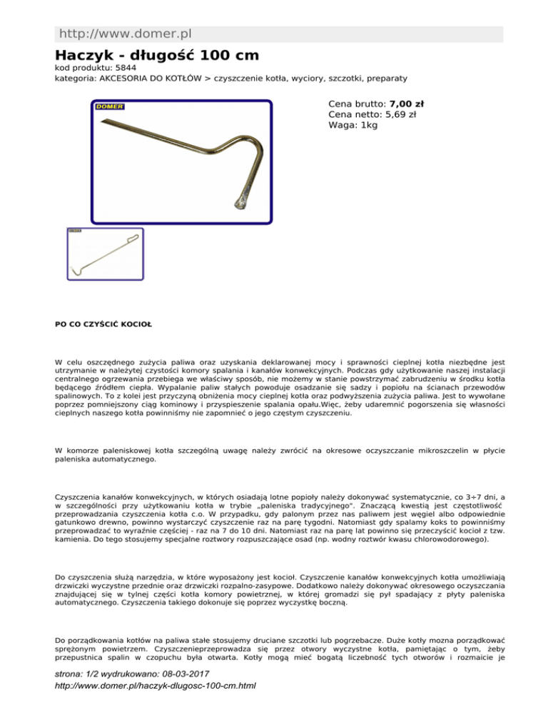 http://www.domer.pl Haczyk - długość 100 cm kod produktu: 5844 kategoria: AKCESORIA DO KOTŁÓW > czyszczenie kotła, wyciory, szczotki, preparaty Cena brutto: 7,00 zł Cena netto: 5,69 zł Waga: 1kg PO CO CZYŚCIĆ KOCIOŁ W celu oszczędnego zużycia paliwa oraz uzyskania deklarowanej mocy i sprawności cieplnej kotła niezbędne jest utrzymanie w należytej czystości komory spalania i kanałów konwekcyjnych. Podczas gdy użytkowanie naszej instalacji centralnego ogrzewania przebiega we właściwy sposób, nie możemy w stanie powstrzymać zabrudzeniu w środku kotła będącego źródłem ciepła. Wypalanie paliw stałych powoduje osadzanie się sadzy i popiołu na ścianach przewodów spalinowych. To z kolei jest przyczyną obniżenia mocy cieplnej kotła oraz podwyższenia zużycia paliwa. Jest to wywołane poprzez pomniejszony ciąg kominowy i przyspieszenie spalania opału.Więc, żeby udaremnić pogorszenia się własności cieplnych naszego kotła powinniśmy nie zapomnieć o jego częstym czyszczeniu. W komorze paleniskowej kotła szczególną uwagę należy zwrócić na okresowe oczyszczanie mikroszczelin w płycie paleniska automatycznego. Czyszczenia kanałów konwekcyjnych, w których osiadają lotne popioły należy dokonywać systematycznie, co 3÷7 dni, a w szczególności przy użytkowaniu kotła w trybie „paleniska tradycyjnego". Znaczącą kwestią jest częstotliwość przeprowadzania czyszczenia kotła c.o. W przypadku, gdy palonym przez nas paliwem jest węgiel albo odpowiednie gatunkowo drewno, powinno wystarczyć czyszczenie raz na parę tygodni. Natomiast gdy spalamy koks to powinniśmy przeprowadzać to wyraźnie częściej - raz na 7 do 10 dni. Natomiast raz na parę lat powinno się przeczyścić kocioł z tzw. kamienia. Do tego stosujemy specjalne roztwory rozpuszczające osad (np. wodny roztwór kwasu chlorowodorowego). Do czyszczenia służą narzędzia, w które wyposażony jest kocioł. Czyszczenie kanałów konwekcyjnych kotła umożliwiają drzwiczki wyczystne przednie oraz drzwiczki rozpalno-zasypowe. Dodatkowo należy dokonywać okresowego oczyszczania znajdującej się w tylnej części kotła komory powietrznej, w której gromadzi się pył spadający z płyty paleniska automatycznego. Czyszczenia takiego dokonuje się poprzez wyczystkę boczną. Do porządkowania kotłów na paliwa stałe stosujemy druciane szczotki lub pogrzebacze. Duże kotły mozna porządkować sprężonym powietrzem. Czyszczenieprzeprowadza się przez otwory wyczystne kotła, pamiętając o tym, żeby przepustnica spalin w czopuchu była otwarta. Kotły mogą mieć bogatą liczebność tych otworów i rozmaicie je strona: 1/2 wydrukowano: 08-03-2017 http://www.domer.pl/haczyk-dlugosc-100-cm.html zlokalizowane (u góry, z boku lub z tyłu). Pozostały popiół sprzątamy przez wyczystkę w dolnej części kotła z pomocą wygarniacza. Po ukończeniu pracy musimy pamiętać o tym, żeby hermetycznie zamknąć wszelkie otwory wyczystne. Istotnym również dla prawidłowej eksploatacji kotła jest czyszczenie przewodu kominowego. Po zakończeniu sezonu grzewczego lub w innych przypadkach planowanego wyłączenia kotła należy doprowadzić do wypalenia się zasypanej porcji paliwa. Po wygaszeniu kotła i ostudzeniu należy usunąć z paleniska wszystkie pozostałości po spalonym paliwie i dokonać czyszczenia oraz konserwacji całego kotła. Należy dokonać konserwacji (poprzez przesmarowanie olejem) wewnętrznych przegród komory paleniskowej oraz wszystkich elementów ruchomych. Na okres przerwy w funkcjonowaniu kotła w szczególności zabezpieczyć należy mechanizm podający paliwo do komory paleniskowej poprzez przesmarowanie poziomych prowadnic. strona: 2/2 wydrukowano: 08-03-2017 http://www.domer.pl/haczyk-dlugosc-100-cm.html