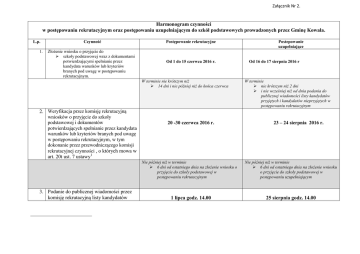 Załącznik Nr 2. Harmonogram czynności w postępowaniu rekrutacyjnym oraz postępowaniu uzupełniającym do szkół podstawowych prowadzonych przez Gminę Kowala. L.p. 1. Czynność Postępowanie rekrutacyjne Złożenie wniosku o przyjęcie do szkoły podstawowej wraz z dokumentami potwierdzającymi spełnianie przez kandydata warunków lub kryteriów branych pod uwagę w postępowaniu rekrutacyjnym. Od 1 do 15 czerwca 2016 r. W terminie nie krótszym niż 14 dni i nie później niż do końca czerwca 2. Weryfikacja przez komisję rekrutacyjną wniosków o przyjęcie do szkoły podstawowej i dokumentów potwierdzających spełnianie przez kandydata warunków lub kryteriów branych pod uwagę w postępowaniu rekrutacyjnym, w tym dokonanie przez przewodniczącego komisji rekrutacyjnej czynności , o których mowa w art. 20t ust. 7 ustawy1 20 -30 czerwca 2016 r. Nie później niż w terminie 6 dni od ostatniego dnia na złożenie wniosku o przyjęcie do szkoły podstawowej w postępowaniu rekrutacyjnym 3. Podanie do publicznej wiadomości przez komisję rekrutacyjną listy kandydatów 1 lipca godz. 14.00 Postepowanie uzupełniające Od 16 do 17 sierpnia 2016 r W terminie nie krótszym niż 2 dni i nie wcześniej niż od dnia podania do publicznej wiadomości listy kandydatów przyjętych i kandydatów nieprzyjętych w postępowaniu rekrutacyjnym 23 – 24 sierpnia 2016 r. Nie później niż w terminie 6 dni od ostatniego dnia na złożenie wniosku o przyjęcie do szkoły podstawowej w postępowaniu uzupełniającym 25 sierpnia godz. 14.00 Załącznik Nr 2. zakwalifikowanych i kandydatów niezakwalifikowanych 4. Potwierdzenie przez rodzica kandydata woli przyjęcia w postaci pisemnego oświadczenia Nie później niż w terminie 22 dni od ostatniego dnia na weryfikację wniosków o przyjęcie do szkoły podstawowej i dokumentów potwierdzających spełnianie przez kandydata warunków lub kryteriów branych pod uwagę w postępowaniu rekrutacyjnym2 W terminie jednego dnia od ostatniego dnia na rozpatrzenie w postępowaniu rekrutacyjnym odwołania od rozstrzygnięcia komisji rekrutacyjnej, zgodnie z art. 20zc ust. 9 ustawy Do 6 lipca 2016 r. Do 29 sierpnia 2016 r. W terminie nie krótszym niż 2 dni od dnia podania do publicznej wiadomości listy kandydatów zakwalifikowanych i kandydatów niezakwalifikowanych w postępowaniu rekrutacyjnym1) 5. Podanie do publicznej wiadomości przez komisję rekrutacyjną listy kandydatów przyjętych i kandydatów nieprzyjętych 8 lipca 2016 r. Nie później niż w terminie 3 dni od ostatniego dnia na potwierdzenie przez rodzica kandydata woli przyjęcia W terminie nie krótszym niż 2 dni od dnia podania do publicznej wiadomości listy kandydatów zakwalifikowanych i kandydatów niezakwalifikowanych w postępowaniu uzupełniającym1 31 sierpnia 2016 r. Do końca sierpnia