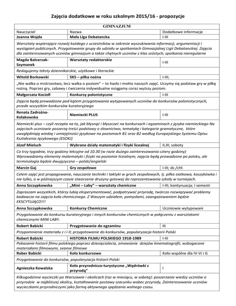 Zajęcia dodatkowe w roku szkolnym 2015/16 - propozycje Nauczyciel Joanna Wojda GIMNAZJUM Nazwa Mała Liga Debatancka Dodatkowe informacje I-III Warsztaty wspierające rozwój każdego z uczestników w zakresie wyszukiwania informacji, argumentacji i wystąpień publicznych. Przygotowanie grupy do udziału w spotkaniach Gimnazjalnej Ligii Debatanckiej. Zajęcia dla zainteresowanych uczniów gimnazjum a także chętnych uczniów z klas szóstych; spotkania nieregularne Magda BalcerzakSzymanek Warsztaty redaktorskie I-III Redagujemy teksty dziennikarskie, użytkowe i literackie Witold Borkowski SKS – piłka nożna I-III; „Nie walka o mistrzostwo, lecz walka o poziom” – to hasło i motto naszych zajęć. Uczymy się podstaw gry w piłkę nożną. Poprzez gry, zabawy i ćwiczenia indywidualne osiągamy coraz wyższy poziom. Małgorzata Kociołł Konkursy polonistyczne I-III Zajęcia będą prowadzone pod kątem przygotowania wytypowanych uczniów do konkursów polonistycznych, przede wszystkim konkursów kuratoryjnego Renata ZadrożnaKołakowska Niemiecki PLUS I-III Niemiecki plus – czyli recepta na to, jak błysnąć i błyszczeć na konkursach i egzaminach z języka niemieckiego Na zajęciach uczniowie poszerzą treści podstawy o słownictwo, tematykę i kategorie gramatyczne, które uwzględniają wiedzę i umiejętności językowe na poziomach B1 oraz B2 według Europejskiego Systemu Opisu Kształcenia Językowego (ESOKJ) Józef Mieluch Wybrane działy matematyki i fizyki licealnej II,III; soboty Co trzy tygodnie, trzy godziny lekcyjne od 10.30 (w razie dużego zainteresowania cztery godziny) Wprowadzamy elementy matematyki i fizyki na poziomie licealnym; zajęcia będą prowadzone po polsku, ale terminologia będzie dwujęzyczna – polski/angielski Marcin Gaj Gry zespołowe I-III; dz./chł. Celem zajęć jest propagowanie, nauczanie techniki i taktyki w grach zespołowych, tj. piłka siatkowa, koszykówka i nie tylko, a w późniejszym czasie stworzenie drużyny gotowej do reprezentowania szkoły w turniejach. Anna Szczypkowska „Mini – Laby” – warsztaty chemiczne I-III; kontynuacja; I semestr Zapraszam wszystkich, którzy lubią eksperymentować, podpatrywać przyrodę, twórczo rozwiązywać problemy badawcze na zajęcia koła chemicznego. Z Waszym udziałem, pomysłami, zaangażowaniem będzie EKSCYTUJĄCO!!! Anna Szczypkowska Konkursy Chemiczne Uczniowie wytypowani Przygotowanie do konkursu kuratoryjnego i innych konkursów chemicznych w połączeniu z warsztatami chemicznymi MINI LABY. Robert Babicki Przygotowanie do egzaminu III Przypomnienie materiału z i i II; przygotowanie do konkursów, popularyzacja historii Polski Robert Babicki HISTORIA FILMU POLSKIEGO 1918-1989 I-III Pokazanie historii filmu polskiego poprzez dziesięciolecia, omawianie dziejów kinematografii, wzbogacone materiałami filmowymi, seanse filmowe Rober Babicki Koło konkursowe Koło wspólne dla IV-Vi i G Przygotowanie do konkursów, popularyzacja historii Polski Agnieszka Kowalska Koło przyrodniczo-turystyczne „Wędrówki z przyrodą” I Kilkugodzinne wycieczki po Warszawie i okolicach (raz w miesiącu, w sobotę): poszerzanie wiedzy uczniów o przyrodzie w najbliższej okolicy, kształtowanie postawy szacunku wobec przyrody, Zainteresowanie uczniów wycieczkami przyrodniczymi jako formą aktywnego spędzania wolnego czasu. Anna Kryżman Koło konkursowe geografii III Przygotowanie uczniów do konkursu kuratoryjnego Marek Świetlicki Modelarstwo I-III Realizacja prostych projektów papierowych, kartonowych, komponowanie elementów z tworzyw sztucznych, metali, drewna; modele samolotów, pojazdów i figurek w skali 1:72; aranżacja dioram w skali 1:72 i 1:35 – zgodność historyczna; elementy modelarstwa kolejkowego. Filip Faliszewski Koło psychologiczne I-III Celem koła jest przybliżenie uczestnikom psychologii jako nauki oraz jej zastosowań praktycznych; uczestnik lepiej rozumie siebie, swoje emocje oraz relacje międzyludzkie; zna podstawowe mechanizmy i zależności związane z wybranym obszarem psychologii; wie czym się może zajmować psycholog i gdzie może pracować
