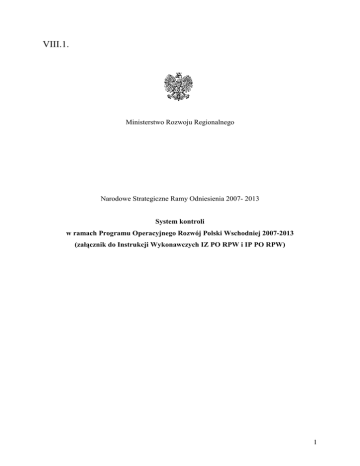 VIII.1. Ministerstwo Rozwoju Regionalnego Narodowe Strategiczne Ramy Odniesienia 2007- 2013 System kontroli w ramach Programu Operacyjnego Rozwój Polski Wschodniej 2007-2013 (załącznik do Instrukcji Wykonawczych IZ PO RPW i IP PO RPW) 1 Spis treści 1. Podstawa prawna................................................................................................................. 4 2. Zakres regulacji ................................................................................................................... 4 3. Stosowane skróty i terminy ................................................................................................. 4 4. Ogólne warunki kontroli ..................................................................................................... 7 5. Podział zadań w zakresie czynności kontrolnych pomiędzy IZ PO RPW i IP PO RPW... 8 6. Kontrola dokonywana przez IZ PO RPW ........................................................................... 8 6.1 Kontrola systemowa ......................................................................................................... 8 6.1.1 Kontrola dokumentacji…………………………………………………………………………...…10 6.1.2 Kontrola na miejscu…………………………………………………………………………………11 6.2 Kontrola Poświadczenia i deklaracji wydatków od IP do IZ………………………….11 6.3 Weryfikacja wydatków poniesionych przez IP PO RPW w ramach Pomocy Technicznej .............................................................................................................................................. 11 6.4 Kontrole na zakończenie realizacji projektów Pomocy Technicznej PO RPW………..12 6.5 Pozostałe kontrole przeprowadzane przez IZ PO RPW............................................... 123 7. Kontrola realizowana przez IP PO RPW .......................................................................... 13 7.1 Warunki ogólne .............................................................................................................. 13 7.2 Weryfikacja wniosków beneficjenta o płatność przez IP PO RPW............................... 14 7.3 Kontrola projektów na miejscu ...................................................................................... 15 7.4 Metodologia doboru próby……………………………………………………………..16 8. Kontrole krzyŜowe .......................................................................................................... 17 9. Kontrole przeprowadzane przez Urząd Zamówień Publicznych……………………….18 10. Roczny Plan Kontroli PO RPW ...................................................................................... 19 10.1 Opis uwarunkowań prowadzenia procesu kontroli w danym roku .............................. 20 10.2 Układ chronologiczny i tematyczny kontroli systemowej w ciągu roku ..................... 20 10.3 ZałoŜenia co do warunków kontroli projektów w PO RPW w danym roku................ 21 10.4 Realizacja Rocznego Planu Kontroli przez IP PO RPW.............................................. 21 10.5 Zmiany Rocznego Planu Kontroli IP PO RPW............................................................ 21 11. Etapy przygotowania i prowadzenia kontroli.................................................................. 22 11.1 Etapy kontroli ............................................................................................................... 22 11.2 Zaplanowanie czynności kontrolnych .......................................................................... 22 11.2.1 Pismo informujące o planowanej kontroli (zawiadomienie o kontroli)............................................ 22 11.2.2 Powołanie zespołu kontrolującego ................................................................................................... 23 11.2.3 Przygotowanie programu kontroli.................................................................................................... 23 2 11.2.4 Przygotowanie upowaŜnienia do kontroli......................................................................................... 23 11.2.5 Przygotowanie listy sprawdzającej................................................................................................... 23 11.2.6. Podpisanie oświadczeń o bezstronności .......................................................................................... 24 11.3 Przeprowadzenie czynności kontrolnych ..................................................................... 24 11.4 Dokumentacja z przeprowadzonej kontroli.................................................................. 25 11.5 Raportowanie nieprawidłowości odpowiednim instytucjom w ramach PO RPW i NSRO zgodnie z obowiązującym stanem prawnym .......................................................... 26 11.6 Archiwizacja dokumentacji z kontroli ......................................................................... 26 11.7 Pozostałe obowiązki IZ PO RPW w zakresie kontroli................................................. 27 12. Postępowanie w razie zgłoszenia zastrzeŜeń do informacji pokontrolnej, odmowa podpisania informacji pokontrolnej, rekontrola. ................................................................... 27 13. Załączniki dokumentacji z kontroli................................................................................. 29 14. Załączniki ........................................................................................................................ 30 3 1. Podstawa prawna 1) Art. 70 rozporządzenia Rady (WE) nr 1083/2006 z dnia 11 lipca 2006r. ustanawiającego przepisy ogólne dotyczące Europejskiego Funduszu Rozwoju Regionalnego, Europejskiego Funduszu Społecznego oraz Funduszu Spójności i uchylające rozporządzenie (WE) nr 1260/19991 zobowiązuje Państwa Członkowskie do ustanowienia syst