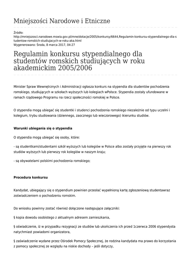 Mniejszości Narodowe i Etniczne Źródło: http://mniejszosci.narodowe.mswia.gov.pl/mne/dotacje/2005/konkursy/6644,Regulamin-konkursu-stypendialnego-dla-s tudentow-romskich-studiujacych-w-roku-aka.html Wygenerowano: Środa, 8 marca 2017, 04:27 Regulamin konkursu stypendialnego dla studentów romskich studiujących w roku akademickim 2005/2006 Minister Spraw Wewnętrznych i Administracji ogłasza konkurs na stypendia dla studentów pochodzenia romskiego, studiujących w szkołach wyższych lub kolegiach wPolsce. Stypendia zostały ufundowane w ramach rządowego Programu na rzecz społeczności romskiej w Polsce. O stypendia mogą ubiegać się studentki i studenci pochodzenia romskiego niezależnie od typu uczelni i kolegium, trybu studiowania (dziennego, zaocznego lub wieczorowego) ikierunku studiów. Warunki ubiegania się o stypendia O stypendia mogą ubiegać się osoby, które: - są studentkami/studentami szkół wyższych lub kolegiów w Polsce albo zostały przyjęte na pierwszy rok studiów wyższych lub pierwszy rok kolegiów w naszym kraju; - są obywatelami polskimi pochodzenia romskiego; Procedura konkursu Kandydat, ubiegający się o stypendium powinien przesłać wypełnioną kartę zgłoszeniową studentawraz zoświadczeniem o pochodzeniu romskim. Do wniosku powinny zostać również dołączone następujące załączniki: § kopia dowodu osobistego z aktualnym adresem zamieszkania, § oświadczenie, iż w przypadku rezygnacji ze studiów lub ukończenia ich przed 1czerwca 2006 stypendysta natychmiast powiadomi organizatora, § zaświadczenie wydane przez Ośrodek Pomocy Społecznej, że rodzina kandydata ma prawo do korzystania z pomocy społecznej ze względu na niskie dochody – jeśli dotyczy, § zaświadczenie o dochodach przypadających na osobę w rodzinie – w jednym gospodarstwie domowym (np. z zakładu pracy, ośrodka pomocy społecznej, urzędu pracy, ZUS-u bądź inne), § zaświadczenie ze szkoły wyższej lub kolegium o przyjęciu kandydata na studia bądź kontynuowaniu studiów w roku akademickim 2005/2006, § zaświadczenie o średniej ocen uzyskanych z egzaminów w roku akademickim 2004/2005 – jeśli dotyczy. UWAGI O stypendium nie mogą ubiegać się osoby, które będą powtarzać rok akademicki 2004/2005 ze względu na brak postępów w nauce. Jeżeli rok akademicki będzie powtarzany ze względu na stan zdrowia bądź wydarzenia losowe, powinno to zostać zaznaczone w podaniu. Korzystanie ze stypendium socjalnego bądź naukowego w szkole wyższej lub kolegium nie stanowi przeszkody w ubieganiu się o przyznanie stypendium. Procedura rozpatrywania wniosków Ostatecznego wyboru osób, którym będą przyznane stypendia dokona komisja, wskład której wejdą przedstawiciele Ministerstwa Spraw Wewnętrznych iAdministracji oraz organizacji wyłonionej w otwartym konkursie ofert. O wynikach pracy komisji kandydaci zostaną powiadomieni w ciągu tygodnia od zakończenia jej prac. Procedura wypłacania stypendium Za wypłatę stypendiów odpowiedzialna będzie organizacja wyłoniona w otwartym konkursie ofert. Stypendia będą przekazywane na konta stypendystów do 7 dnia każdego miesiąca. Stypendyści zobowiązani są do powiadomienia organizatora o przerwaniu lub wcześniejszym ukończeniu studiów. W takiej sytuacji wypłacanie stypendium zostanie wstrzymane. Stypendia będą wypłacane tylko na konta bankowe stypendystów. Wstecz Drukuj Generuj PDF Powiadom znajomego