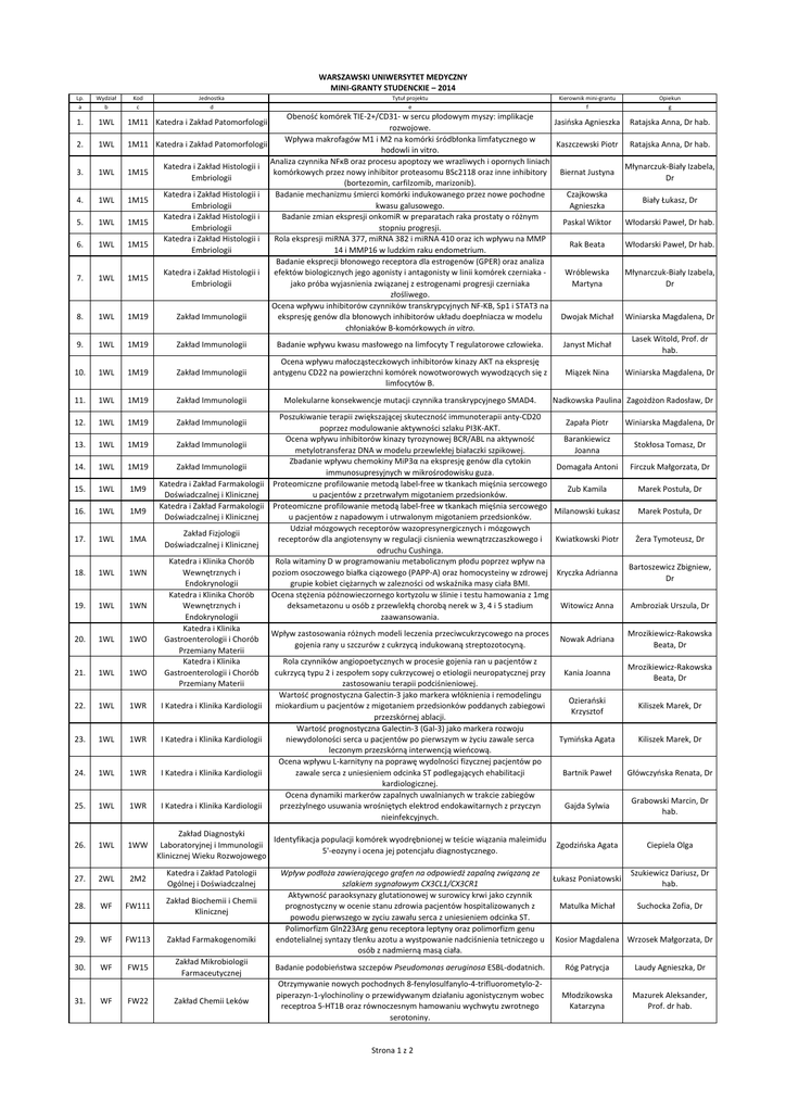 WARSZAWSKI UNIWERSYTET MEDYCZNY MINI-‐GRANTY STUDENCKIE – 2014 Lp. a Wydział b Kod c Jednostka d Tytuł projektu e Kierownik mini-‐grantu f Obeność komórek TIE-‐2+/CD31-‐ w sercu płodowym myszy: implikacje Jasińska Agnieszka rozwojowe. Wpływa makrofagów M1 i M2 na komórki śródbłonka limfatycznego w Kaszczewski Piotr hodowli in vitro. Analiza czynnika NFκB oraz procesu apoptozy we wrazliwych i opornych liniach komórkowych przez nowy inhibitor proteasomu BSc2118 oraz inne inhibitory Biernat Justyna (bortezomin, carfilzomib, marizonib). Badanie mechanizmu śmierci komórki indukowanego przez nowe pochodne Czajkowska kwasu galusowego. Agnieszka Badanie zmian ekspresji onkomiR w preparatach raka prostaty o różnym Paskal Wiktor stopniu progresji. Rola ekspresji miRNA 377, miRNA 382 i miRNA 410 oraz ich wpływu na MMP Rak Beata 14 i MMP16 w ludzkim raku endometrium. Badanie eksprecji błonowego receptora dla estrogenów (GPER) oraz analiza efektów biologicznych jego agonisty i antagonisty w linii komórek czerniaka -‐ Wróblewska jako próba wyjasnienia związanej z estrogenami progresji czerniaka Martyna złośliwego. Ocena wpływu inhibitorów czynników transkrypcyjnych NF-‐ƘB, Sp1 i STAT3 na ekspresję genów dla błonowych inhibitorów układu doepłniacza w modelu Dwojak Michał chłoniaków B-‐komórkowych in vitro. Opiekun g 1. 1WL 1M11 Katedra i Zakład Patomorfologii 2. 1WL 1M11 Katedra i Zakład Patomorfologii 3. 1WL 1M15 4. 1WL 1M15 5. 1WL 1M15 6. 1WL 1M15 7. 1WL 1M15 Katedra i Zakład Histologii i Embriologii 8. 1WL 1M19 Zakład Immunologii 9. 1WL 1M19 Zakład Immunologii Badanie wpływu kwasu masłowego na limfocyty T regulatorowe człowieka. Janyst Michał Lasek Witold, Prof. dr hab. 10. 1WL 1M19 Zakład Immunologii Ocena wpływu małocząsteczkowych inhibitorów kinazy AKT na ekspresję antygenu CD22 na powierzchni komórek nowotworowych wywodzących się z limfocytów B. Miązek Nina Winiarska Magdalena, Dr 11. 1WL 1M19 Zakład Immunologii Molekularne konsekwencje mutacji czynnika transkrypcyjnego SMAD4. 12. 1WL 1M19 Katedra i Zakład Histologii i Embriologii Katedra i Zakład Histologii i Embriologii Katedra i Zakład Histologii i Embriologii Katedra i Zakład Histologii i Embriologii Poszukiwanie terapii zwiększającej skuteczność immunoterapii anty-‐CD20 Zakład Immunologii poprzez modulowanie aktywności szlaku PI3K-‐AKT. Ocena wpływu inhibitorów kinazy tyrozynowej BCR/ABL na aktywność Zakład Immunologii metylotransferaz DNA w modelu przewlekłej białaczki szpikowej. Zbadanie wpływu chemokiny MiP3α na ekspresję genów dla cytokin Zakład Immunologii immunosupresyjnych w mikrośrodowisku guza. Katedra i Zakład Farmakologii Proteomiczne profilowanie metodą label-‐free w tkankach mięśnia sercowego Doświadczalnej i Klinicznej u pacjentów z przetrwałym migotaniem przedsionków. Katedra i Zakład Farmakologii Proteomiczne profilowanie metodą label-‐free w tkankach mięśnia sercowego Doświadczalnej i Klinicznej u pacjentów z napadowym i utrwalonym migotaniem przedsionków. Udział mózgowych receptorów wazopresynergicznych i mózgowych Zakład Fizjologii receptorów dla angiotensyny w regulacji cisnienia wewnątrzczaszkowego i Doświadczalnej i Klinicznej odruchu Cushinga. Katedra i Klinika Chorób Rola witaminy D w programowaniu metabolicznym płodu poprzez wpływ na Wewnętrznych i poziom osoczowego białka ciązowego (PAPP-‐A) oraz homocysteiny w zdrowej Endokrynologii grupie kobiet ciężarnych w zalezności od wskaźnika masy ciała BMI. Katedra i Klinika Chorób Ocena stężenia późnowieczornego kortyzolu w ślinie i testu hamowania z 1mg Wewnętrznych i deksametazonu u osób z przewlekłą chorobą nerek w 3, 4 i 5 stadium Endokrynologii zaawansowania. Katedra i Klinika Wpływ zastosowania różnych modeli leczenia przeciwcukrzycowego na proces Gastroenterologii i Chorób gojenia rany u szczurów z cukrzycą indukowaną streptozotocyną. Przemiany Materii Katedra i Klinika Rola czynników angiopoetycznych w procesie gojenia ran u pacjentów z Gastroenterologii i Chorób cukrzycą typu 2 i zespołem sopy cukrzycowej o etiologii neuropatycznej przy Przemiany Materii zastosowaniu terapii podciśnieniowej. Wartość prognostyczna Galectin-‐3 jako markera włóknienia i remodelingu I Katedra i Klinika Kardiologii miokardium u pacjentów z migotaniem przedsionków poddanych zabiegowi przezskórnej ablacji. Wartość prognostyczna Galectin-‐3 (Gal-‐3) jako markera rozwoju I Katedra i Klinika Kardiologii niewydoloności serca u pacjentów po pierwszym w życiu zawale serca leczonym przezskórną interwencją wieńcową. Ocena wpływu L-‐karnityny na poprawę wydolności fizycznej pacjentów po I Katedra i Klinika Kardiologii zawale serca z uniesieniem odcinka ST podlegających ehabilitacji kardiologicznej. Ocena dynamiki markerów zapalnych uwalnianych w trakcie zabiegów I Katedra i Klinika Kardiologii przezżylnego usuwania wrośniętych elektrod endokawitarnych z przyczyn nieinfekcyjnych. Ratajska Anna, Dr hab. Ratajska Anna, Dr hab. Młynarczuk-‐Biały Izabela, Dr Biały Łukasz, Dr Włodarski Paweł, Dr hab. Włodarski Paweł, Dr hab. Młynarczuk-‐Biały Izabela, Dr Winiarska Magdalena, Dr Nadkowska Paulina Zagożdżon Radosław, Dr Zapała Piotr Winiarska Magdalena, Dr Barankiewicz Joanna Stokłosa Tomasz, Dr Domagała Antoni Firczuk Małgorzata, Dr Zub Kamila Marek Postuła, Dr Milanowski Łukasz Marek Postuła, Dr Kwiatkowski Piotr Żera Tymoteusz, Dr Kryczka Adrianna Bartoszewicz Zbigniew, Dr Witowicz Anna Ambroziak Urszula, Dr Nowak Adriana Mrozikiewicz-‐Rakowska Beata, Dr Kania Joanna Mrozikiewicz-‐Rakowska Beata, Dr Ozierański Krzysztof Kiliszek Marek, Dr Tymińska Agata Kiliszek Marek, Dr Bartnik Paweł Główczyńska Renata, Dr Gajda Sylwia Grabowski Marcin, Dr hab. 13. 1WL 1M19 14. 1WL 1M19 15. 1WL 1M9 16. 1WL 1M9 17. 1WL 1MA 18. 1WL 1WN 19. 1WL 1WN 20. 1WL 1WO 21. 1WL 1WO 22. 1WL 
