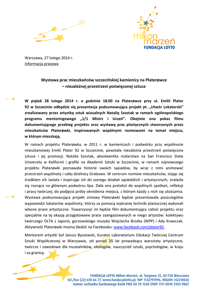 Warszawa, 27 lutego 2014 r. Informacja prasowa Wystawa prac mieszkańców szczecińskiej kamienicy na Platerøwce – niezależnej przestrzeni poświęconej sztuce W piątek 28 lutego 2014 r. o godzinie 18:00 na Platerøwce przy ul. Emilii Plater 92 w Szczecinie odbędzie się prezentacja podsumowująca projekt pt. „Utwór Lokatorski” zrealizowany przez artystkę sztuk wizualnych Natalię Szostak w ramach ogólnopolskiego programu mentoringowego „1/1 Mistrz i Uczeń”. Obejmie ona pokaz filmu dokumentującego przebieg projektu oraz wystawę prac plastycznych stworzonych przez mieszkańców Platerøwki, inspirowanych wspólnymi rozmowami na temat miejsca, w którym mieszkają. W ramach projektu Platerøwka, w 2011 r. w kamienicach i podwórku przy wspólnocie mieszkaniowej Emilii Plater 92 w Szczecinie, powstała niezależna przestrzeń poświęcona sztuce i jej promocji. Natalia Szostak, absolwentka malarstwa na San Francisco State University w Kalifornii i grafiki na Akademii Sztuki w Szczecinie, w ramach najnowszego projektu Platerøwki poznawała historie swoich sąsiadów, by wraz z nimi animować przestrzeń wspólnoty i całej dzielnicy Grabowo. W centrum rozmów mieszkańców, stając się środkiem ich świata i inspirując ich do szeregu działań sąsiedzkich i artystycznych, znalazła się rosnąca na głównym podwórzu lipa. Dała ona pretekst do wspólnych spotkań, refleksji i pracy twórczej; do podjęcia próby określenia miejsca, z którym każdy z nich się utożsamia. Wystawa podsumowująca projekt zimowy Platerøwki będzie prezentowała poszczególne wypowiedzi lokatorów wspólnoty, którzy za pomocą wybranej techniki plastycznej wykonali własne prace artystyczne. Towarzyszyć im będzie film dokumentujący całość projektu oraz specjalnie na tę okazję przygotowane prace zaangażowanych w niego artystów: kolektywu twórczego OLTA z Japonii, gorzowskiego muzyka Wojciecha Brożka (WPP) i Ady Krawczak. Aktywność Platerøwki można śledzić na Facebooku: www.facebook.com/plater92. Mentorem artystki był Janusz Byszewski, Kurator Laboratorium Edukacji Twórczej Centrum Sztuki Współczesnej w Warszawie, od ponad 20 lat prowadzący warsztaty artystyczne, twórcze i zawodowe dla muzealników, ekologów, nauczycieli sztuki, psychologów, w kraju i za granicą. Program „1/1 Mistrz i Uczeń” to spotkanie dziesięciu młodych artystów i animatorów kultury z różnych zakątków Polski z dziesięcioma uznanymi twórcami. Jest to dla nich szansa na stworzenie projektu artystycznego lub społeczno-kulturalnego pod okiem mistrza. Każdy z uczestników programu dostał wsparcie swojego mentora, coachów i trenerów oraz 6 tysięcy złotych na realizację własnego pomysłu. Duety same określiły sobie harmonogram prac, których koniec dobiega w lutym 2014. Jego efektem końcowym będzie wydanie pamiątkowej publikacji podsumowująca wszystkie dziesięć realizacji. Program „1/1 Mistrz i Uczeń” Towarzystwa Inicjatyw Twórczych ‘ę’ realizowany jest we współpracy z Fundacją LOTTO Milion Marzeń oraz finansowany ze środków Fundacji LOTTO Milion Marzeń. Więcej o projekcie „1/1 Mistrz i Uczeń” oraz informacje o wszystkich uczestnikach i mentorach można znaleźć na stronach: www.1na1.e.org.pl oraz www.fundacjalotto.pl. Informacje dla mediów: [email protected] tel. 22 618 66 77 Strona 2 z 2