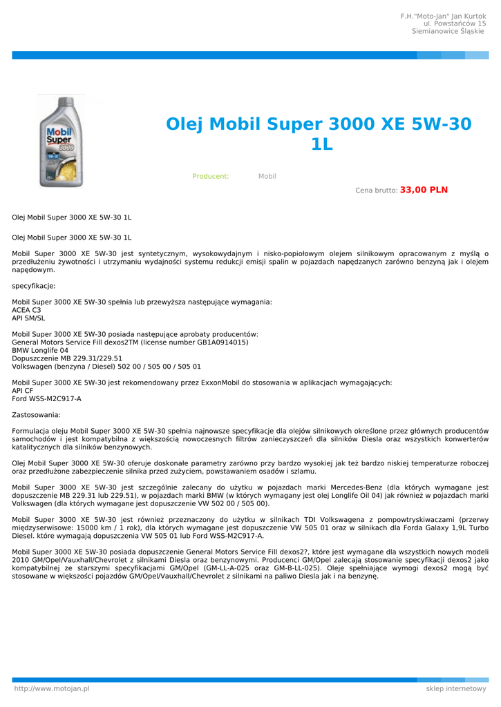 F.H."Moto-Jan" Jan Kurtok ul. Powstańców 15 Siemianowice Śląskie Olej Mobil Super 3000 XE 5W-30 1L Producent: Mobil Cena brutto: 33,00 PLN Olej Mobil Super 3000 XE 5W-30 1L Olej Mobil Super 3000 XE 5W-30 1L Mobil Super 3000 XE 5W-30 jest syntetycznym, wysokowydajnym i nisko-popiołowym olejem silnikowym opracowanym z myślą o przedłużeniu żywotności i utrzymaniu wydajności systemu redukcji emisji spalin w pojazdach napędzanych zarówno benzyną jak i olejem napędowym. specyfikacje: Mobil Super 3000 XE 5W-30 spełnia lub przewyższa następujące wymagania: ACEA C3 API SM/SL Mobil Super 3000 XE 5W-30 posiada następujące aprobaty producentów: General Motors Service Fill dexos2TM (license number GB1A0914015) BMW Longlife 04 Dopuszczenie MB 229.31/229.51 Volkswagen (benzyna / Diesel) 502 00 / 505 00 / 505 01 Mobil Super 3000 XE 5W-30 jest rekomendowany przez ExxonMobil do stosowania w aplikacjach wymagających: API CF Ford WSS-M2C917-A Zastosowania: Formulacja oleju Mobil Super 3000 XE 5W-30 spełnia najnowsze specyfikacje dla olejów silnikowych określone przez głównych producentów samochodów i jest kompatybilna z większością nowoczesnych filtrów zanieczyszczeń dla silników Diesla oraz wszystkich konwerterów katalitycznych dla silników benzynowych. Olej Mobil Super 3000 XE 5W-30 oferuje doskonałe parametry zarówno przy bardzo wysokiej jak też bardzo niskiej temperaturze roboczej oraz przedłużone zabezpieczenie silnika przed zużyciem, powstawaniem osadów i szlamu. Mobil Super 3000 XE 5W-30 jest szczególnie zalecany do użytku w pojazdach marki Mercedes-Benz (dla których wymagane jest dopuszczenie MB 229.31 lub 229.51), w pojazdach marki BMW (w których wymagany jest olej Longlife Oil 04) jak również w pojazdach marki Volkswagen (dla których wymagane jest dopuszczenie VW 502 00 / 505 00). Mobil Super 3000 XE 5W-30 jest również przeznaczony do użytku w silnikach TDI Volkswagena z pompowtryskiwaczami (przerwy międzyserwisowe: 15000 km / 1 rok), dla których wymagane jest dopuszczenie VW 505 01 oraz w silnikach dla Forda Galaxy 1,9L Turbo Diesel. które wymagają dopuszczenia VW 505 01 lub Ford WSS-M2C917-A. Mobil Super 3000 XE 5W-30 posiada dopuszczenie General Motors Service Fill dexos2?, które jest wymagane dla wszystkich nowych modeli 2010 GM/Opel/Vauxhall/Chevrolet z silnikami Diesla oraz benzynowymi. Producenci GM/Opel zalecają stosowanie specyfikacji dexos2 jako kompatybilnej ze starszymi specyfikacjami GM/Opel (GM-LL-A-025 oraz GM-B-LL-025). Oleje spełniające wymogi dexos2 mogą być stosowane w większości pojazdów GM/Opel/Vauxhall/Chevrolet z silnikami na paliwo Diesla jak i na benzynę. http://www.motojan.pl sklep internetowy
