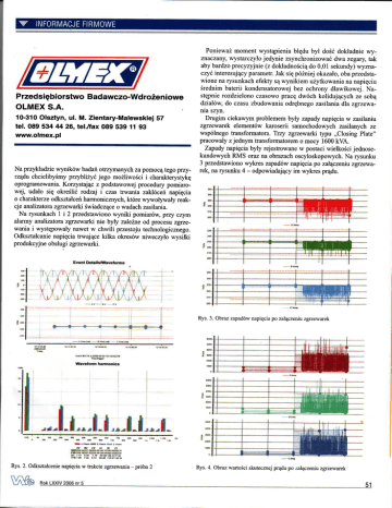 Ponieważmomentwystąpieniabłędubył dośćdokładniewyjedyniezsynchronizowaódwa zegary,tak znaczany,wystarczyło abybardzoprecyzyjnie(z dokładnością do 0'01 sekundy)wyznaczyó interesującyparametr' Jak siępóźniejokazało, obaprzedstawionena rysunkachefektysąwynikiemużytkowaniananapięciu średnim baterii kondensatorowej bez ochronydławikowej.Następnie rozdzie|ono czasowopracędwóch kolidującychze sobą Przedsiębiorstwo Badawczo.Wdrożeniowe działów,do czasuzbudowaniaodrębnegozasi|aniad|azgrzewaOLMEX S.A. nla szyn. 10-310Olsztyn, ul. M. Zientary-Malewskiej57 Drugim ciekawymproblemembyĘ zapadynapięciaw zasilaniu zgrzewarekelementówkaroserii samochodowychzasiIanychze tel. 089 534 44 26, tel./fax089 539 11 9g wspólnegotransformatora, Trzy zgrzewarkitypu ,,ClosingPlate'' www.olmex.pl pracowĄ z jednymtransformatorem o mocy 1600kVA. ZapadynapięciabyĘ rejestrowane jednosew postaciwielkości kundowychRMS oraz ta obrazachoscyloskopowych.Na rysunku 3 przedstawionowykes zapadównapięciapo załączenitlzgrzewaNa przykładziewyników badańotrrymanychza pomocątegoprzy- rek, na rysunku4 - odpowiadający im wykes prądu. rządu chcielibyśmyprzybliĘć jego możliwości i charakterystykę oprogramowania. Korzystającz podstawowej procedurypomiarowej, udałosię określićrodzaji czas trwania zatdócennapięcia o charakterze odkształceń harmonicznych,które wpr,oĘwaĘ reakcjeana|izatorazgrzewarkiświadcząceowadachzasi|ania. Na rysunkach7 i 2 przedstawionowyniki pomiarów,przy czym a|armyana|izatorazgrzewarkj nie byĘ za|ezneod procesuzgrzewaniai występowĄ nawetw chwili przestojutechnologicznego. odkształcanie napięciatrwającekilka okesów niweczyłowysiłki produkcyjneobsfugizgrzewarki. --' ch Rys' 3. obraz zapadów napięciapo załączeniuzgtzevtarck łs ł srŃfu ptĘB'fu& -^b-!tu*ctu swdłdd Ę l t! m7,s 0E rs 4.?! a'o 6ia tE l$-3'''s ttorrsa Rys. 2. odkształcenienapięcia w trakcie zgnewarua _ pt6ba 2 ,*ctu Rys. 4' obraz wartościskuteczrej prądupo załączenil zgnewarek Dla zaintęresowanych wykor4lstaniem ąnalizatora Power Guide/Explorer 4400, z amieszczamy anal iz ęj ego mozltwosct: Pomiar i rejestracja:Wszystkiepomiaryi rejestracjesąwykonyłVanej ednocześnieprzez standardowyptryrząd, bez koniecznościkupowania dodatkowychmodułów: _ migotania_ Flicker P1t/Pst/Sli.P1t, wyższeharmonicznew napiękierunciu i prądziedo 63.harmonicznej,moceharmonicanych, (odzakłóceń ki generowaniawyższychharmonicznychi innych biorca <-> dostawca),THD, diagram fazory,oscyloskop, asymehie, napięcie(L-N, L-L), prądy,moce,energie'współczynsygnaty sterownicze nałożonęna naniki mocy, częstotliwość, pięcie, interharmoniczne, T|D, zapaly napięcia, przepięcia, minimalne /maksymalne, przetęenia, wartościśrednie/ -K-Factor, Crest-Factor, współczynnik oddziatywania odksztaŁ conęgoprąduna hansformator,prąd rozruchu,współczynnikintertbrenc1ikomunikacyjnych sygnałÓw cyfrowych nałożonych na napięcie, ana\izaczasookresowa95o/o,zapis zakJócei z tłem (10 cykli przedzakłóceniemi l0 tys. cykli po zakłóceniu),cross-trigger (Ęeshacja |,łzyzowa),oscylacje z zapisemkształtusinusoidy,równoczesnerejestmcjepfogowei ezasowe;opcjonłlnie pracaw układach400Hz. Wejścia:4xnapięciowe(do 600 V rms)AC/DC 4xprądowedla cęg/flex'ów(do 6000A) AC/DC. Układy: dowolne3-fazowę(3- i 4-przewodowe). Próbkowanie: 256 próbek na okęs (l2,8 kHz) z uwzględnieniem każdegopółokesu, opcjonalnie detektor przepięć aperiodycznych od I mikrosekundy. odczytu(uwaga:b. wysoka dowyzsza niiz0,1%o Dokładność: nie skali). kładność [%] I%] odczyaNormy i przepisy: IEC (PN-EN) 61000-4-30klasaA (zarówno dla algoryhnóW jak i wyników), CE, UL, PN-EN 50160, IEC IEEE 1159,IEEE 1453, 61000-4-7II ed.klasaI, IEC 61000-4-15, IEEE 1459,IEEE 519,CE. Pamięć: 32_|28 MB nieulotnejpamięcina wyjmowanejkarcie CompactFlash. Komunikacja: USB, Ethernet, RS232, modem przewodowy/bezprzewodowy(opcja). Przekładnie: dowo|nieprogramowanędla prądui napięcia. Program: bardzo prosĘ intuicyjny w obsłudze,dla Windows 9x' 2000, NT, XĘ z tabe|uycmąi graftcznąptezentacjąrejesfracji, z dodatkowąfunkcją eksportudanych do arkusza kalkularyjnego' np. Excel; automaĘczny genęratorraportów porejestracyjnych. Ekran: kolorowy ekan doĘkowy z akĘwną maĘc6 blokada hasłem. Akcesońa: cęgi i flex'y prądowe(0,l_6000 A), zamykanana klucz antydeszczowaskrzyŃa do aplikacji zewnęhznych,adapter do zasilania zmierzonei fazy, interfejsy ip. Zasilanie: 90-264 V AC, wbudowany akumulator 2 godz., opcjonalnie adapterdo zasilattiaz fazy. GabaryĘ i obudowa:30 cm x 20 mm x 60 mm, 1,8kg, wstrząsoodpomabezpiecznaobudowa z wyttzymałegotworzywa sztucznego (nie przewodzącegoprądu),wszystkie poĘ zlokalizowane po jednej shonie prąlrządu. ą) 'l Event ilsftYaveforms -^h(d*-svń(s..... *. lfi łql #@ l!łffi.*' cfulą oo,**' ł''a7 1li7 *ł'l ffiffiffi*ffił mu Rys. 5. obraz oscyloskopolvyzapadunapięciaz odpowiadającym wykesem chwilowych wartościskutecznych Na rysunku5 przedstawionowybranyzapadnapięcia,wynikająpracy dwóch zgrzewarekdwufazowych.Na skucy z jednoczesnej jednoczesnegoz1rzęwaniazuzyciemfazyBwystąpit.zapadna tek ZymanychwynikÓw pięcia do wartości190 V. Na podstaw wyniki o dowolnym otrz i oprogramowaniaanalizatora'tatwo i obskutecznej wartości w postaciwykesów zakesieuśredniania, razów oscyloskopowych. ELEKTROWNIE WIATROWE W SZKOCJI Jedno ze szkockich przedsiębiorstwelekhoenergetycznychprzeprowadza mosieci, demizacjęswojej sieci elekhoenergeĘcmej.oprócz unowocześnienia obejmujeona m.in.włączeniedo sieci większejliczby farm elektrowniwiatrowych, wraz z doprowadzeniemdo nich dróg dojazdowych.Modernizacjabęlat i obejmierównież budowęnowych elektrowni wiahowych dzię trwałasześć na lądzie oraz na pełnymmornr. Pierwsze nowe obiekty zostanąoddane do użytkuw 2007 rolrcu.(wb-41) www.electricalreview.co.uk RokL.IXlV.2jQonr5