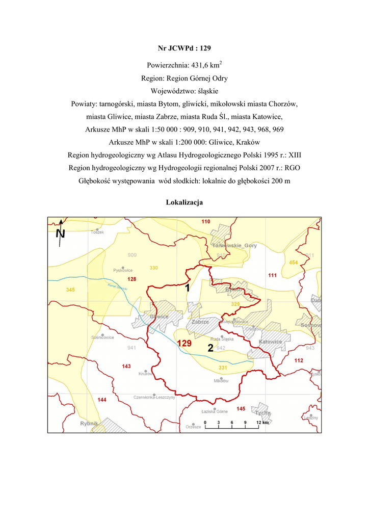 Nr JCWPd : 129 Powierzchnia: 431,6 km2 Region: Region Górnej Odry Województwo: śląskie Powiaty: tarnogórski, miasta Bytom, gliwicki, mikołowski miasta Chorzów, miasta Gliwice, miasta Zabrze, miasta Ruda Śl., miasta Katowice, Arkusze MhP w skali 1:50 000 : 909, 910, 941, 942, 943, 968, 969 Arkusze MhP w skali 1:200 000: Gliwice, Kraków Region hydrogeologiczny wg Atlasu Hydrogeologicznego Polski 1995 r.: XIII Region hydrogeologiczny wg Hydrogeologii regionalnej Polski 2007 r.: RGO Głębokość występowania wód słodkich: lokalnie do głębokości 200 m Lokalizacja Profile Symbol całej JCWPd uwzględniający wszystkie profile: (Q), (T 2,1), C3 Opis symbolu jednostki: poziom wodonośny w czwartorzędzie, występuje lokalnie, wzdłuŜ rzek, gdzie wykształcony jest w postaci dwóch/trzech warstw. Na obszarze całej jednostki występują utwory wodonośne karbonu górnego, wykształcone w postaci cyklotemów węglowych, w których wodonośne są głównie zeszczelinowacone piaskowce. Q - wody porowe w utworach piaszczystych i Ŝwirowych T – wody szczelinowe w utworach węglanowych T2 i szczelinowo-porowe w utworach klastycznych T1 C3 - wody szczelinowo-porowe w piaskowcach Cecha szczególna JCWPd – na przewaŜającej części, w granicach leja depresyjnego, jednostka jest drenowana przez podziemne wyrobiska kopalń węgla kamiennego (do głębokości 1100 m p.p.t.). GZWP występujące w obrębie JCWPd : 329 – Zbiornik (T1,2) Bytom, 330 – Zbiornik (T1,2) Gliwice, 331 - Zbiornik Dolina Kopalna rzeki Górna Kłodnica (Q) Schemat przepływu wód podziemnych