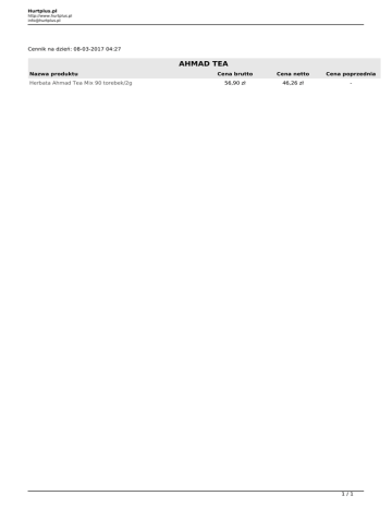 Hurtplus.pl http://www.hurtplus.pl [email protected] Cennik na dzień: 08-03-2017 04:27 AHMAD TEA Nazwa produktu Herbata Ahmad Tea Mix 90 torebek/2g Cena brutto Cena netto Cena poprzednia 56,90 zł 46,26 zł - 1/1 Powered by TCPDF (www.tcpdf.org)