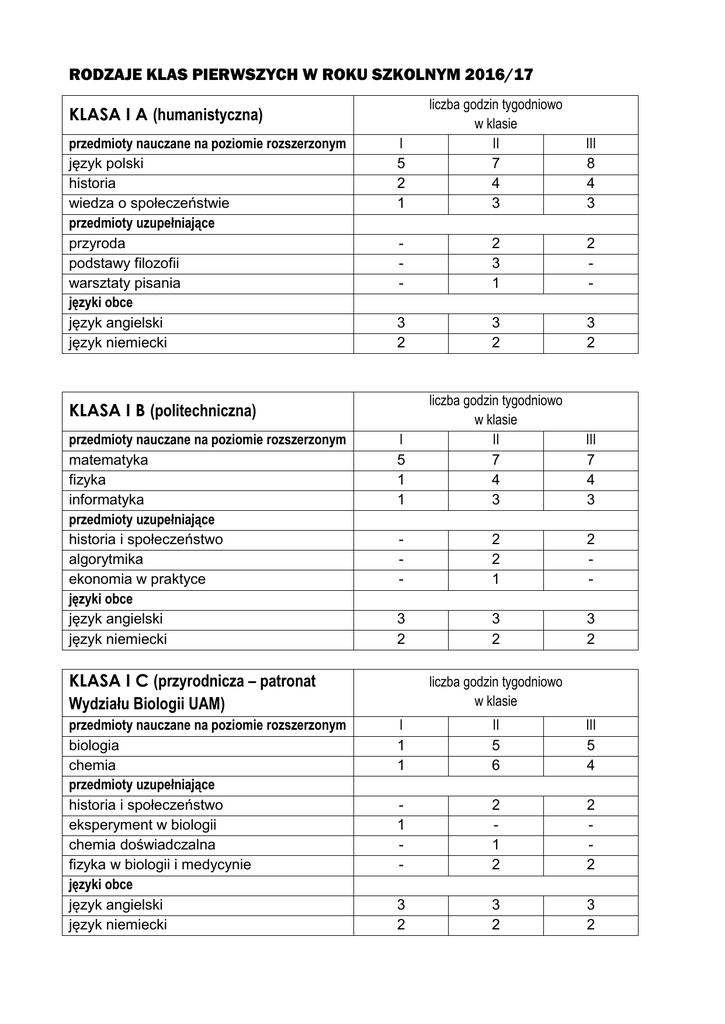 RODZAJE KLAS PIERWSZYCH W ROKU SZKOLNYM 2016/17 I 5 2 1 liczba godzin tygodniowo w klasie II 7 4 3 III 8 4 3 - 2 3 1 2 - 3 2 3 2 3 2 I 5 1 1 liczba godzin tygodniowo w klasie II 7 4 3 III 7 4 3 - 2 2 1 2 - 3 2 3 2 3 2 KLASA I A (humanistyczna) przedmioty nauczane na poziomie rozszerzonym język polski historia wiedza o społeczeństwie przedmioty uzupełniające przyroda podstawy filozofii warsztaty pisania języki obce język angielski język niemiecki KLASA I B (politechniczna) przedmioty nauczane na poziomie rozszerzonym matematyka fizyka informatyka przedmioty uzupełniające historia i społeczeństwo algorytmika ekonomia w praktyce języki obce język angielski język niemiecki KLASA I C (przyrodnicza – patronat Wydziału Biologii UAM) przedmioty nauczane na poziomie rozszerzonym biologia chemia przedmioty uzupełniające historia i społeczeństwo eksperyment w biologii chemia doświadczalna fizyka w biologii i medycynie języki obce język angielski język niemiecki liczba godzin tygodniowo w klasie I 1 1 II 5 6 III 5 4 1 - 2 1 2 2 2 3 2 3 2 3 2 I 4 2 1 liczba godzin tygodniowo w klasie II 7 6 4 III 6 4 4 - 2 2 2 2 KLASA I D (językowo-geograficzna) przedmioty nauczane na poziomie rozszerzonym język hiszpański język angielski geografia przedmioty uzupełniające historia i społeczeństwo krajoznawstwo Utworzona zostanie także jedna klasa dwujęzyczna z językiem hiszpańskim dla uczniów z Gimnazjum nr 26 kontynuujących naukę w liceum. Do klasy tej mogą również zostać przyjęci inni uczniowie, po zdaniu w dniu 24 maja 2016 r. o godz. 8:00 testu z języka hiszpańskiego na wymaganym poziomie. Zagadnienia do testu dostępne są w sekretariacie lub na stronie internetowej szkoły. I liczba godzin tygodniowo w klasie II III 2 1 5 4 5 4 2 1 5 4 5 4 - 2 2 2 2 3 2 1 1 4 4 3 2 3 4 2 1 KLASA I E (dwujęzyczna) przedmioty nauczane na poziomie rozszerzonym GRUPA 1 język angielski geografia GRUPA 2 język angielski wiedza o społeczeństwie przedmioty uzupełniające GRUPA 1: historia i społeczeństwo GRUPA 2: przyroda przedmioty nauczane na poziomie dwujęzycznym język hiszpański literatura hiszpańska historia Hiszpanii geografia Hiszpanii