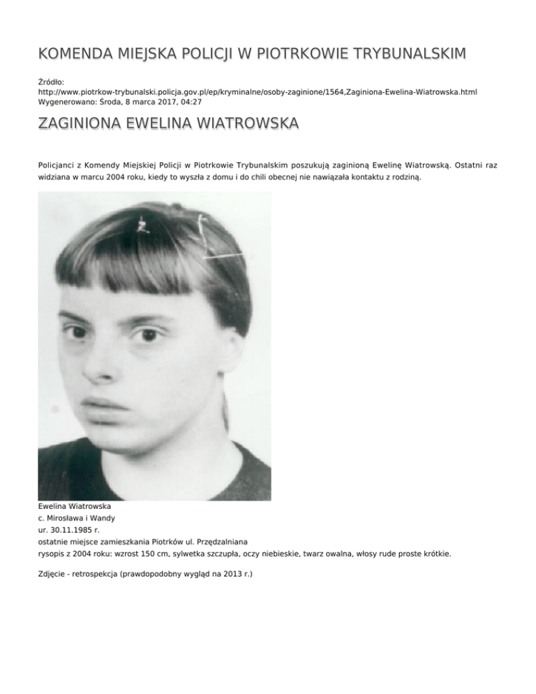KOMENDA MIEJSKA POLICJI W PIOTRKOWIE TRYBUNALSKIM Źródło: http://www.piotrkow-trybunalski.policja.gov.pl/ep/kryminalne/osoby-zaginione/1564,Zaginiona-Ewelina-Wiatrowska.html Wygenerowano: Środa, 8 marca 2017, 04:27 ZAGINIONA EWELINA WIATROWSKA Policjanci z Komendy Miejskiej Policji w Piotrkowie Trybunalskim poszukują zaginioną Ewelinę Wiatrowską. Ostatni raz widziana w marcu 2004 roku, kiedy to wyszła z domu i do chili obecnej nie nawiązała kontaktu z rodziną. Ewelina Wiatrowska c. Mirosława i Wandy ur. 30.11.1985 r. ostatnie miejsce zamieszkania Piotrków ul. Przędzalniana rysopis z 2004 roku: wzrost 150 cm, sylwetka szczupła, oczy niebieskie, twarz owalna, włosy rude proste krótkie. Zdjęcie - retrospekcja (prawdopodobny wygląd na 2013 r.) Wszystkie osoby mogące pomóc policji w ustaleniu miejsca pobytu zaginionej proszone są o kontakt z policjantami z Komendy Miejskiej Policji przy ul. Szkolnej 30/38, lub telefonicznie pod numerem 44 647-94-62 czynny cała dobę. Ocena: 0/5 (1) Tweetnij
