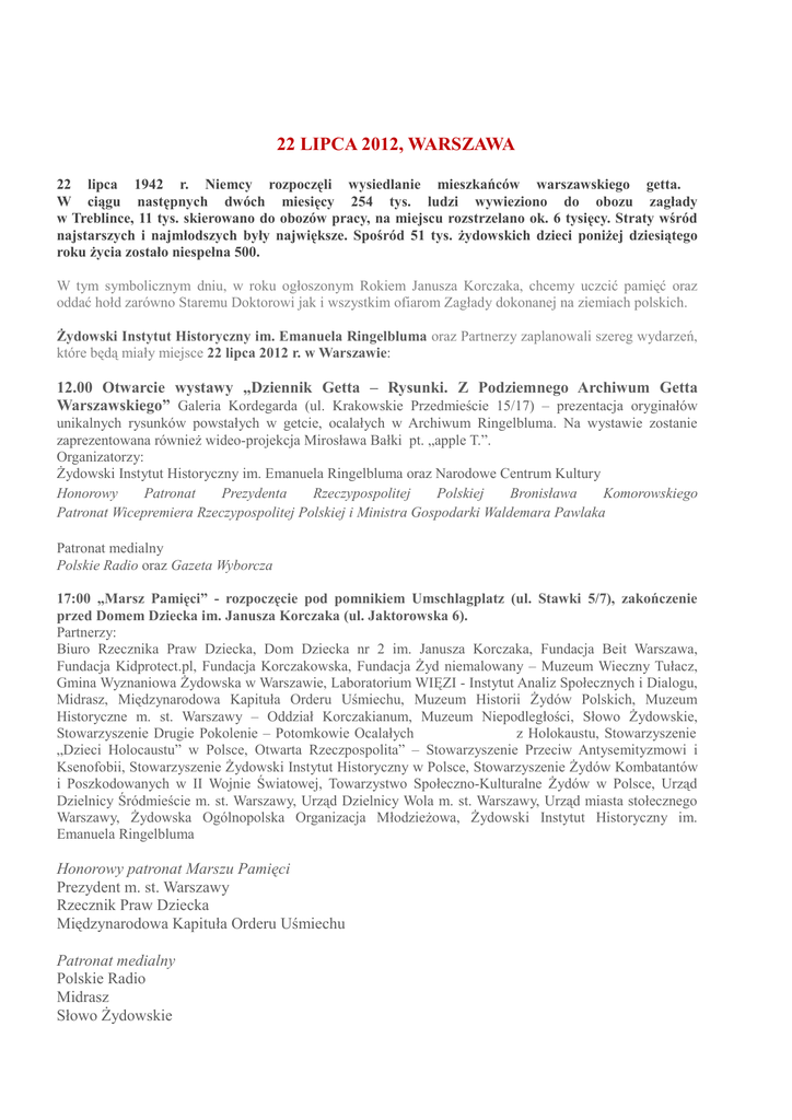 22 LIPCA 2012, WARSZAWA 22 lipca 1942 r. Niemcy rozpoczęli wysiedlanie mieszkańców warszawskiego getta. W ciągu następnych dwóch miesięcy 254 tys. ludzi wywieziono do obozu zagłady w Treblince, 11 tys. skierowano do obozów pracy, na miejscu rozstrzelano ok. 6 tysięcy. Straty wśród najstarszych i najmłodszych były największe. Spośród 51 tys. żydowskich dzieci poniżej dziesiątego roku życia zostało niespełna 500. W tym symbolicznym dniu, w roku ogłoszonym Rokiem Janusza Korczaka, chcemy uczcić pamięć oraz oddać hołd zarówno Staremu Doktorowi jak i wszystkim ofiarom Zagłady dokonanej na ziemiach polskich. Żydowski Instytut Historyczny im. Emanuela Ringelbluma oraz Partnerzy zaplanowali szereg wydarzeń, które będą miały miejsce 22 lipca 2012 r. w Warszawie: 12.00 Otwarcie wystawy „Dziennik Getta – Rysunki. Z Podziemnego Archiwum Getta Warszawskiego” Galeria Kordegarda (ul. Krakowskie Przedmieście 15/17) – prezentacja oryginałów unikalnych rysunków powstałych w getcie, ocalałych w Archiwum Ringelbluma. Na wystawie zostanie zaprezentowana również wideo-projekcja Mirosława Bałki pt. „apple T.”. Organizatorzy: Żydowski Instytut Historyczny im. Emanuela Ringelbluma oraz Narodowe Centrum Kultury Honorowy Patronat Prezydenta Rzeczypospolitej Polskiej Bronisława Komorowskiego Patronat Wicepremiera Rzeczypospolitej Polskiej i Ministra Gospodarki Waldemara Pawlaka Patronat medialny Polskie Radio oraz Gazeta Wyborcza 17:00 „Marsz Pamięci” - rozpoczęcie pod pomnikiem Umschlagplatz (ul. Stawki 5/7), zakończenie przed Domem Dziecka im. Janusza Korczaka (ul. Jaktorowska 6). Partnerzy: Biuro Rzecznika Praw Dziecka, Dom Dziecka nr 2 im. Janusza Korczaka, Fundacja Beit Warszawa, Fundacja Kidprotect.pl, Fundacja Korczakowska, Fundacja Żyd niemalowany – Muzeum Wieczny Tułacz, Gmina Wyznaniowa Żydowska w Warszawie, Laboratorium WIĘZI - Instytut Analiz Społecznych i Dialogu, Midrasz, Międzynarodowa Kapituła Orderu Uśmiechu, Muzeum Historii Żydów Polskich, Muzeum Historyczne m. st. Warszawy – Oddział Korczakianum, Muzeum Niepodległości, Słowo Żydowskie, Stowarzyszenie Drugie Pokolenie – Potomkowie Ocalałych z Holokaustu, Stowarzyszenie „Dzieci Holocaustu” w Polsce, Otwarta Rzeczpospolita” – Stowarzyszenie Przeciw Antysemityzmowi i Ksenofobii, Stowarzyszenie Żydowski Instytut Historyczny w Polsce, Stowarzyszenie Żydów Kombatantów i Poszkodowanych w II Wojnie Światowej, Towarzystwo Społeczno-Kulturalne Żydów w Polsce, Urząd Dzielnicy Śródmieście m. st. Warszawy, Urząd Dzielnicy Wola m. st. Warszawy, Urząd miasta stołecznego Warszawy, Żydowska Ogólnopolska Organizacja Młodzieżowa, Żydowski Instytut Historyczny im. Emanuela Ringelbluma Honorowy patronat Marszu Pamięci Prezydent m. st. Warszawy Rzecznik Praw Dziecka Międzynarodowa Kapituła Orderu Uśmiechu Patronat medialny Polskie Radio Midrasz Słowo Żydowskie 20:30 koncert „OHEL WARSZAWA” (ul. Bohaterów Getta) Organizatorzy: Mikołaj Trzaska, Stowarzyszenie Drugie Pokolenie – Potomkowie Ocalałych z Holokaustu oraz Żydowski Instytut Historyczny im. Emanuela Ringelbluma Zagrają IRCHA GDOLA - Mikołaja Trzaski, SHOFAR oraz FROM THEE TO THEE - projekt Raphaela Rogińskiego. Usłyszymy Marka Sandersa, Wacława Zimpla, Olie Brice'a, Macia Morettiego, Olę Bilińską, Michała Górczyńskiego, Pawła Szamburskiego, Michała Moniuszkę oraz innych. Pieczę nad kształtem artystycznym koncertu sprawuje Mikołaj Trzaska. Patronat medialny TOK FM TVP Warszawa Patronat honorowy nad obchodami 70. rocznicy rozpoczęcia likwidacji getta warszawskiego objęła Prezydent m. st. Warszawy. Program Marszu Pamięci 17:00 Uroczyste rozpoczęcie Marszu Pamięci pod pomnikiem Umschlagplatz (ul. Stawki 5/7) - Treny Jeremiasza - rozdanie uczestnikom Marszu wstążek pamięci ok. 17:40 Dodatkowy punkt zborny na placu przed Muzeum Więzienia Pawiak (ul. Dzielna 24/26) - miejsce, w którym nowi uczestnicy Marszu mogą dołączyć do reszty grupy ok. 19:00 Zakończenie Marszu przed Domem Dziecka im. Janusza Korczaka (ul. Jaktorowska 6) - wystąpienie Rzecznika Praw Dziecka - solowy występ Mikołaja Trzaski - zawieszanie przez uczestników Marszu wstążek pamięci przed Domem Dziecka Trasa Marszu przebiegać będzie następującymi ulicami: Stawki, Karmelicką, Dzielną, Smoczą, Nowolipie, Żelazną, Chłodną, Towarową, Jaktorowską. WSTĄŻKI PAMIĘCI stwórzmy RAZEM pomnik pamięci najmłodszych ofiar Zagłady Nie tylko Marszem Pamięci chcemy złożyć hołd pomordowanym podczas Zagłady żydowskim dzieciom. Pragniemy też stworzyć widoczny pomnik, który by te ofiary symbolizował. Dlatego też, na początku Marszu każdy z uczestników otrzyma wstążkę z wypisanym imieniem jednego z tragicznie zamordowanych dzieci. Niektóre wstążki będą puste, mają one przypominać bezimienne ofiary Zagłady. Uczestników Marszu będziemy prosić, aby wpisywali na nich imiona sobie bliskich ofiar Szoa. Pod koniec naszej symbolicznej drogi od śmierci - spod pomnika Umschlagplatz, ku życiu do Domu Sierot, wstążki zawiesimy wspólnie przy dzisiejszym Domu Dziecka nr 2 im. Janusza Korczaka, w ten sposób stworzymy pomnik pamięci najmłodszych ofiar Zagłady.