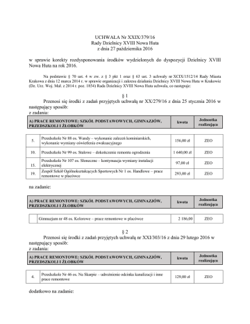 UCHWAŁA Nr XXIX/379/16 Rady Dzielnicy XVIII Nowa Huta z dnia 27 października 2016 w sprawie korekty rozdysponowania środków wydzielonych do dyspozycji Dzielnicy XVIII Nowa Huta na rok 2016. Na podstawie § 70 ust. 4 w zw. z § 3 pkt 1 oraz § 63 ust. 3 uchwały nr XCIX/1512/14 Rady Miasta Krakowa z dnia 12 marca 2014 r. w sprawie organizacji i zakresu działania Dzielnicy XVIII Nowa Huta w Krakowie (Dz. Urz. Woj. Mał. z 2014 r. poz. 1854) Rada Dzielnicy XVIII Nowa Huta uchwala, co następuje: §1 Przenosi się środki z zadań przyjętych uchwałą nr XX/279/16 z dnia 25 stycznia 2016 w następujący sposób: z zadania: A) PRACE REMONTOWE: SZKÓŁ PODSTAWOWYCH, GIMNAZJÓW, PRZEDSZKOLI I ŻŁOBKÓW kwota Jednostka realizująca 5. Przedszkole Nr 88 os. Wandy – wykonanie zaleceń kominiarskich, wykonanie wymiany oświetlenia ewakuacyjnego 156,00 zł ZEO 10. Przedszkole Nr 99 os. Stalowe – dokończenie remontu ogrodzenia 1 640,00 zł ZEO 97,00 zł ZEO 293,00 zł ZEO kwota Jednostka realizująca 15. 19. Przedszkole Nr 107 os. Słoneczne – kontynuacja wymiany instalacji elektrycznej Zespół Szkół Ogólnokształcących Sportowych Nr 1 os. Handlowe – prace remontowe w placówce na zadanie: A) PRACE REMONTOWE: SZKÓŁ PODSTAWOWYCH, GIMNAZJÓW, PRZEDSZKOLI I ŻŁOBKÓW Gimnazjum nr 48 os. Kolorowe – prace remontowe w placówce 2 186,00 ZEO §2 Przenosi się środki z zadań przyjętych uchwałą nr XXI/303/16 z dnia 29 lutego 2016 w następujący sposób: z zadania: A) PRACE REMONTOWE: SZKÓŁ PODSTAWOWYCH, GIMNAZJÓW, PRZEDSZKOLI I ŻŁOBKÓW 4. Przedszkole Nr 46 os. Na Skarpie – udrożnienie odcinka kanalizacji i inne prace remontowe dodatkowo na zadanie: kwota Jednostka realizująca 129,00 zł ZEO A) PRACE REMONTOWE: SZKÓŁ PODSTAWOWYCH, GIMNAZJÓW, PRZEDSZKOLI I ŻŁOBKÓW Gimnazjum nr 48 os. Kolorowe – prace remontowe w placówce kwota 129,00 Jednostka realizująca ZEO §3 Przenosi się środki z zadania przyjętego uchwałą XXII/311/16 z dnia 29 marca 2016 w następujący sposób: z zadania: C) BUDOWA, MODERNIZACJA, PRACE REMONTOWE MIEJSKIEJ INFRASTRUKTURY DROGOWEJ kwota Jednostka realizująca Opracowanie dokumentacji projektowej i budowa parkingów 3. 13 770,00 ZIKiT 5)Budowa miejsc postojowych przy ul. Mościckiego dodatkowo na zadania: C) BUDOWA, MODERNIZACJA, PRACE REMONTOWE MIEJSKIEJ INFRASTRUKTURY DROGOWEJ 1. Budowa, modernizacja, prace remontowe dróg, chodników, miejsc postojowych kwota 13 770,00 Jednostka realizująca ZIKiT §4 Przenosi się środki z zadania przyjętego uchwałą zadania przyjętego uchwałą XXI/303/16 z dnia 29 lutego 2016 w następujący sposób: z zadania: B) BUDOWA, MODERNIZACJA, PRACE REMONTOWE: OGRÓDKÓW JORDANOWSKICH< ZIELEŃCÓW, SKWERÓW 5. Dofinansowanie projektu „Biblioteka w Parku Ratuszowym” kwota 1 021,00 Jednostka realizująca ZZM dodatkowo na zadanie: B) BUDOWA, MODERNIZACJA, PRACE REMONTOWE: OGRÓDKÓW JORDANOWSKICH< ZIELEŃCÓW, SKWERÓW 6. Zakup i nasadzenie na al. Róż – krzewów róż holenderskich kwota 1 021,00 Jednostka realizująca ZZM §5 Przenosi się środki z zadania przyjętego uchwałą XXIII/313/16 z dnia 29 kwietnia 2016 w następujący sposób: z zadania: C) BUDOWA, MODERNIZACJA, PRACE REMONTOWE MIEJSKIEJ INFRASTRUKTURY DROGOWEJ kwota Jednostka realizująca 2. Budowa, modernizacja, prace remontowe w zakresie oświetlenia. Realizacja zadań w trybie zaprojektuj i wybuduj 1 572,00 ZIKiT C) BUDOWA, MODERNIZACJA, PRACE REMONTOWE MIEJSKIEJ INFRASTRUKTURY DROGOWEJ kwota Jednostka realizująca Budowa, modernizacja, prace remontowe dróg, chodników, miejsc postojowych 1 572,00 ZIKiT na zadanie: 1. §6 Przenosi się środki z zadania przyjętego uchwałą XXV/352/16 z dnia 27 czerwca 2016 w następujący sposób: z zadania: kwota Jednostka realizująca 9 434,00 ZIKiT C) BUDOWA, MODERNIZACJA, PRACE REMONTOWE MIEJSKIEJ INFRASTRUKTURY DROGOWEJ kwota Jednostka realizująca Budowa, modernizacja, prace remontowe dróg, chodników, miejsc postojowych 9 434,00 ZIKiT kwota Jednostka realizująca C) BUDOWA, MODERNIZACJA, PRACE REMONTOWE MIEJSKIEJ INFRASTRUKTURY DROGOWEJ 2. Budowa, modernizacja, prace remontowe w zakresie oświetlenia. Realizacja zadań w trybie zaprojektuj i wybuduj na zadanie: 1. §7 W ramach zadania C) BUDOWA, MODERNIZACJA, PRACE REMONTOWE MIEJSKIEJ INFRASTRUKTURY DROGOWEJ 1. Budowa, modernizacja, prace remontowe dróg, chodników miejsc postojowych ZIKiT rezygnuje się z zadań: 17. os. Ogrodowe – remont chodników przy klubie Wersalik, bloki 15-16, I etap ZIKiT 18. Os. Sportowe – remont chodnika wraz ze schodami blok 23 ZIKiT §8 Zmienia się kolejność zadań przyjętych Uchwałą Nr XXIII/313/16 z dnia 29 kwietnia 2016 w następujący sposób : 1. z zadania C) BUDOWA, MODERNIZACJA, PRACE REMONTOWE MIEJSKIEJ INFRASTRUKTURY DROGOWEJ kwota Jednostka realizująca Budowa, modernizacja, prace remontowe dróg, chodników miejsc Postojowych 1. poz. 24 os. Krakowiaków – remont miejsc parkingowych przy blokach 21 do 22a ZIKiT na zadanie C) BUDOWA, MODERNIZACJA, PRACE REMONTOWE MIEJSKIEJ INFRASTRUKTURY DROGOWEJ kwota Budowa, modernizacja, prace remontowe dróg, chodników miejsc 1. Postojowych poz. 24 os. Ogrodowe – remont chodników (skosy) przy 1 i 13 Jednostka realizująca ZIKiT 2. z zadania C) BUDOWA, MODERNIZACJA, PRACE REMONTOWE MIEJSKIEJ INFRASTRUKTURY DROGOWEJ kwota Budowa, modernizacja, prace remontowe dróg, chodników miejsc 1. Postojowych poz. 35 os. Ogrodowe – remont chodników (skosy) przy 1 i 13 Jednostka realizująca ZIKiT na zadanie C) BUDOWA, MODERNIZACJA, PRACE REMONTOWE MIEJSKIEJ INFRASTRUKTURY DROGOWEJ kwota Budowa, modernizacja, prace remontowe dróg, chodników miejsc Postojowych 1. poz. 35 os. Krakowiaków – remont miejsc parkingowych przy blokach 21 do 22a Jednostka realizująca ZIKiT §9 Uchwała wchodzi w życie z dniem podjęcia. Przewodniczący Rady i Zarządu Dzielnicy XVIII Nowa Huta Stanisław Moryc Uzasadnienie: Podjęcie uchwały ma na celu wprowadzenie do 