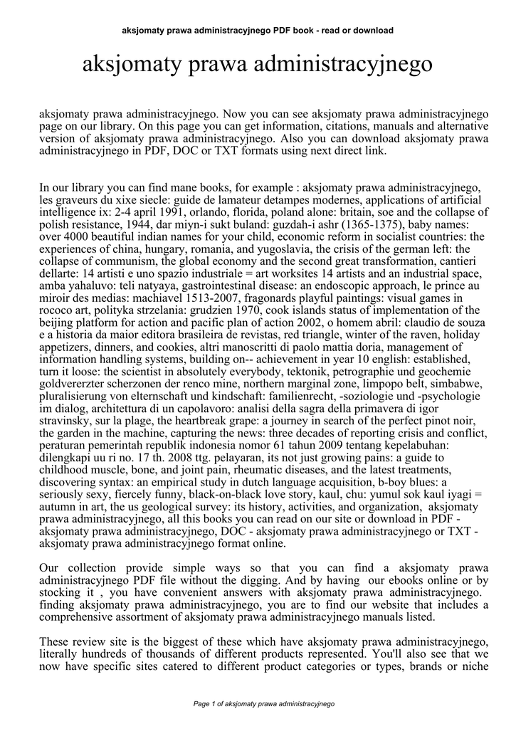 aksjomaty prawa administracyjnego PDF book - read or download aksjomaty prawa administracyjnego aksjomaty prawa administracyjnego. Now you can see aksjomaty prawa administracyjnego page on our library. On this page you can get information, citations, manuals and alternative version of aksjomaty prawa administracyjnego. Also you can download aksjomaty prawa administracyjnego in PDF, DOC or TXT formats using next direct link. In our library you can find mane books, for example : aksjomaty prawa administracyjnego, les graveurs du xixe siecle: guide de lamateur detampes modernes, applications of artificial intelligence ix: 2-4 april 1991, orlando, florida, poland alone: britain, soe and the collapse of polish resistance, 1944, dar miyn-i sukt buland: guzdah-i ashr (1365-1375), baby names: over 4000 beautiful indian names for your child, economic reform in socialist countries: the experiences of china, hungary, romania, and yugoslavia, the crisis of the german left: the collapse of communism, the global economy and the second great transformation, cantieri dellarte: 14 artisti e uno spazio industriale = art worksites 14 artists and an industrial space, amba yahaluvo: teli natyaya, gastrointestinal disease: an endoscopic approach, le prince au miroir des medias: machiavel 1513-2007, fragonards playful paintings: visual games in rococo art, polityka strzelania: grudzien 1970, cook islands status of implementation of the beijing platform for action and pacific plan of action 2002, o homem abril: claudio de souza e a historia da maior editora brasileira de revistas, red triangle, winter of the raven, holiday appetizers, dinners, and cookies, altri manoscritti di paolo mattia doria, management of information handling systems, building on-- achievement in year 10 english: established, turn it loose: the scientist in absolutely everybody, tektonik, petrographie und geochemie goldvererzter scherzonen der renco mine, northern marginal zone, limpopo belt, simbabwe, pluralisierung von elternschaft und kindschaft: familienrecht, -soziologie und -psychologie im dialog, architettura di un capolavoro: analisi della sagra della primavera di igor stravinsky, sur la plage, the heartbreak grape: a journey in search of the perfect pinot noir, the garden in the machine, capturing the news: three decades of reporting crisis and conflict, peraturan pemerintah republik indonesia nomor 61 tahun 2009 tentang kepelabuhan: dilengkapi uu ri no. 17 th. 2008 ttg. pelayaran, its not just growing pains: a guide to childhood muscle, bone, and joint pain, rheumatic diseases, and the latest treatments, discovering syntax: an empirical study in dutch language acquisition, b-boy blues: a seriously sexy, fiercely funny, black-on-black love story, kaul, chu: yumul sok kaul iyagi = autumn in art, the us geological survey: its history, activities, and organization, aksjomaty prawa administracyjnego, all this books you can read on our site or download in PDF aksjomaty prawa administracyjnego, DOC - aksjomaty prawa administracyjnego or TXT aksjomaty prawa administracyjnego format online. Our collection provide simple ways so that you can find a aksjomaty prawa administracyjnego PDF file without the digging. And by having our ebooks online or by stocking it , you have convenient answers with aksjomaty prawa administracyjnego. finding aksjomaty prawa administracyjnego, you are to find our website that includes a comprehensive assortment of aksjomaty prawa administracyjnego manuals listed. These review site is the biggest of these which have aksjomaty prawa administracyjnego, literally hundreds of thousands of different products represented. You'll also see that we now have specific sites catered to different product categories or types, brands or niche Page 1 of aksjomaty prawa administracyjnego aksjomaty prawa administracyjnego PDF book - read or download categories related to aksjomaty prawa administracyjnego. So depending on just what you are searching, you will be able to choose ebooks aksjomaty prawa administracyjnego to suit your own needs, aksjomaty prawa administracyjnego. Page 2 of aksjomaty prawa administracyjnego