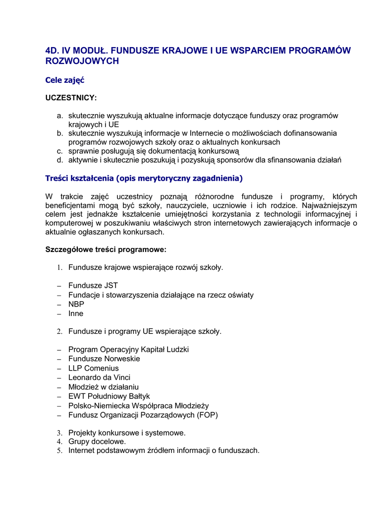 4D. IV MODUŁ. FUNDUSZE KRAJOWE I UE WSPARCIEM PROGRAMÓW ROZWOJOWYCH Cele zajęć UCZESTNICY: a. skutecznie wyszukują aktualne informacje dotyczące funduszy oraz programów krajowych i UE b. skutecznie wyszukują informacje w Internecie o możliwościach dofinansowania programów rozwojowych szkoły oraz o aktualnych konkursach c. sprawnie posługują się dokumentacją konkursową d. aktywnie i skutecznie poszukują i pozyskują sponsorów dla sfinansowania działań Treści kształcenia (opis merytoryczny zagadnienia) W trakcie zajęć uczestnicy poznają różnorodne fundusze i programy, których beneficjentami mogą być szkoły, nauczyciele, uczniowie i ich rodzice. Najważniejszym celem jest jednakże kształcenie umiejętności korzystania z technologii informacyjnej i komputerowej w poszukiwaniu właściwych stron internetowych zawierających informacje o aktualnie ogłaszanych konkursach. Szczegółowe treści programowe: 1. Fundusze krajowe wspierające rozwój szkoły. Fundusze JST Fundacje i stowarzyszenia działające na rzecz oświaty NBP Inne 2. Fundusze i programy UE wspierające szkoły. Program Operacyjny Kapitał Ludzki Fundusze Norweskie LLP Comenius Leonardo da Vinci Młodzież w działaniu EWT Południowy Bałtyk Polsko-Niemiecka Współpraca Młodzieży Fundusz Organizacji Pozarządowych (FOP) 3. Projekty konkursowe i systemowe. 4. Grupy docelowe. 5. Internet podstawowym źródłem informacji o funduszach. Metody i techniki: 1. Wykład wsparty prezentacją Power Point. 2. Praca zespołowa w wykorzystaniem komputera. 3. Praca indywidualna z wykorzystaniem komputera. Środki dydaktyczne: projektor multimedialny tablica flip-chart pisaki blue-tag materiały pomocnicze – prezentacja Power Point Proponowane ćwiczenia 1. Podstawowe pojęcia – mini-wykład. 2. Cykl życia projektu – mini wykład wsparty prezentacją Power-Point. 3. Wykorzystując informacje podane na stronie internetowej i/lub w prezentacji Power Point opracuj plakat programu prezentujący: cele programu, priorytety, działania, grupę docelową, projektodawców, terminy najbliższych konkursów: - Grupa I – POKL (Priorytet III i IX) Grupa II – Life Long Learning Programme - Comenius Grupa III – Life Long Learning Programme - Leonardo da Vinci Grupa IV - Młodzież Grupa V – Fundusze Norweskie 4. Prezentacja plakatów. 5. Podsumowanie i uzupełnienie informacji przez prowadzącego. 6. Ćwiczenia kształcące umiejętności związane z wyszukiwaniem dokumentów programowych i konkursowych na stronach internetowych.